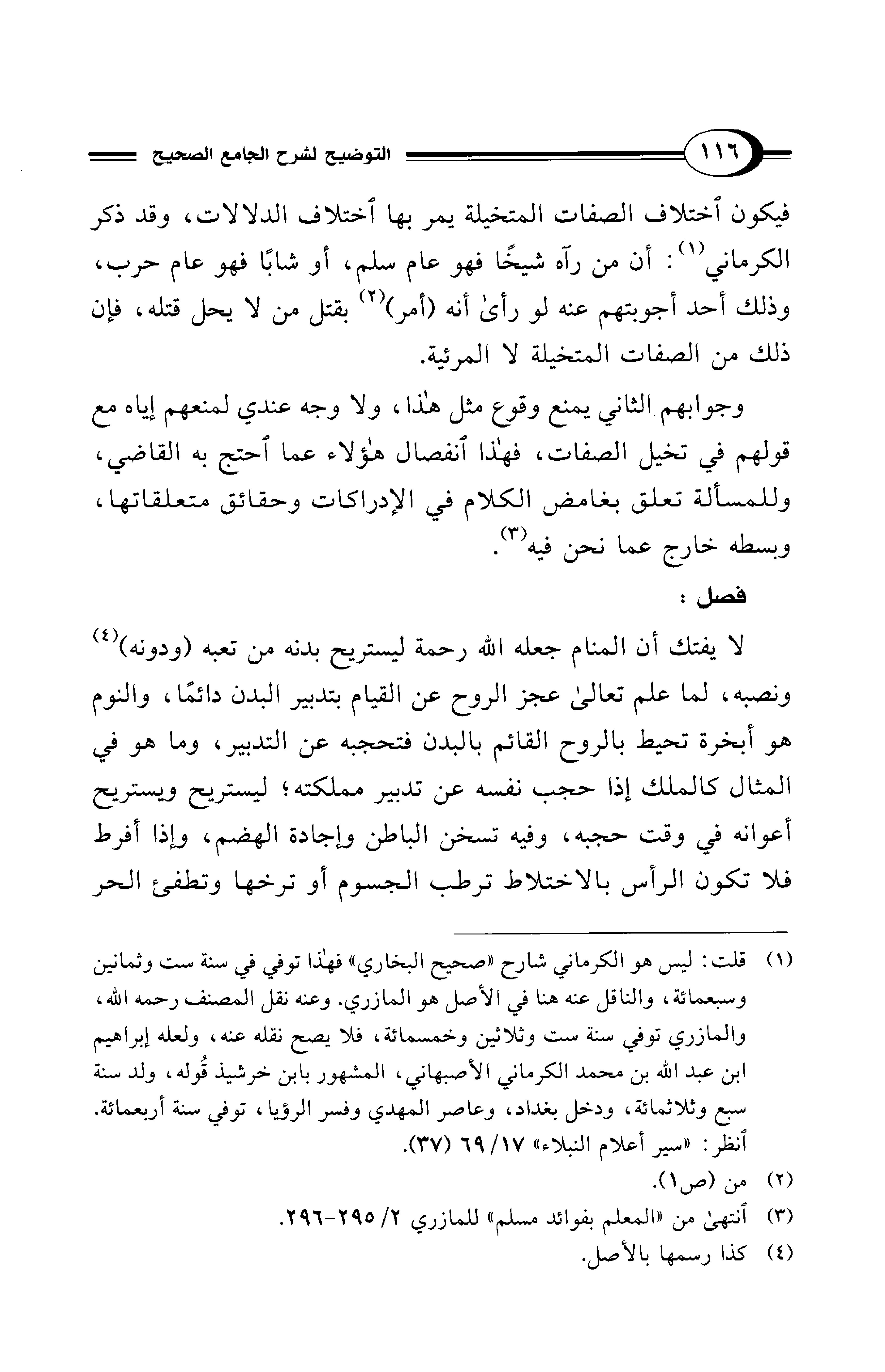 (¬1) قلت: ليس هو الكرماني شارح "صحيح البخاري" فهذا توفي في سنة ست وثمانين وسبعمائة، والناقل عنه هنا في الأصل هو المازري. وعنه نقل المصنف -رحمه الله-، والمازري توفي سنة ست وثلاثين وخمسمائة، فلا يصح نقله عنه، ولعله إبراهيم ابن عبد الله بن محمد الكرماني الأصبهاني، المشهور بابن خرشيذ قُوله، ولد سنة سبع وثلاثمائة، ودخل بغداد، وعاصر المهدي وفسر الرؤيا، توفي سنة أربعمائة. انظر: "سير أعلام النبلاء" 17/ 69 (37).