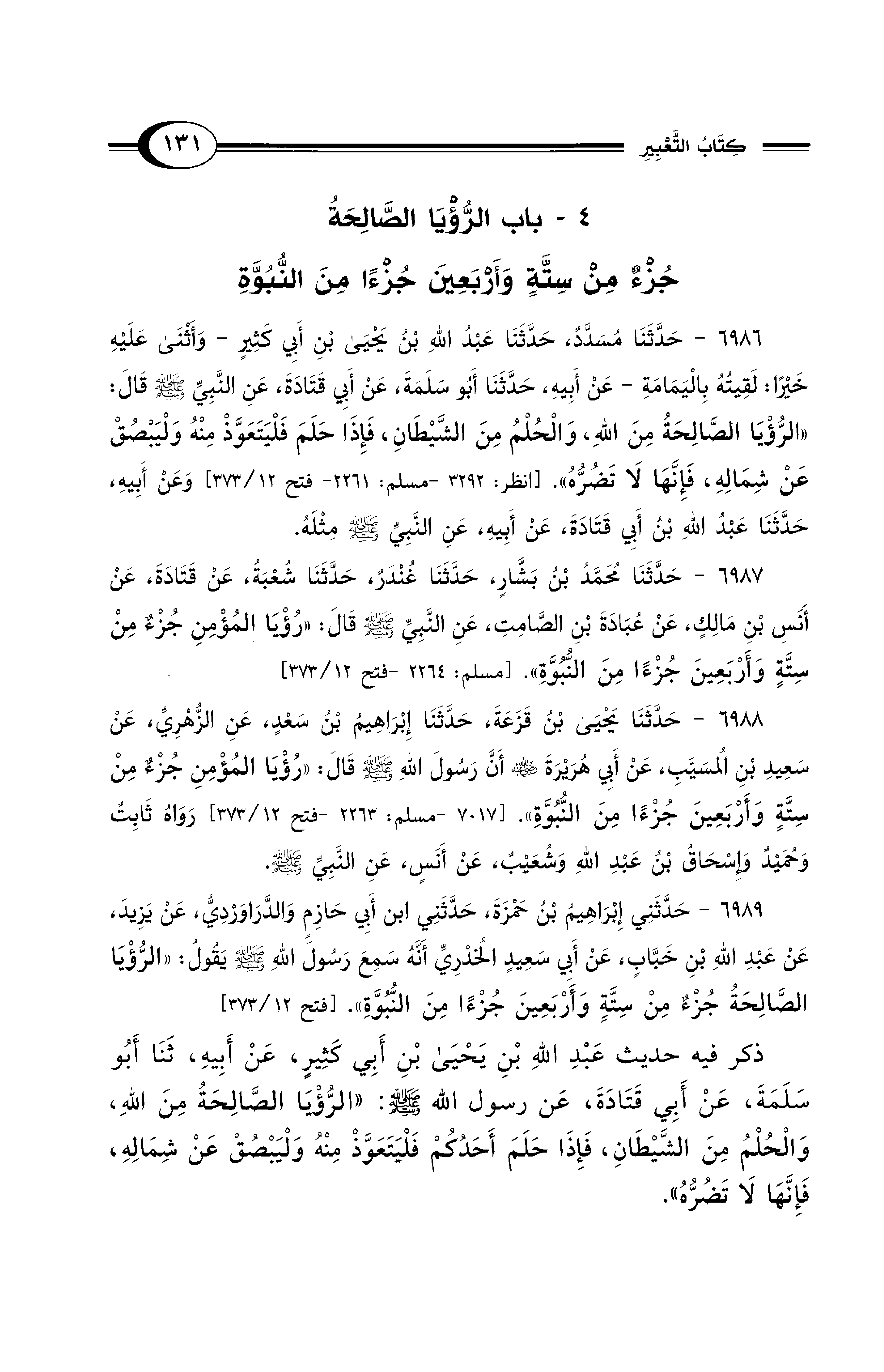 سِتَّةٍ وَأَرْبَعِينَ جُزْءًا مِنَ النُّبُوَّةِ». [7017 - مسلم: 2263 - فتح 12/ 373] رَوَاهُ ثَابِتٌ وَحُمَيْدٌ وَإِسْحَاقُ بْنُ عَبْدِ اللهِ وَشُعَيْبٌ عَنْ أَنَسٍ عَنِ النَّبِيِّ - صلى الله عليه وسلم -.