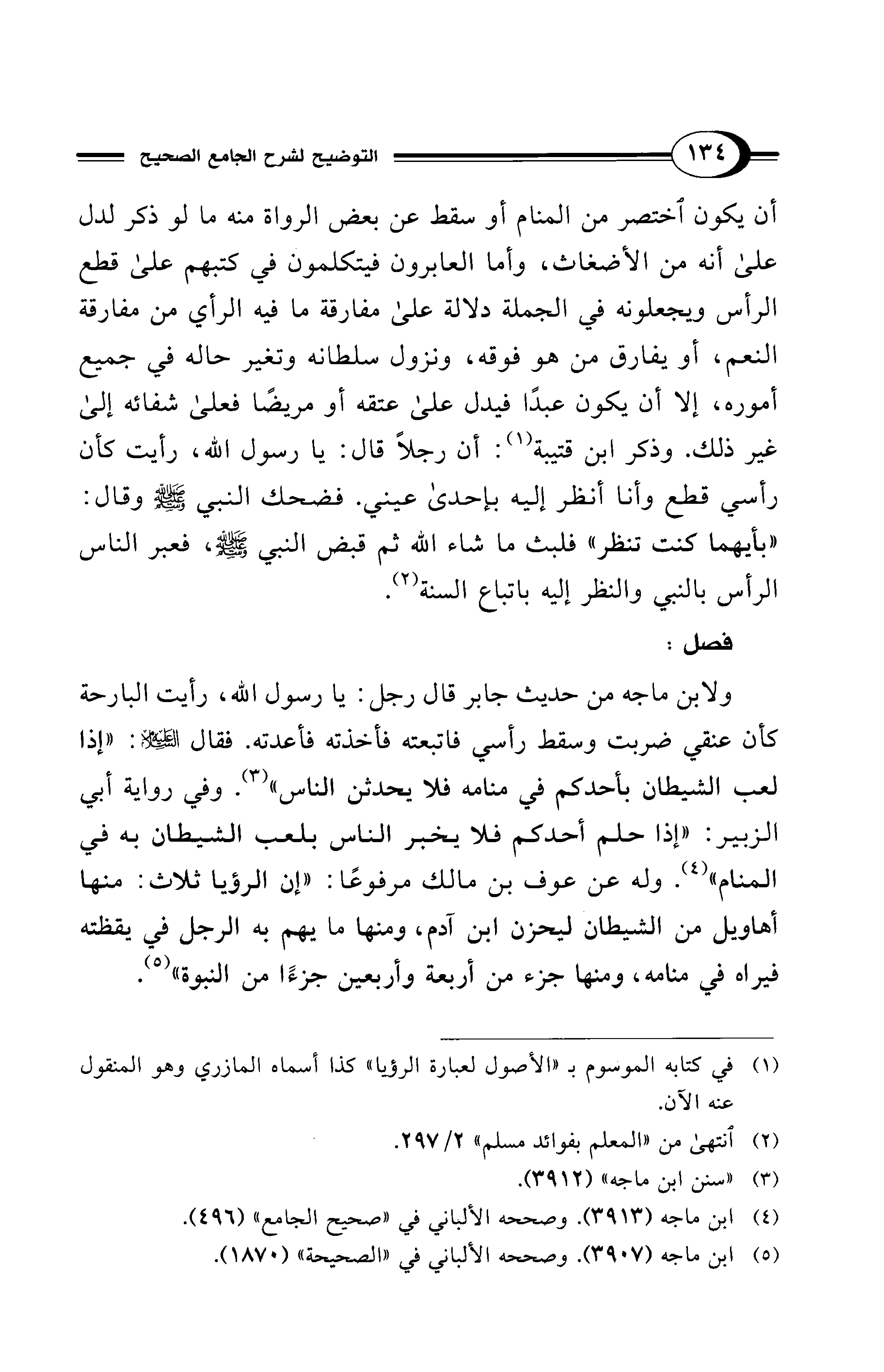 أن يكون اختصر من المنام أو سقط عن بعض الرواة منه ما لو ذكر لدل على أنه من الأضغاث، وأما العابرون فيتكلمون في كتبهم على قطع الرأس ويجعلونه في الجملة دلالة على مفارقة ما فيه الرأي من مفارقة النعم، أو يفارق من هو فوقه، ونزول سلطانه وتغير حاله في جميع أموره، إلا أن يكون عبدًا فيدل على عتقه أو مريضًا فعلى شفائه إلى غير ذلك. وذكر ابن قتيبة (¬1): أن رجلاً قال: يا رسول الله، رأيت كأن رأسي قطع وأنا انظر إليه بإحدى عيني. فضحك النبي - صلى الله عليه وسلم -وقال: "بأيهما كنت تنظر" فلبث ما شاء الله ثم قبض النبي - صلى الله عليه وسلم -، فعبر الناس الرأس بالنبي والنظر إليه باتباع السنة (¬2).