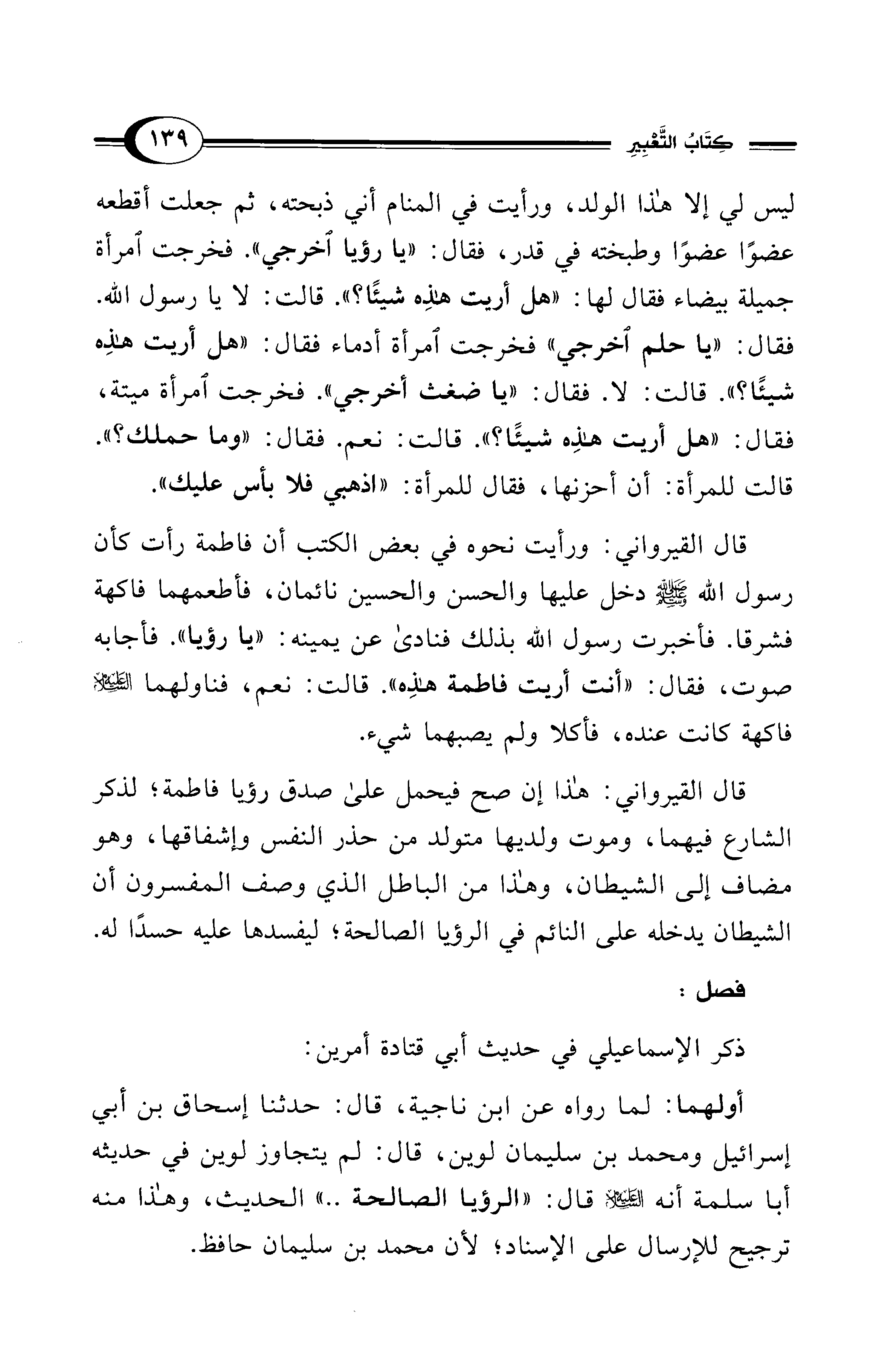 قال القيرواني: هذا إن صح فيحمل على صدق رؤيا فاطمة؛ لذكر الشارع فيهما، وموت ولديها متولد من حذر النفس وإشفاقها، وهو مضاف إلى الشيطان، وهذا من الباطل الذي وصف المفسرون أن الشيطان يدخله على النائم في الرؤيا الصالحة؛ ليفسدها عليه حسدًا له.