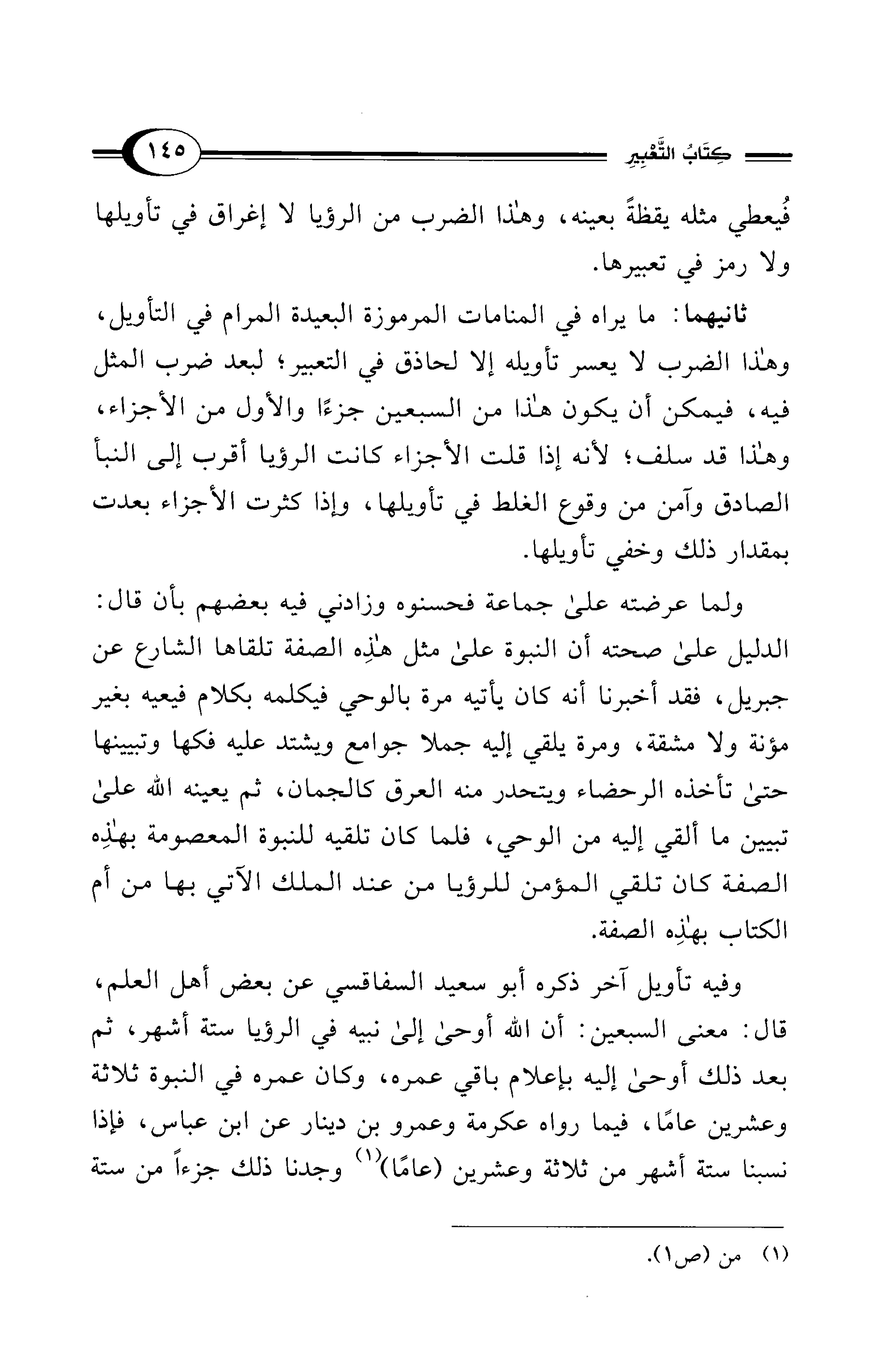 ثانيهما: ما يراه في المنامات المرموزة البعيدة المرام في التأويل، وهذا الضرب لا يعسر تأويله إلا لحاذق في التعبير؛ لبعد ضرب المثل فيه، فيمكن أن يكون هذا من السبعين جزءًا والأول من الأجزاء، وهذا قد سلف؛ لأنه إذا قلت الأجزاء كانت الرؤيا أقرب إلى النبأ الصادق وآمن من وقوع الغلط في تأويلها، وإذا كثرت الأجزاء بعدت بمقدار ذلك وخفي تأويلها.
