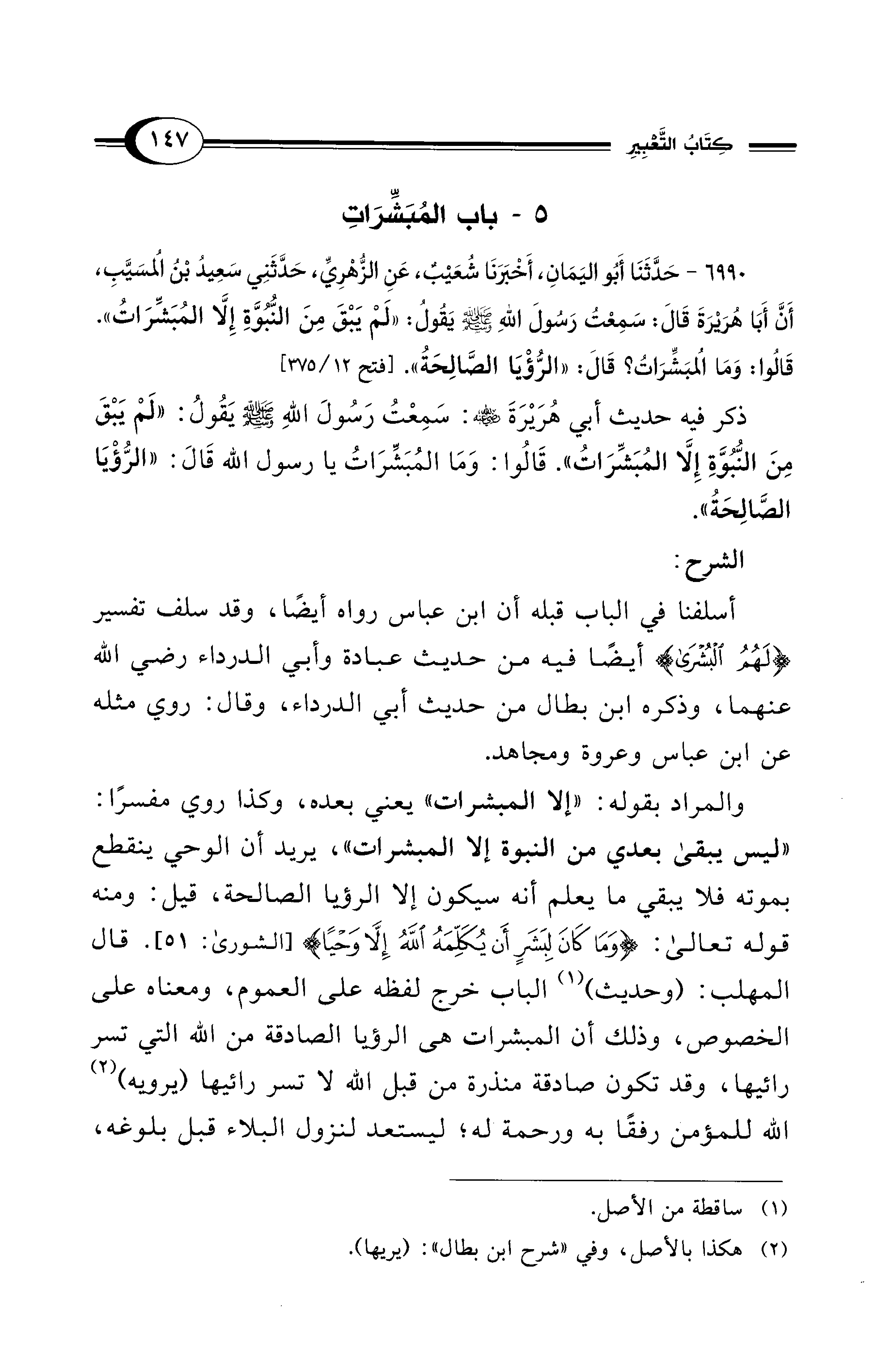 ذكر فيه حديث أبي هُرَيْرَةَ - رضي الله عنه -: سمعت رَسُولَ الِله - صلى الله عليه وسلم - يَقُولُ: "لَمْ يبْقَ مِنَ الُنُّبُوَّةِ إِلاَّ المُبَشَّرَاتُ".قَالُوا: وَمَا المُبَشَّرَاتُ يا رسول الله قَالَ: "الرُّؤْيَا الصَّالِحَةُ".