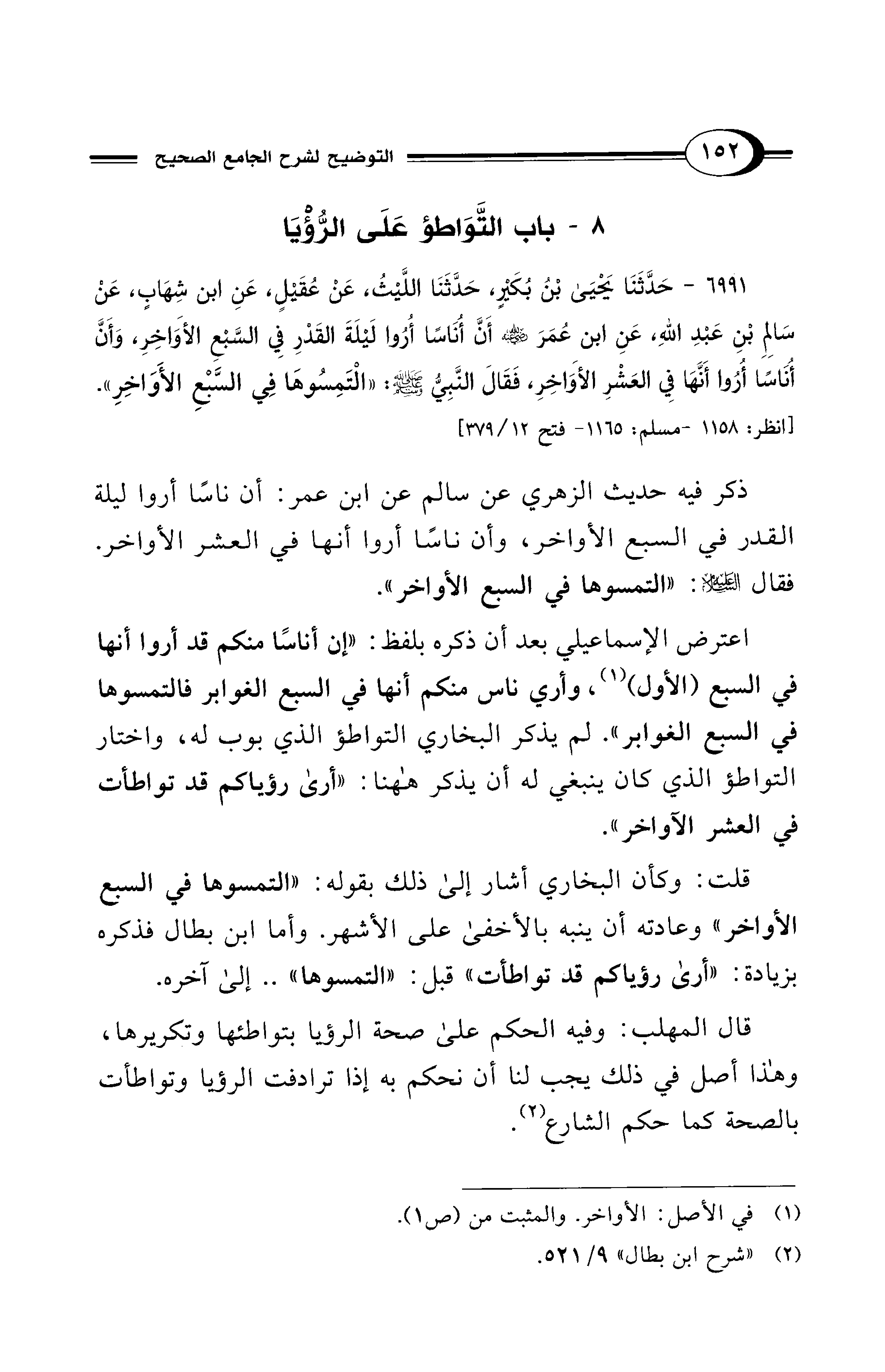 قلت: وكأن البخاري أشار إلى ذلك بقوله: "التمسوها في السبع الأواخر"وعادته أن ينبه بالأخفى على الأشهر. وأما ابن بطال فذكره بزيادة: "أرى رؤياكم قد تواطأت" قبل: "التمسوها" .. إلى آخره.