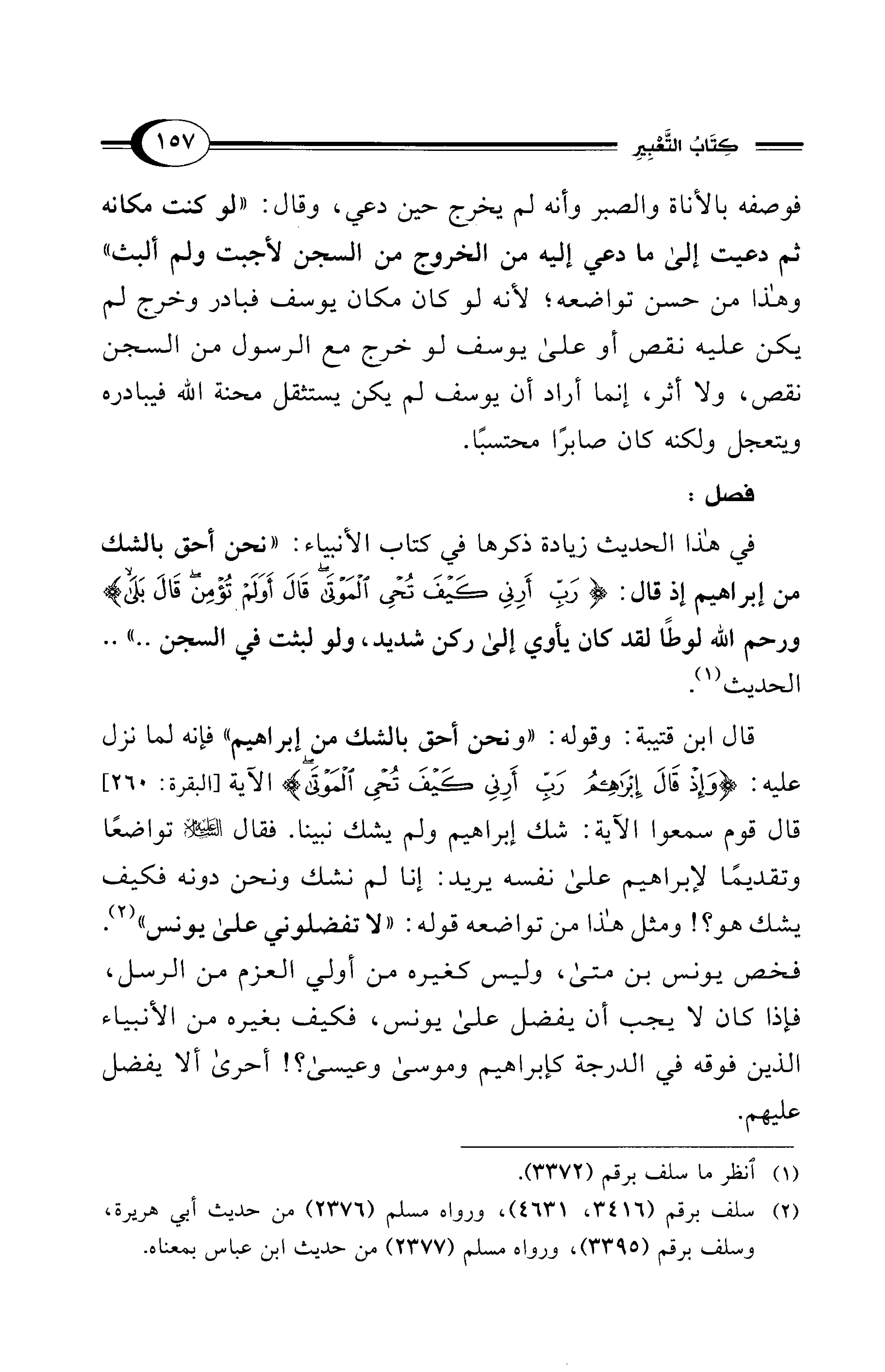 في هذا الحديث زيادة ذكرها في كتاب الأنبياء: "نحن أحق بالشك من إبراهيم إذ قال: {رَبِّ أَرِنِي كَيْفَ تُحْيِ الْمَوْتَى قَالَ أَوَلَمْ تُؤْمِنْ قَالَ بَلَى} ورحم الله لوطًا لقد كان يأوي إلى ركن شديد، ولو لبثت في السجن .. " .. الحديث (¬1).