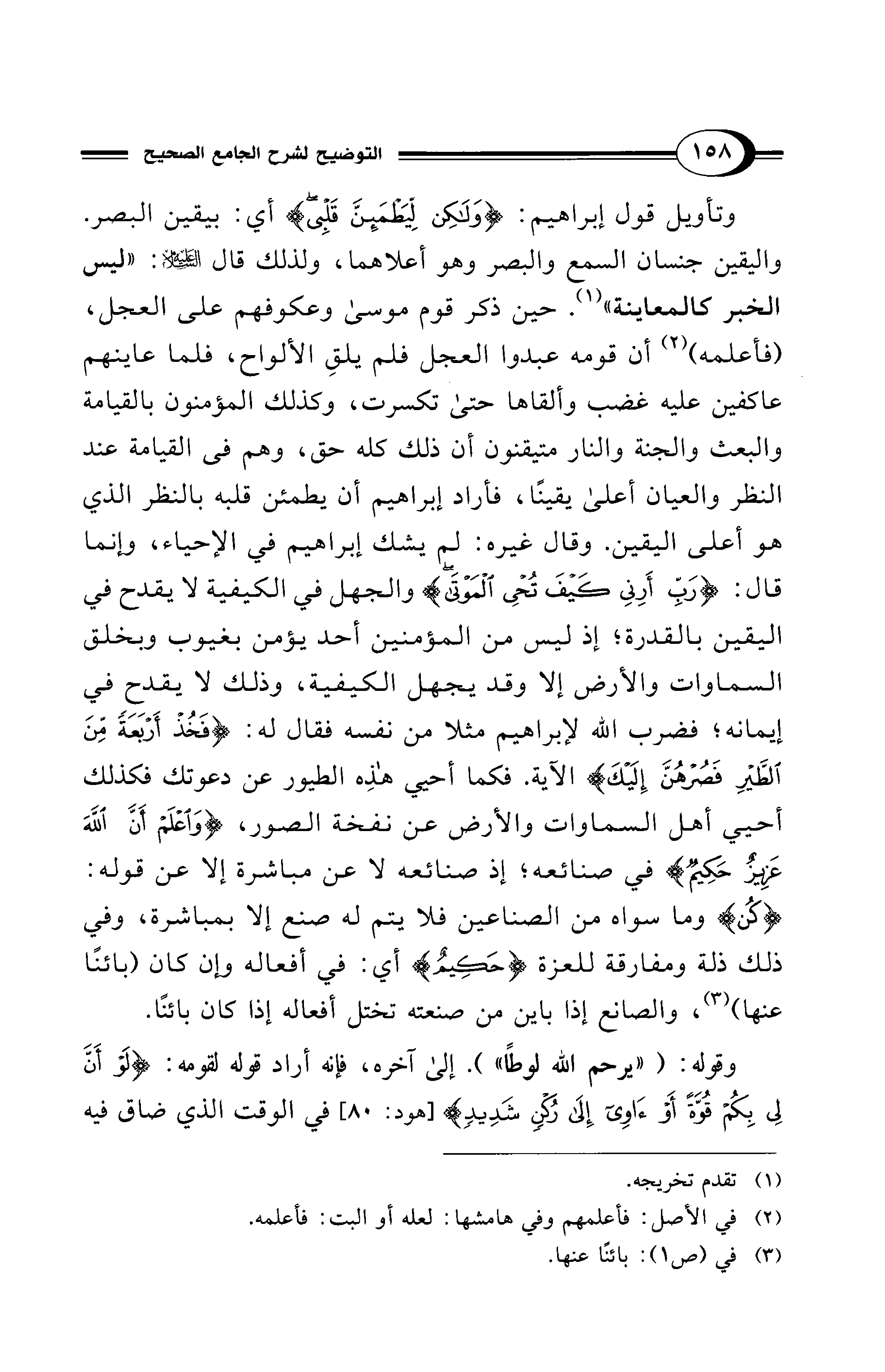 وتأويل قول إبراهيم: {وَلَكِنْ لِيَطْمَئِنَّ قَلْبِي} أي: بيقين البصر. واليقين جنسان السمع والبصر وهو أعلاهما، ولذلك قال - عليه السلام -: "ليس الخبر كالمعاينة" (¬1). حين ذكر قوم موسى وعكوفهم على العجل، (فأعلمه) (¬2) أن قومه عبدوا العجل فلم يلقِ الألواح، فلما عاينهم عاكفين عليه غضب وألقاها حتى تكسرت، وكذلك المؤمنون بالقيامة والبعث والجنة والنار متيقنون أن ذلك كله حق، وهم في القيامة عند النظر والعيان أعلى يقينًا، فأراد إبراهيم أن يطمئن قلبه بالنظر الذي هو أعلى اليقين. وقال غيره: لم يشك إبراهيم في الإحياء، وإنما قال: {رَبِّ أَرِنِي كَيْفَ تُحْيِ الْمَوْتَى} والجهل في الكيفية لا يقدح في اليقين بالقدرة، إذ ليس من المؤمنين أحد يؤمن بغيوب وبخلق السماوات والأرض إلا وقد يجهل الكيفية، وذلك لا يقدح في إيمانه، فضرب الله لإبراهيم مثلا من نفسه فقال له: {فَخُذْ أَرْبَعَةً مِنَ الطَّيْرِ فَصُرْهُنَّ إِلَيْكَ} الآية. فكما أحيي هذِه الطيور عن دعوتك فكذلك أحيي أهل السماوات والأرض عن نفخة الصور، {وَاعْلَمْ أَنَّ اللهَ عَزِيزٌ حَكِيمٌ} في صنائعه، إذ صنائعه لا عن مباشرة إلا عن قوله: {كُن} وما سواه من الصناعين فلا يتم له صنع إلا بمباشرة، وفي ذلك ذلة ومفارقة للعزة {حَكِيمٌ} أي: في أفعاله وإن كان (بائنًا عنها) (¬3)، والصانع إذا باين من صنعته تختل أفعاله إذا كان بائنًا.
