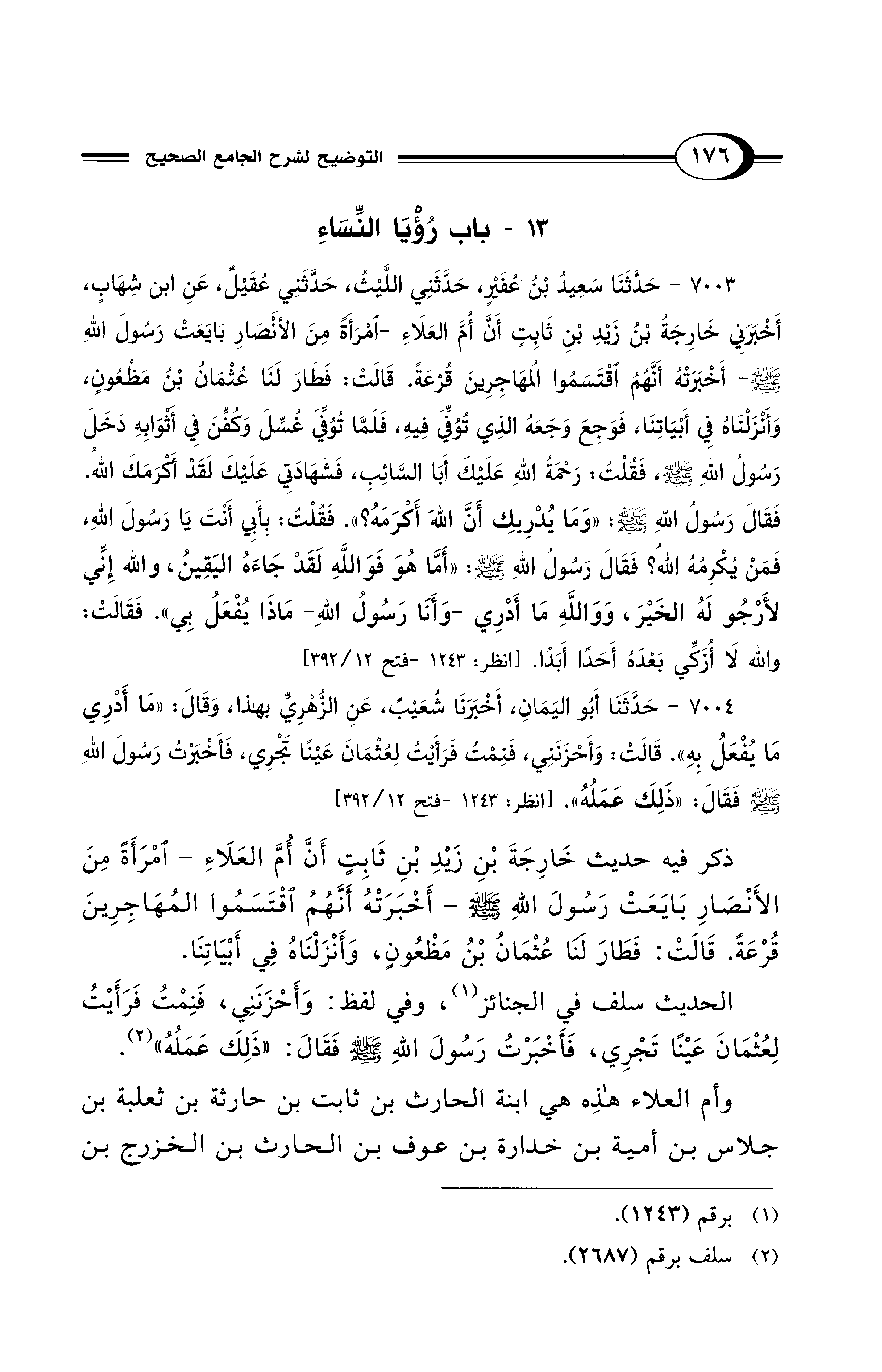 7003 - حَدَّثَنَا سَعِيدُ بْنُ عُفَيْرٍ، حَدَّثَنِي اللَّيْثُ، حَدَّثَنِي عُقَيْلٌ، عَنِ ابْنِ شِهَابٍ، أَخْبَرَنِي خَارِجَةُ بْنُ زَيْدِ بْنِ ثَابِتٍ أَنَّ أُمَّ الْعَلاَءِ -امْرَأَةً مِنَ الأَنْصَارِ بَايَعَتْ رَسُولَ اللهِ - صلى الله عليه وسلم - أَخْبَرَتْهُ أَنَّهُمُ اقْتَسَمُوا المُهَاجِرِينَ قُرْعَةً. قَالَتْ: فَطَارَ لَنَا عُثْمَانُ بْنُ مَظْعُونٍ، وَأَنْزَلْنَاهُ فِي أَبْيَاتِنَا، فَوَجِعَ وَجَعَهُ الَّذِي تُوُفِّيَ فِيهِ، فَلَمَّا تُوُفِّيَ غُسِّلَ وَكُفِّنَ فِي أَثْوَابِهِ دَخَلَ رَسُولُ اللهِ - صلى الله عليه وسلم -, فَقُلْتُ: رَحْمَةُ اللهِ عَلَيْكَ أَبَا السَّائِبِ، فَشَهَادَتِي عَلَيْكَ لَقَدْ أَكْرَمَكَ اللهُ. فَقَالَ رَسُولُ اللهِ - صلى الله عليه وسلم -: «وَمَا يُدْرِيكِ أَنَّ اللهَ أَكْرَمَهُ؟». فَقُلْتُ: بِأَبِي أَنْتَ يَا رَسُولَ اللهِ، فَمَنْ يُكْرِمُهُ اللهُ؟ فَقَالَ رَسُولُ اللهِ - صلى الله عليه وسلم -: «أَمَّا هُوَ فَوَاللهِ لَقَدْ جَاءَهُ اليَقِينُ، وَاللهِ إِنِّي لأَرْجُو لَهُ الْخَيْرَ، وَوَاللَّهِ مَا أَدْرِي -وَأَنَا رَسُولُ اللهِ- مَاذَا يُفْعَلُ بِي». فَقَالَتْ: وَاللهِ لاَ أُزَكِّي بَعْدَهُ أَحَدًا أَبَدًا. [انظر: 1243 - فتح 12/ 392]