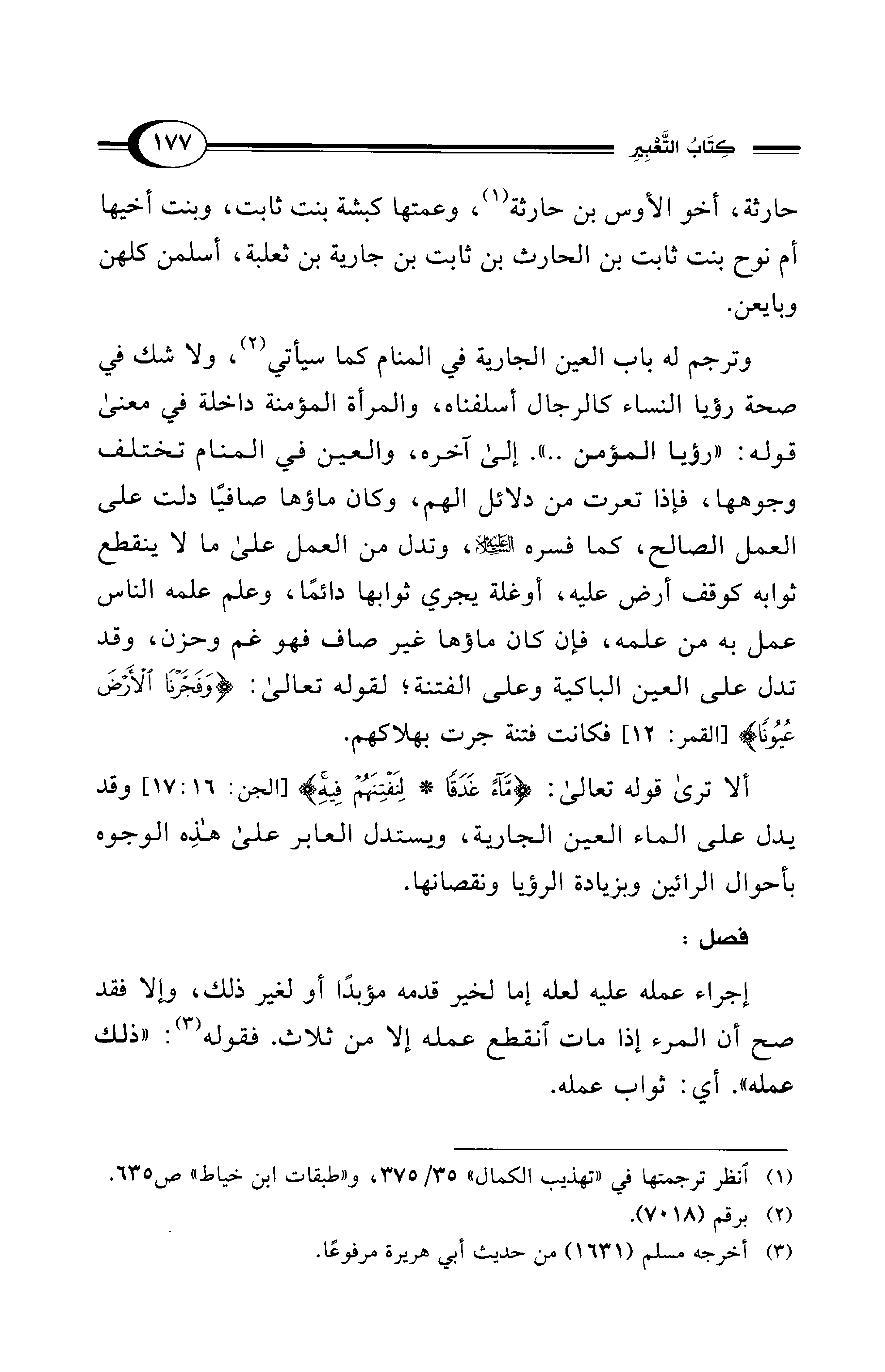 وترجم له باب العين الجارية في المنام كما سيأتي (¬2)، ولا شك في صحة رؤيا النساء كالرجال أسلفناه، والمرأة المؤمنة داخلة في معنى قوله: "رؤيا المؤمن .. ". إلى آخره، والعين في المنام تختلف وجوهها، فإذا تعرت من دلائل الهم، وكان ماؤها صافيًا دلت على العمل الصالح، كما فسره - عليه السلام -، وتدل من العمل على ما لا ينقطع ثوابه كوقف أرض عليه، أو غلة يجري ثوابها دائمًا، وعلم علمه الناس عمل به من علمه، فإن كان ماؤها غير صاف فهو غم وحزن، وقد تدل على العين الباكية وعلى الفتنة؛ لقوله تعالى: {وَفَجَّرْنَا الْأَرْضَ عُيُونًا} [القمر: 12] فكانت فتنة جرت بهلاكهم.