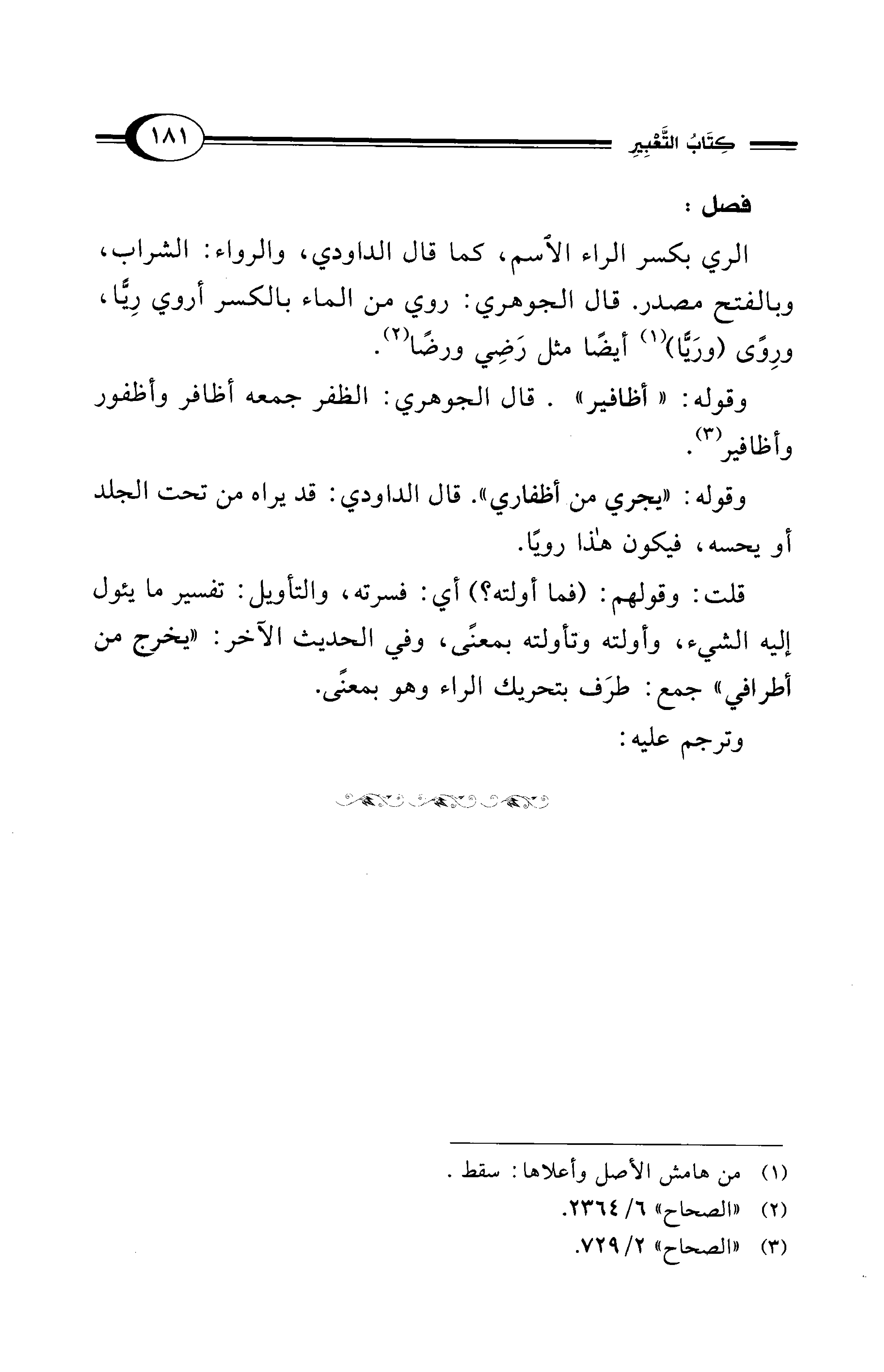 الري بكسر الراء الاسم، كما قال الداودي، والرواء: الشراب، وبالفتح مصدر. قال الجوهري: روي من الماء بالكسر أروي ريًّا، ورِوًى (ورَيًّا) (¬1) أيضًا مثل رَضِي ورضًا (¬2).