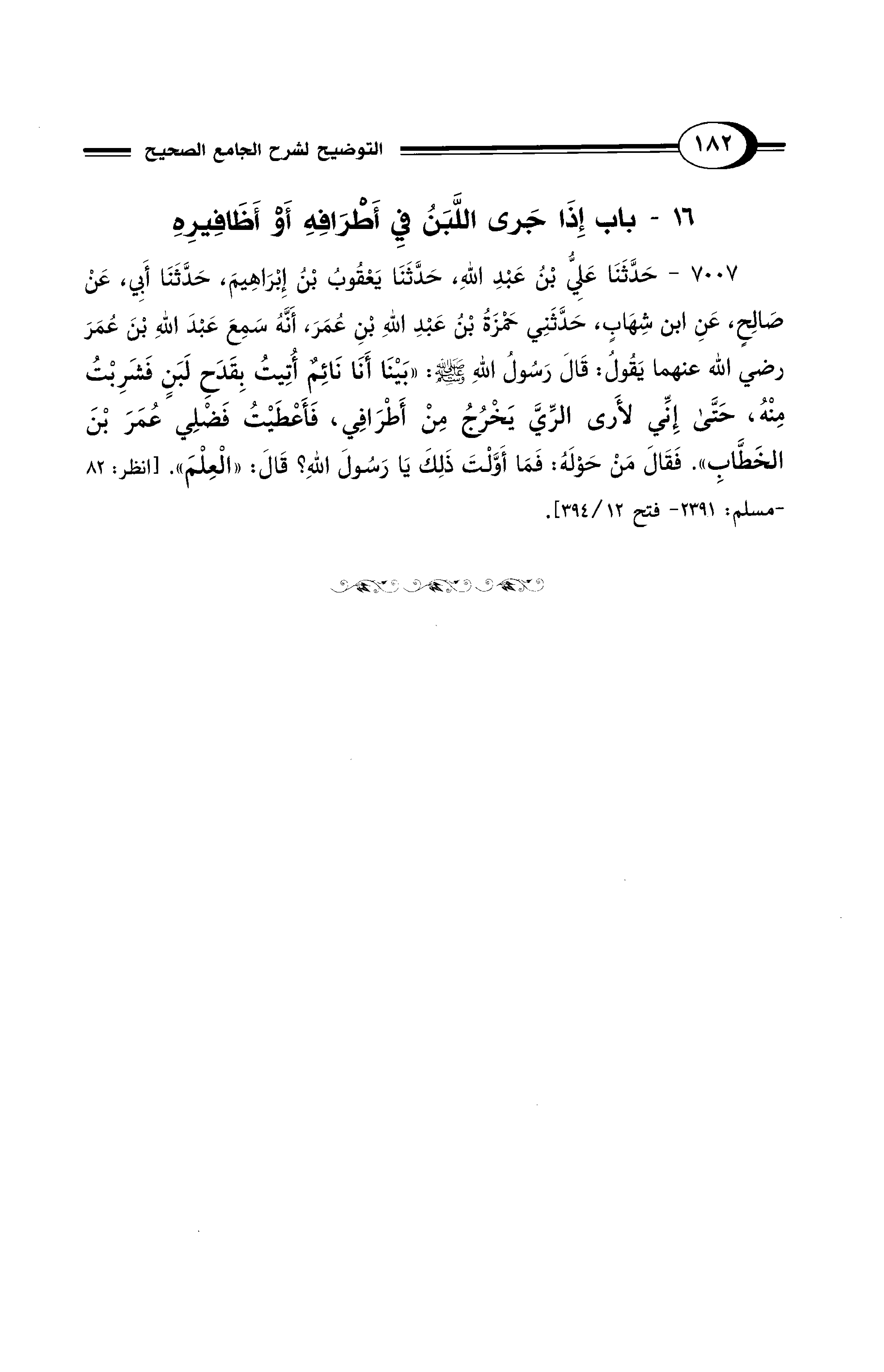 7007 - حَدَّثَنَا عَلِيُّ بْنُ عَبْدِ اللهِ، حَدَّثَنَا يَعْقُوبُ بْنُ إِبْرَاهِيمَ، حَدَّثَنَا أَبِي، عَنْ صَالِحٍ، عَنِ ابْنِ شِهَابٍ، حَدَّثَنِي حَمْزَةُ بْنُ عَبْدِ اللهِ بْنِ عُمَرَ، أَنَّهُ سَمِعَ عَبْدَ اللهِ بْنَ عُمَرَ - رضي الله عنهما - يَقُولُ: قَالَ رَسُولُ اللهِ - صلى الله عليه وسلم -: «بَيْنَا أَنَا نَائِمٌ أُتِيتُ بِقَدَحِ لَبَنٍ فَشَرِبْتُ مِنْهُ، حَتَّى إِنِّي لأَرَى الرِّيَّ يَخْرُجُ مِنْ أَطْرَافِي، فَأَعْطَيْتُ فَضْلِي عُمَرَ بْنَ الخَطَّابِ». فَقَالَ مَنْ حَوْلَهُ: فَمَا أَوَّلْتَ ذَلِكَ يَا رَسُولَ اللهِ؟ قَالَ: «الْعِلْمَ». [انظر: 82 - مسلم: 2391 - فتح 12/ 394].