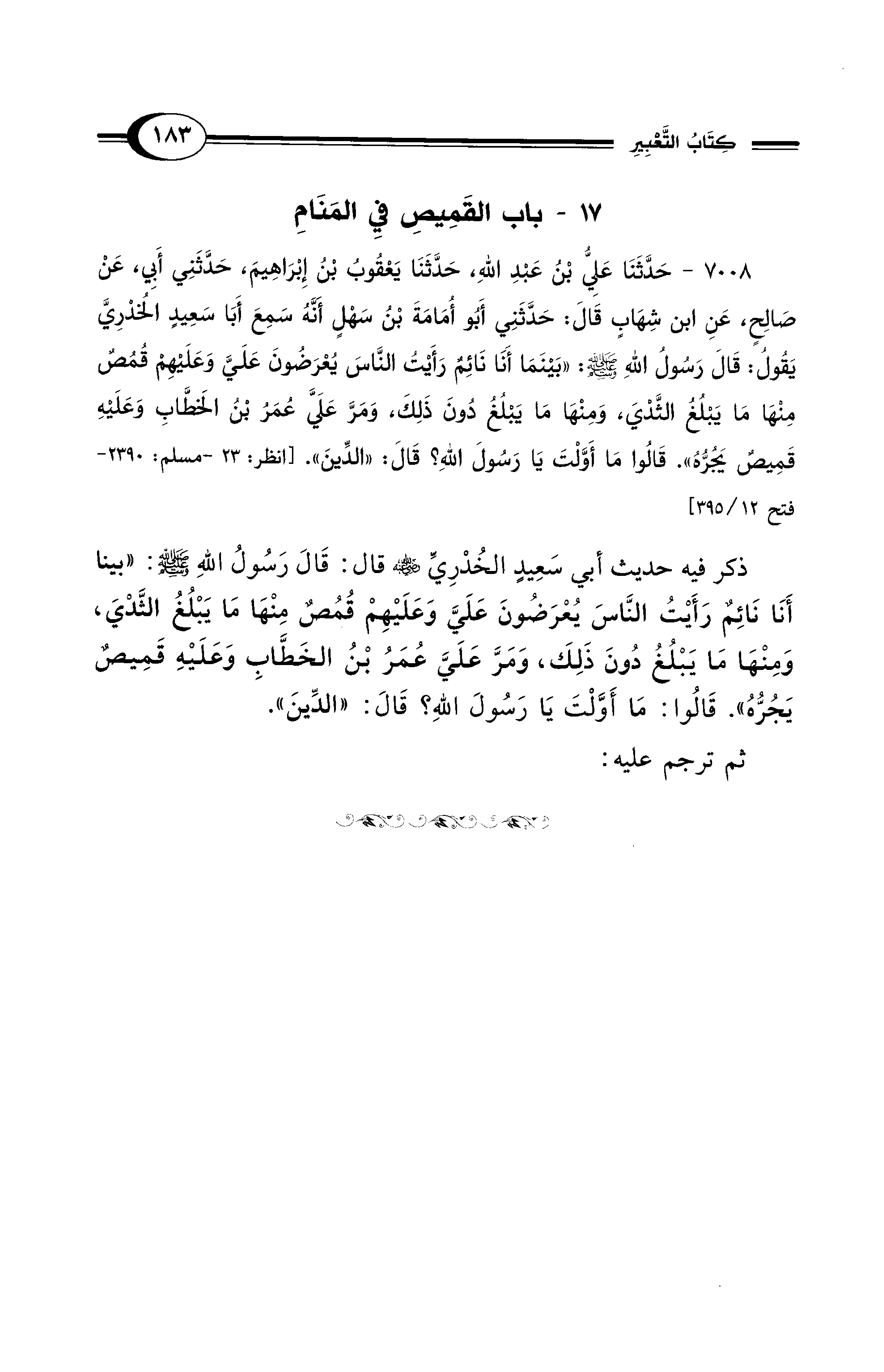 ذكر فيه حديث أبي سَعِيدٍ الخُدْريَ - رضي الله عنه - قال: قَالَ رَسُولُ اللهِ - صلى الله عليه وسلم -: "بينا أَنَا نَائِمٌ رَأَيْتُ النَّاسَ يُعْرَضُونَ عَلَيَّ وَعَلَيْهِمْ قُمصٌ مِنْهَا مَا يَبْلُغُ الثَّدْيَ، وَمِنْهَا مَا يَبْلُغُ دُونَ ذَلِكَ، وَمَرَّ عَلَيَّ عُمَرُ بْنُ الخَطَّابِ وَعَلَيْهِ قَمِيصٌ يَجُرُّهُ". قَالُوا: مَا أَوَّلْتَ يَا رَسُولَ اللهِ؟ قَالَ: "الدِّينَ".