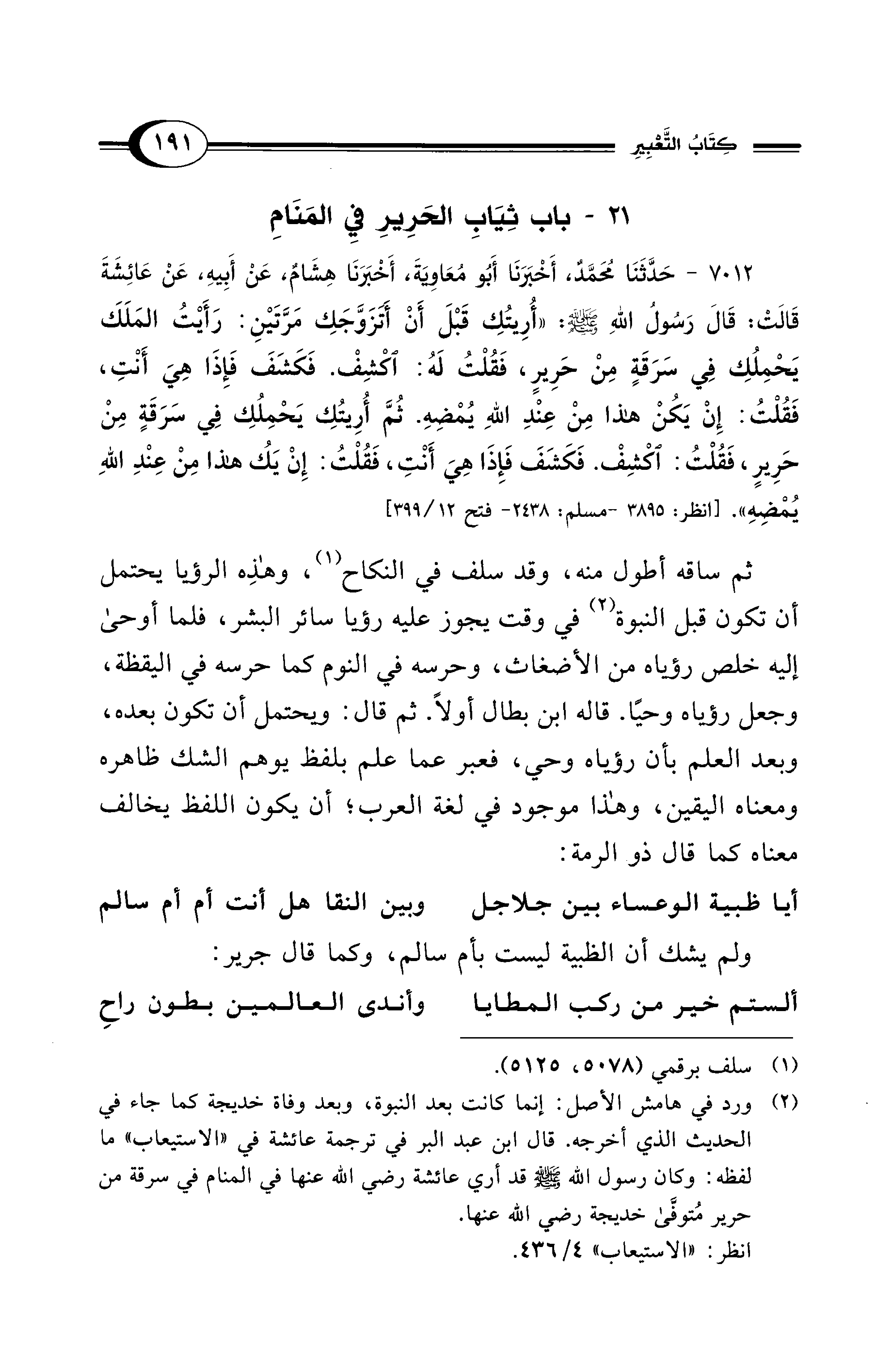 (¬2) ورد في هامش الأصل: إنما كانت بعد النبوة، وبعد وفاة خديجة كما جاء في الحديث الذي أخرجه. قال ابن عبد البر في ترجمة عائشة في "الاستيعاب" ما لفظه: وكان رسول الله - صلى الله عليه وسلم - قد أري عائشة - رضي الله عنها - في المنام في سرقة من حرير مُتوفَّى خديجة - رضي الله عنها -.