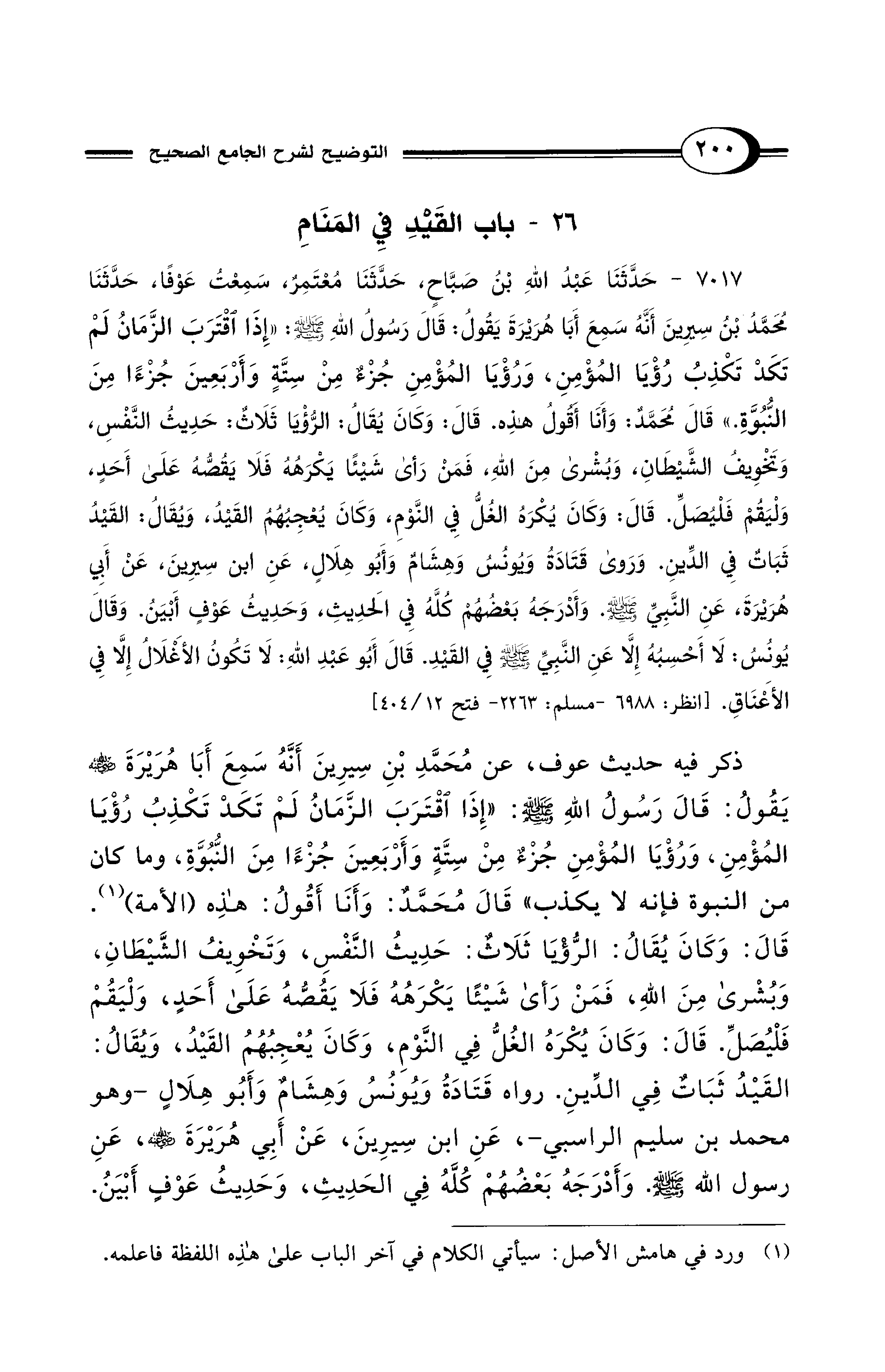 7017 - حَدَّثَنَا عَبْدُ اللهِ بْنُ صَبَّاحٍ، حَدَّثَنَا مُعْتَمِرٌ، سَمِعْتُ عَوْفًا، حَدَّثَنَا مُحَمَّدُ بْنُ سِيرِينَ أَنَّهُ سَمِعَ أَبَا هُرَيْرَةَ يَقُولُ: قَالَ رَسُولُ اللهِ - صلى الله عليه وسلم -: «إِذَا اقْتَرَبَ الزَّمَانُ لَمْ تَكَدْ تَكْذِبُ رُؤْيَا الْمُؤْمِنِ، وَرُؤْيَا المُؤْمِنِ جُزْءٌ مِنْ سِتَّةٍ وَأَرْبَعِينَ جُزْءًا مِنَ النُّبُوَّةِ.» قَالَ مُحَمَّدٌ: وَأَنَا أَقُولُ هَذِهِ قَالَ: وَكَانَ يُقَالُ: الرُّؤْيَا ثَلاَثٌ: حَدِيثُ النَّفْسِ، وَتَخْوِيفُ الشَّيْطَانِ، وَبُشْرَى مِنَ اللهِ، فَمَنْ رَأَى شَيْئًا يَكْرَهُهُ فَلاَ يَقُصُّهُ عَلَى أَحَدٍ، وَلْيَقُمْ فَلْيُصَلِّ. قَالَ: وَكَانَ يُكْرَهُ الْغُلُّ فِي النَّوْمِ، وَكَانَ يُعْجِبُهُمُ القَيْدُ، وَيُقَالُ: القَيْدُ