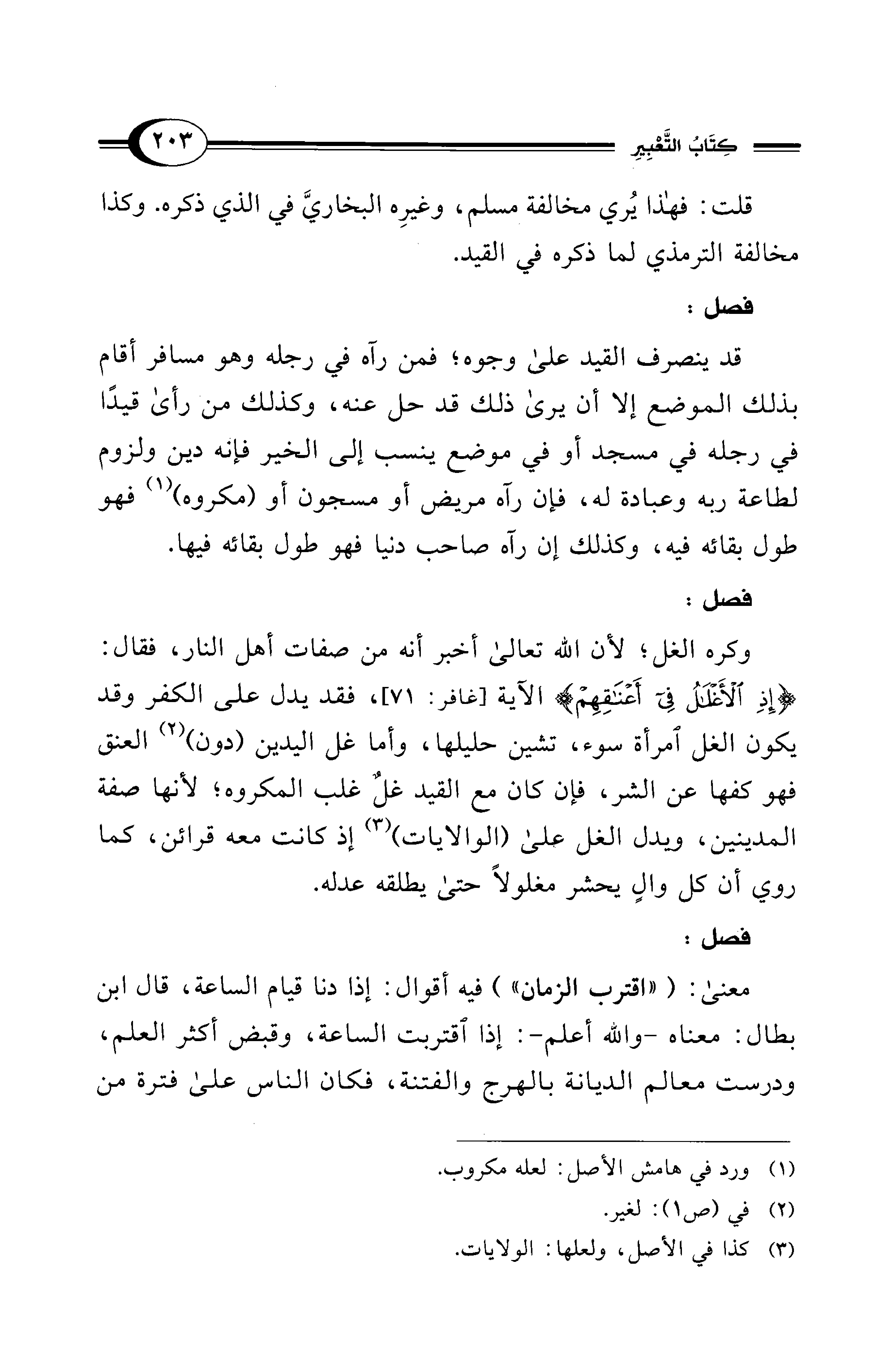 وكره الغل؛ لأن الله تعالى أخبر أنه من صفات أهل النار، فقال: {إِذِ الْأَغْلَالُ فِي أَعْنَاقِهِمْ} الآية [غافر: 71]، فقد يدل على الكفر وقد يكون الغل امرأة سوء، تشين حليلها، وأما غل اليدين (دون) (¬2) العنق فهو كفها عن الشر، فإن كان مع القيد غلٌ غلب المكروه؛ لأنها صفة المدينين، ويدلس الغل علي (الوالايات) (¬3) إذ كانت معه قرائن، كما روي أن كل وال يحشر مغلولاً حتى يطلقه عدله.