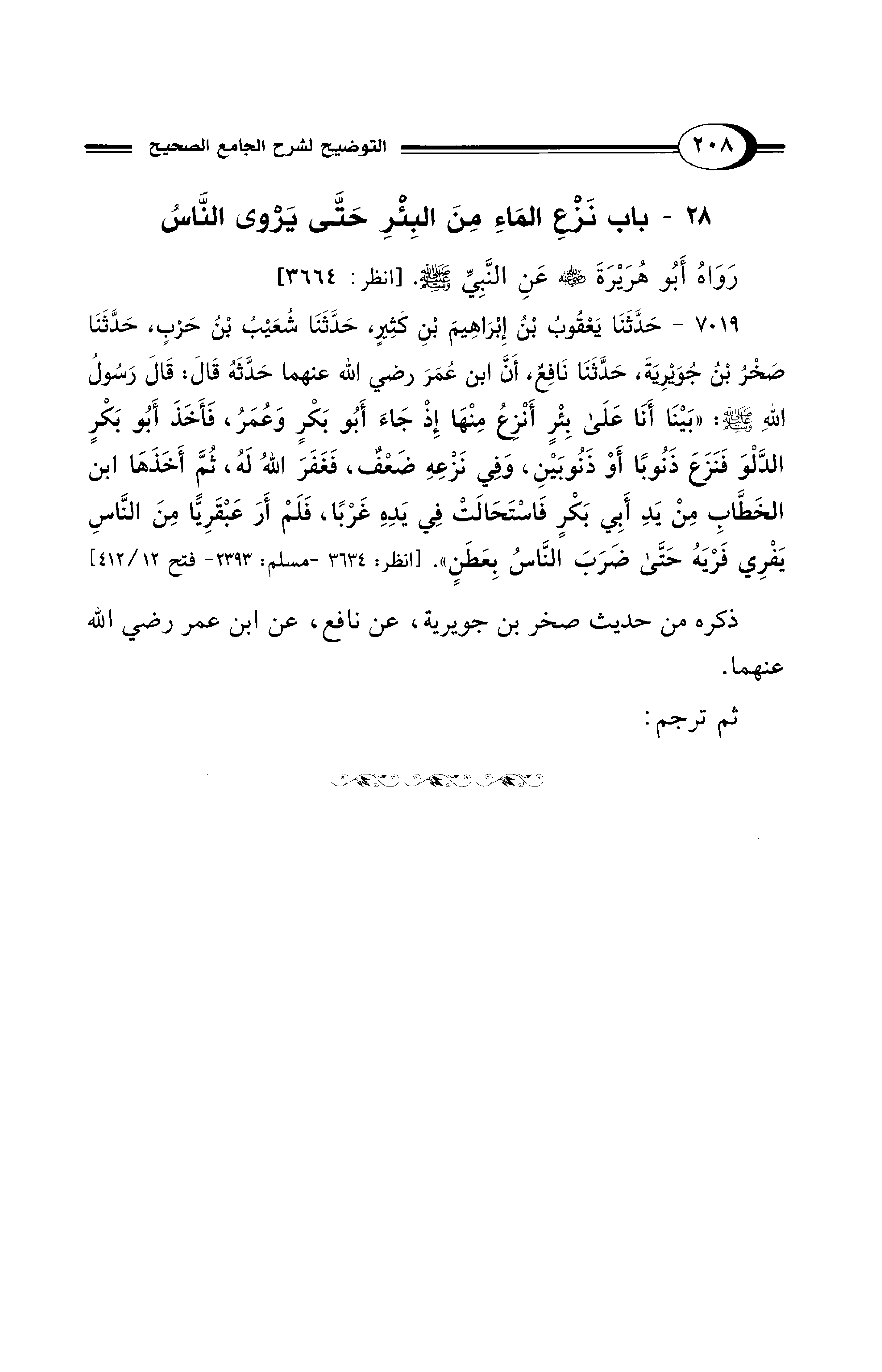 7019 - حَدَّثَنَا يَعْقُوبُ بْنُ إِبْرَاهِيمَ بْنِ كَثِيرٍ، حَدَّثَنَا شُعَيْبُ بْنُ حَرْبٍ، حَدَّثَنَا صَخْرُ بْنُ جُوَيْرِيَةَ، حَدَّثَنَا نَافِعٌ، أَنَّ ابْنَ عُمَرَ - رضي الله عنهما - حَدَّثَهُ قَالَ: قَالَ رَسُولُ اللهِ - صلى الله عليه وسلم -: «بَيْنَا أَنَا عَلَى بِئْرٍ أَنْزِعُ مِنْهَا إِذْ جَاءَ أَبُو بَكْرٍ وَعُمَرُ، فَأَخَذَ أَبُو بَكْرٍ الدَّلْوَ فَنَزَعَ ذَنُوبًا أَوْ ذَنُوبَيْنِ، وَفِي نَزْعِهِ ضَعْفٌ، فَغَفَرَ اللهُ لَهُ، ثُمَّ أَخَذَهَا ابْنُ الْخَطَّابِ مِنْ يَدِ أَبِي بَكْرٍ فَاسْتَحَالَتْ فِي يَدِهِ غَرْبًا، فَلَمْ أَرَ عَبْقَرِيًّا مِنَ النَّاسِ يَفْرِى فَرْيَهُ حَتَّى ضَرَبَ النَّاسُ بِعَطَنٍ». [انظر: 3634 - مسلم: 2393 - فتح 12/ 412]