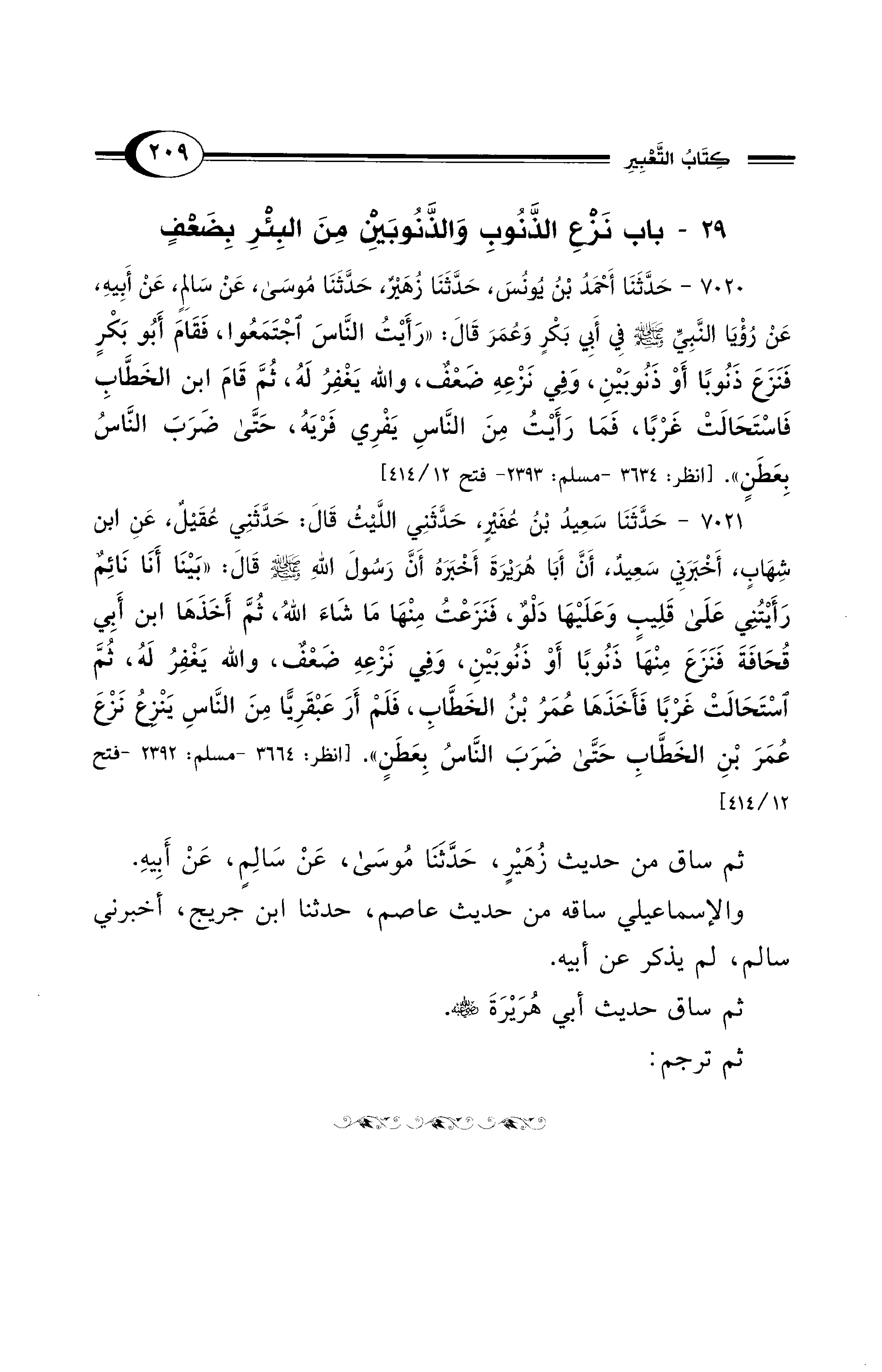 7020 - حَدَّثَنَا أَحْمَدُ بْنُ يُونُس، حَدَّثَنَا زُهَيْرٌ، حَدَّثَنَا مُوسَى، عَنْ سَالِمٍ، عَنْ أَبِيهِ، عَنْ رُؤْيَا النَّبِيِّ - صلى الله عليه وسلم - فِي أَبِي بَكْرٍ وَعُمَرَ قَالَ: «رَأَيْتُ النَّاسَ اجْتَمَعُوا، فَقَامَ أَبُو بَكْرٍ فَنَزَعَ ذَنُوبًا أَوْ ذَنُوبَيْنِ، وَفِي نَزْعِهِ ضَعْفٌ، وَاللهُ يَغْفِرُ لَهُ، ثُمَّ قَامَ ابْنُ الخَطَّابِ فَاسْتَحَالَتْ غَرْبًا، فَمَا رَأَيْتُ مِنَ النَّاسِ يَفْرِي فَرْيَهُ، حَتَّى ضَرَبَ النَّاسُ بِعَطَنٍ». [انظر: 3634 - مسلم: 2393 - فتح 12/ 414]