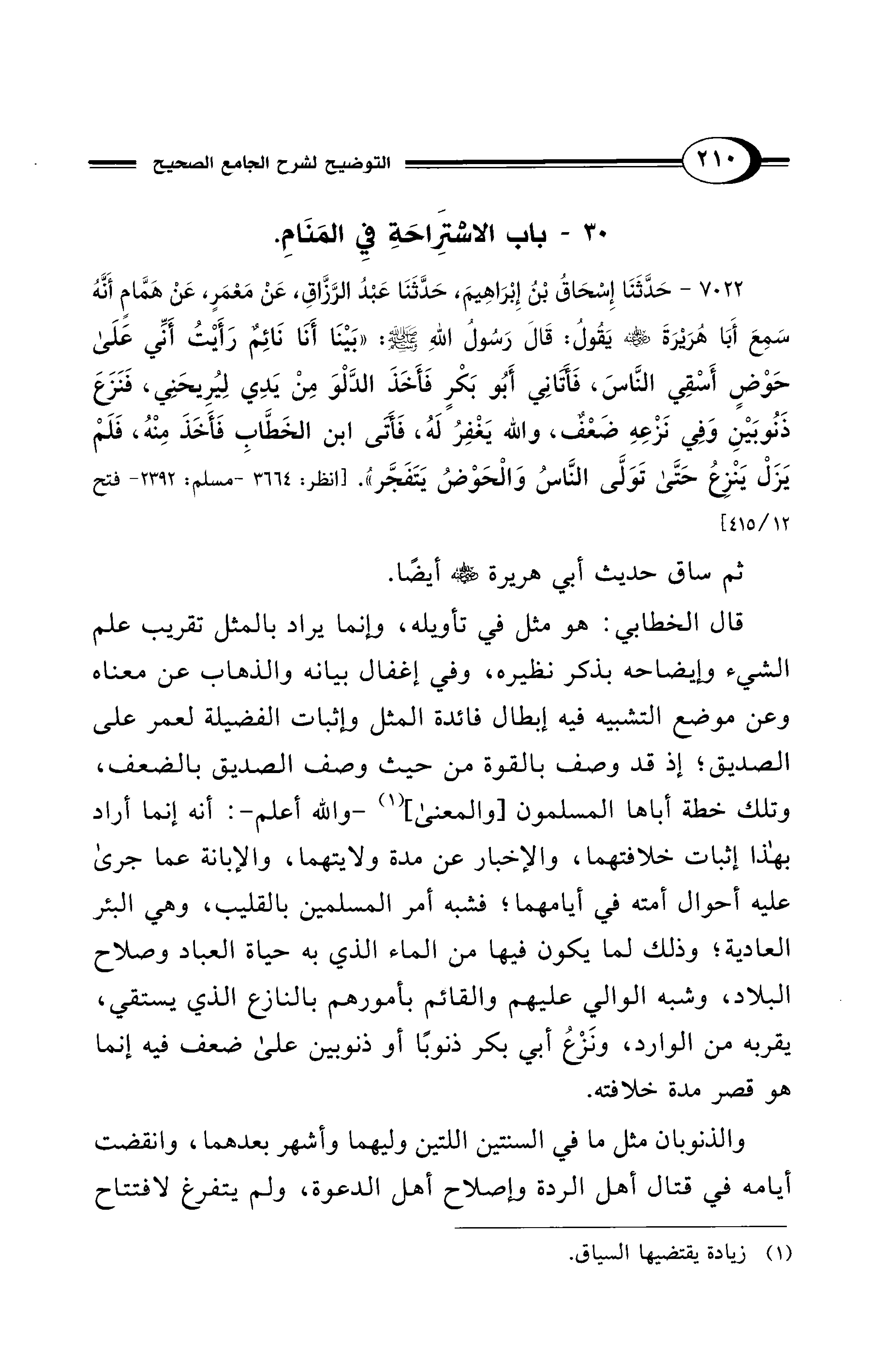 7022 - حَدَّثَنَا إِسْحَاقُ بْنُ إِبْرَاهِيمَ، حَدَّثَنَا عَبْدُ الرَّزَّاقِ، عَنْ مَعْمَرٍ، عَنْ هَمَّامٍ أَنَّهُ سَمِعَ أَبَا هُرَيْرَةَ - رضي الله عنه - يَقُولُ: قَالَ رَسُولُ اللهِ - صلى الله عليه وسلم -: «بَيْنَا أَنَا نَائِمٌ رَأَيْتُ أَنِّي عَلَى حَوْضٍ أَسْقِي النَّاسَ، فَأَتَانِي أَبُو بَكْرٍ فَأَخَذَ الدَّلْوَ مِنْ يَدِي لِيُرِيحَنِي، فَنَزَعَ ذَنُوبَيْنِ وَفِي نَزْعِهِ ضَعْفٌ، وَاللهُ يَغْفِرُ لَهُ، فَأَتَى ابْنُ الخَطَّابِ فَأَخَذَ مِنْهُ، فَلَمْ يَزَلْ يَنْزِعُ حَتَّى تَوَلَّى النَّاسُ وَالْحَوْضُ يَتَفَجَّرُ». [انظر 3664 - مسلم: 2392 - فتح 12/ 415]