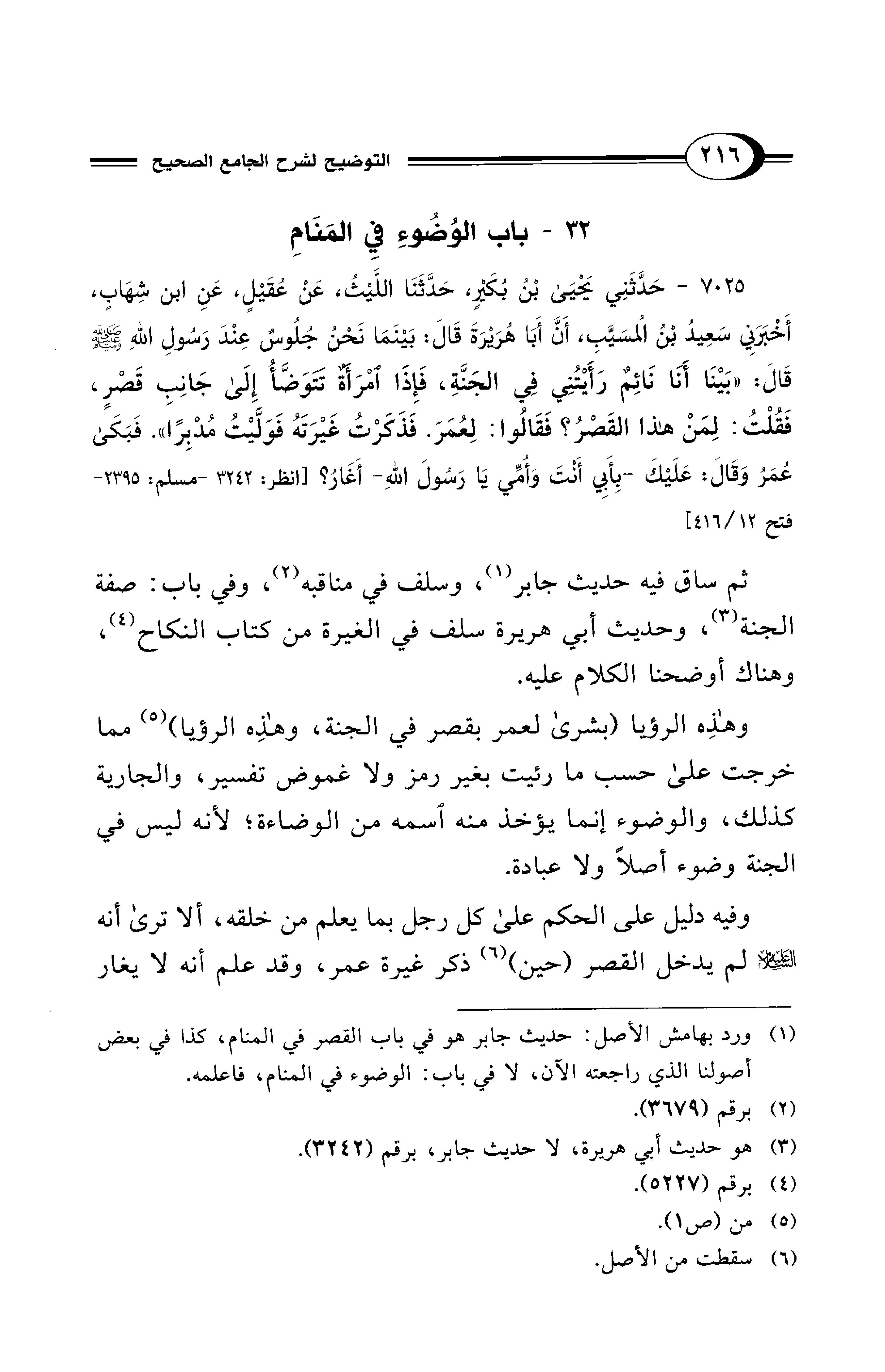 (¬1) ورد بهامش الأصل: حديث جابر هو في باب القصر في المنام، كذا في بعض أصولنا الذي راجعته الآن، لا في باب: الوضوء في المنام، فاعلمه.