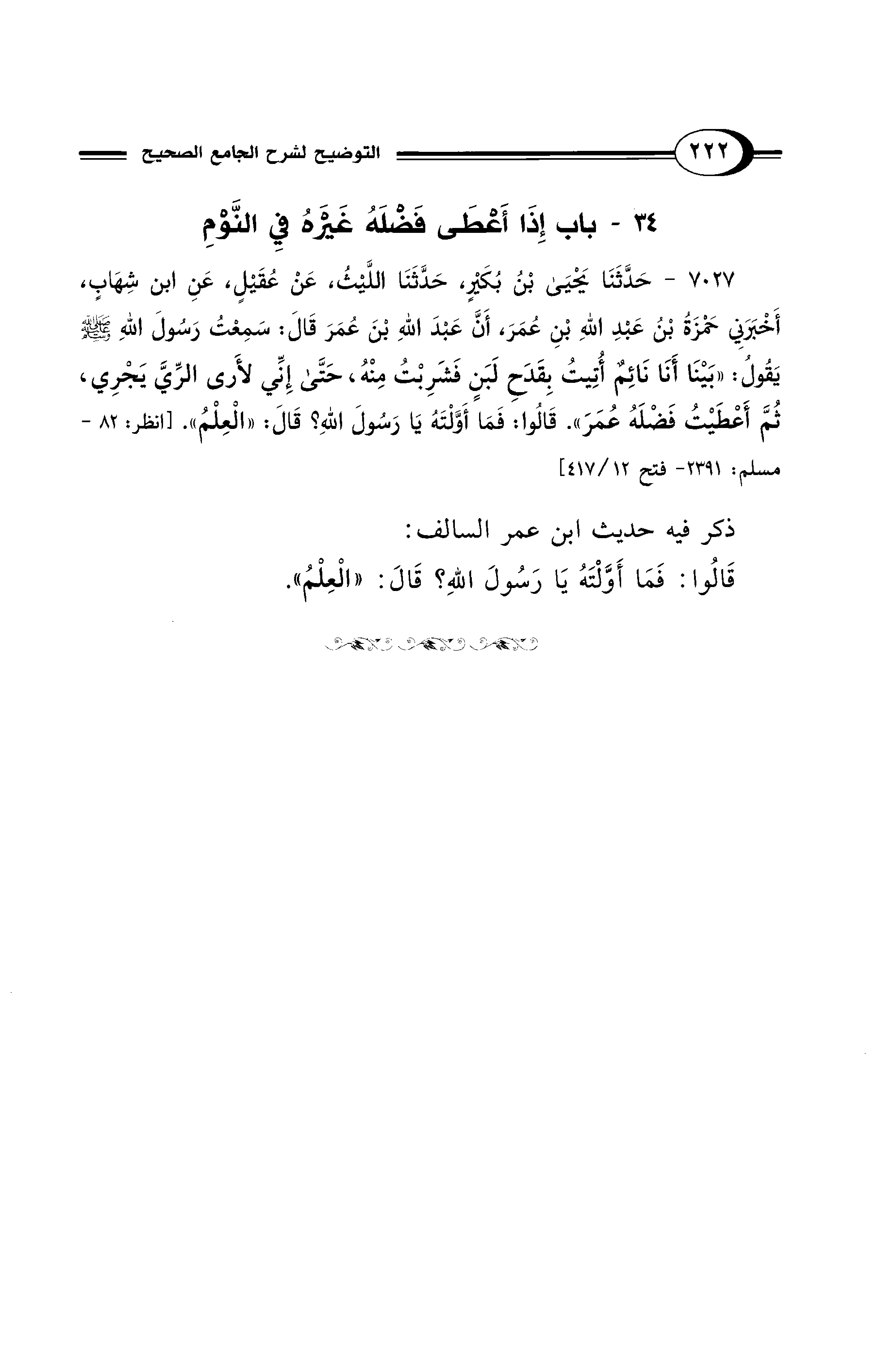 7027 - حَدَّثَنَا يَحْيَى بْنُ بُكَيْرٍ، حَدَّثَنَا اللَّيْثُ، عَنْ عُقَيْلٍ، عَنِ ابْنِ شِهَابٍ، أَخْبَرَنِي حَمْزَةُ بْنُ عَبْدِ اللهِ بْنِ عُمَرَ، أَنَّ عَبْدَ اللهِ بْنَ عُمَرَ قَالَ: سَمِعْتُ رَسُولَ اللهِ - صلى الله عليه وسلم - يَقُولُ: «بَيْنَا أَنَا نَائِمٌ أُتِيتُ بِقَدَحِ لَبَنٍ فَشَرِبْتُ مِنْهُ، حَتَّى إِنِّي لأَرَى الرِّيَّ يَجْرِي، ثُمَّ أَعْطَيْتُ فَضْلَهُ عُمَرَ». قَالُوا: فَمَا أَوَّلْتَهُ يَا رَسُولَ اللهِ؟ قَالَ: «الْعِلْمُ». [انظر: 82 - مسلم: 2391 - فتح 12/ 417]