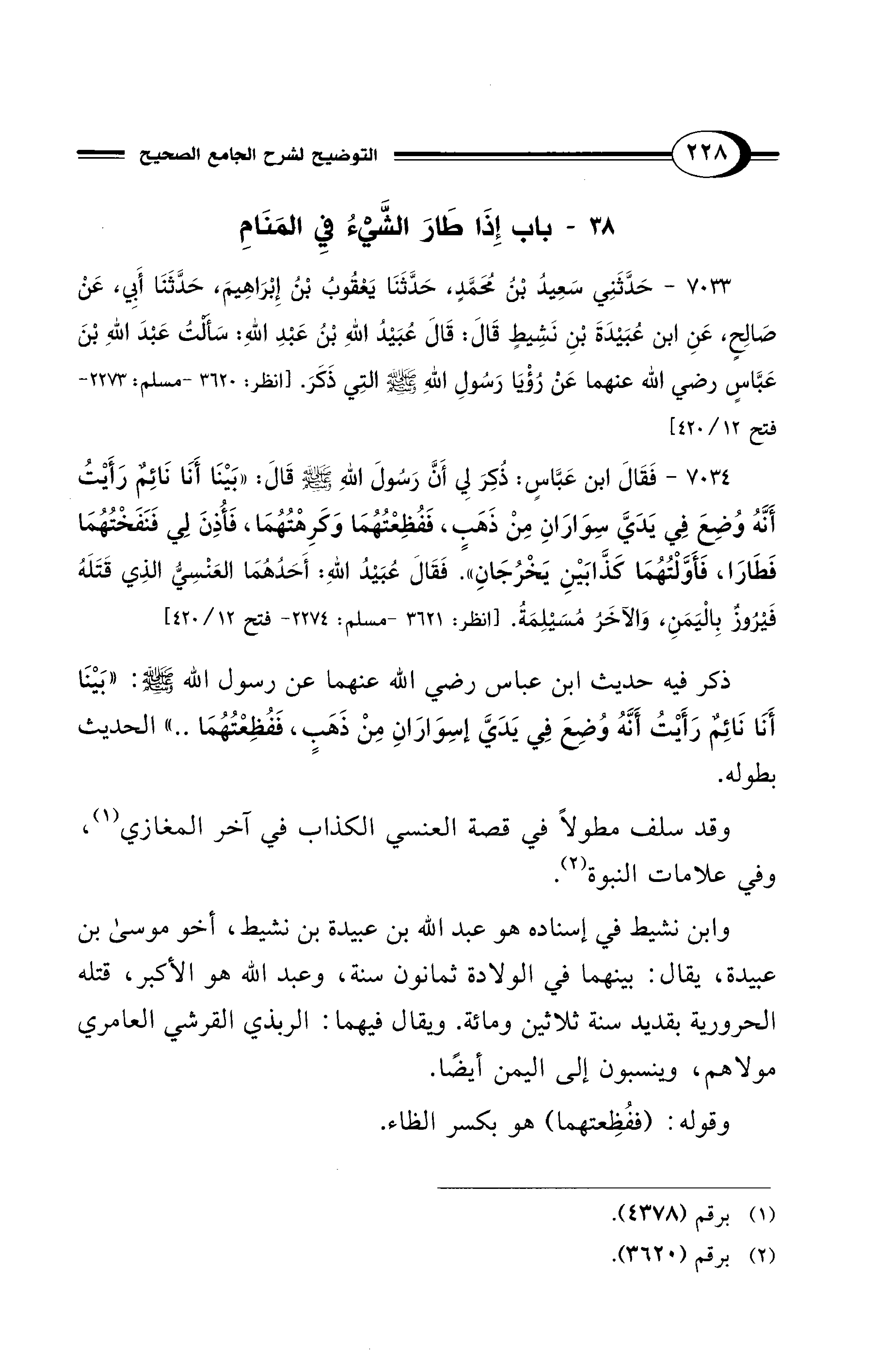 7033 - حَدَّثَنِي سَعِيدُ بْنُ مُحَمَّدٍ، حَدَّثَنَا يَعْقُوبُ بْنُ إِبْرَاهِيمَ، حَدَّثَنَا أَبِي، عَنْ صَالِحٍ، عَنِ ابْنِ عُبَيْدَةَ بْنِ نَشِيطٍ قَالَ: قَالَ عُبَيْدُ اللهِ بْنُ عَبْدِ اللهِ: سَأَلْتُ عَبْدَ اللهِ بْنَ عَبَّاسٍ - رضي الله عنهما - عَنْ رُؤْيَا رَسُولِ اللهِ - صلى الله عليه وسلم - التِي ذَكَرَ. [انظر: 3620 - مسلم: 2273 - فتح 12/ 420]