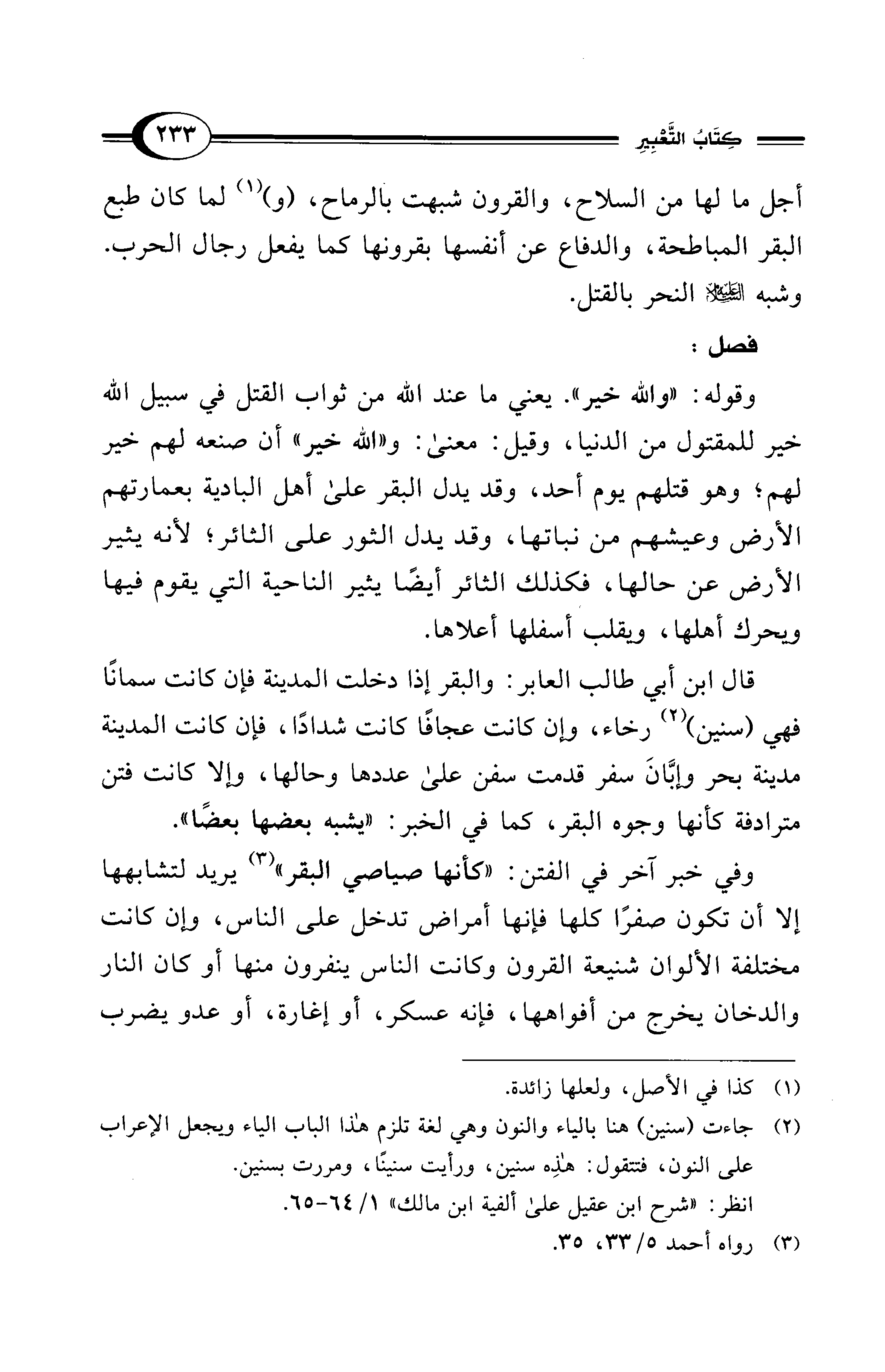 وقوله: "والله خير". يعني ما عند الله من ثواب القتل في سبيل الله خير للمقتول من الدنيا، وقيل: معنى: و"الله خير" أن صنعه لهم خير لهم؛ وهو قتلهم يوم أحد، وقد يدل البقر على أهل البادية بعمارتهم الأرض وعيشهم من نباتها، وقد يدل الثور على الثائر؛ لأنه يثير الأرض عن حالها، فكذلك الثائر أيضًا يثير الناحية التي يقوم فيها ويحرك أهلها، ويقلب أسفلها أعلاها.
