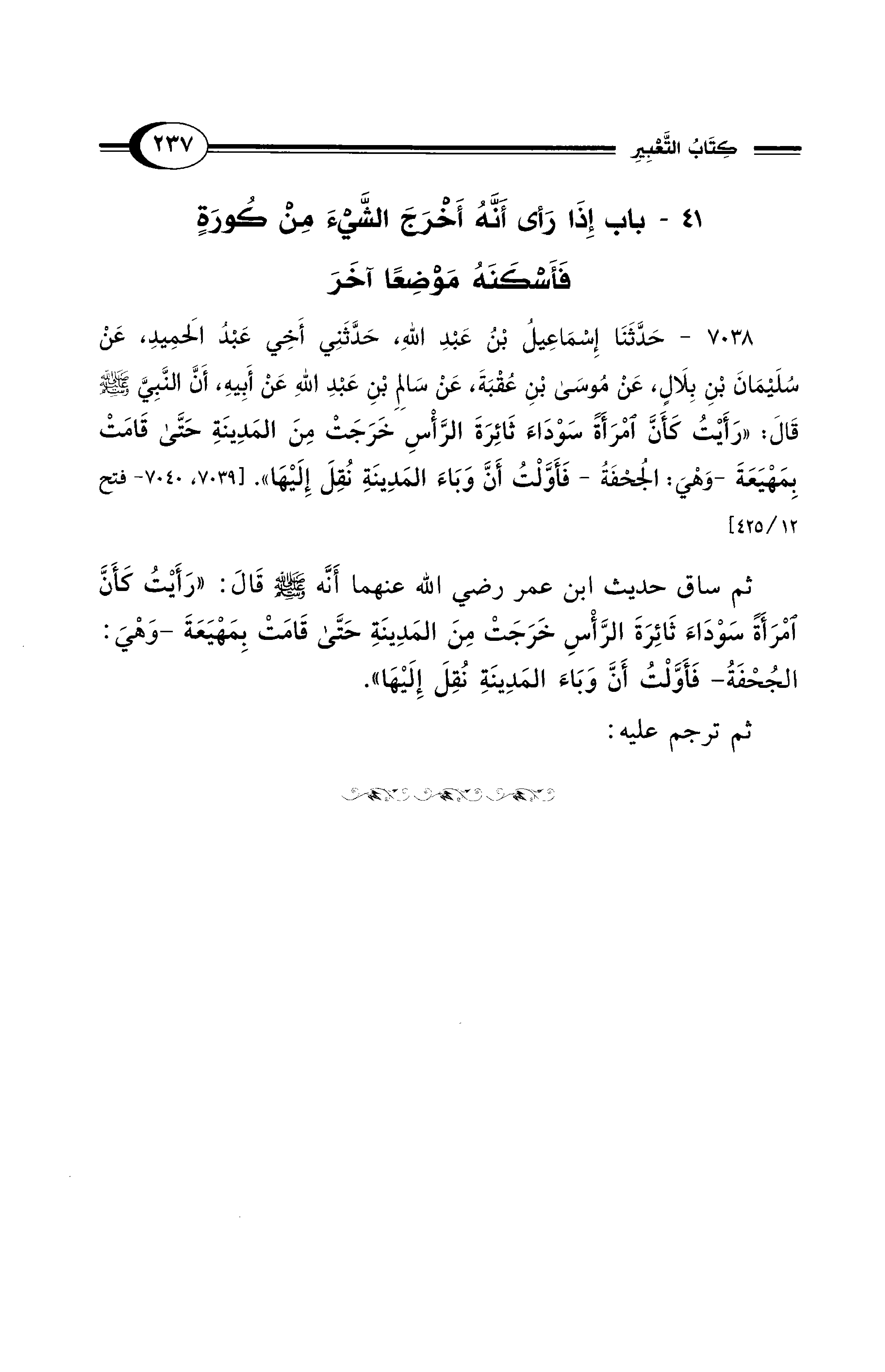 7038 - حَدَّثَنَا إِسْمَاعِيلُ بْنُ عَبْدِ اللهِ، حَدَّثَنِي أَخِي عَبْدُ الْحَمِيدِ، عَنْ سُلَيْمَانَ بْنِ بِلاَلٍ، عَنْ مُوسَى بْنِ عُقْبَةَ، عَنْ سَالِمِ بْنِ عَبْدِ اللهِ عَنْ أَبِيهِ، أَنَّ النَّبِيَّ - صلى الله عليه وسلم - قَالَ: «رَأَيْتُ كَأَنَّ امْرَأَةً سَوْدَاءَ ثَائِرَةَ الرَّأْسِ خَرَجَتْ مِنَ الْمَدِينَةِ حَتَّى قَامَتْ بِمَهْيَعَةَ -وَهْيَ: الْجُحْفَةُ- فَأَوَّلْتُ أَنَّ وَبَاءَ الْمَدِينَةِ نُقِلَ إِلَيْهَا». [7039، 7040 - فتح 12/ 425]