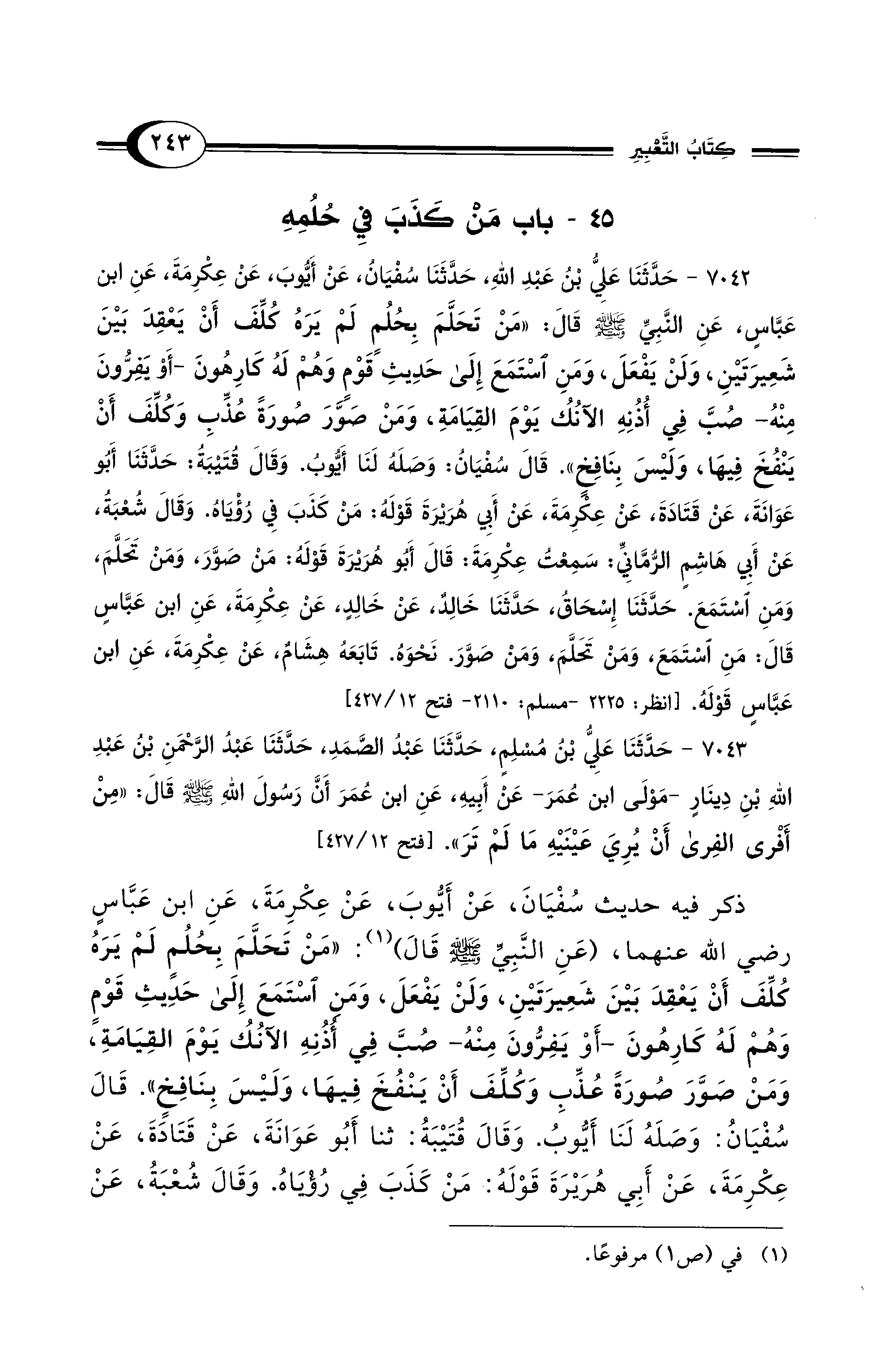 7042 - حَدَّثَنَا عَلِيُّ بْنُ عَبْدِ اللهِ، حَدَّثَنَا سُفْيَانُ، عَنْ أَيُّوبَ، عَنْ عِكْرِمَةَ، عَنِ ابْنِ عَبَّاسٍ، عَنِ النَّبِيِّ - صلى الله عليه وسلم - قَالَ: «مَنْ تَحَلَّمَ بِحُلُمٍ لَمْ يَرَهُ كُلِّفَ أَنْ يَعْقِدَ بَيْنَ شَعِيرَتَيْنِ، وَلَنْ يَفْعَلَ، وَمَنِ اسْتَمَعَ إِلَى حَدِيثِ قَوْمٍ وَهُمْ لَهُ كَارِهُونَ -أَوْ يَفِرُّونَ مِنْهُ- صُبَّ فِي أُذُنِهِ الآنُكُ يَوْمَ الْقِيَامَةِ، وَمَنْ صَوَّرَ صُورَةً عُذِّبِ وَكُلِّفَ أَنْ يَنْفُخَ فِيهَا، وَلَيْسَ بِنَافِخٍ». قَالَ سُفْيَانُ وَصَلَهُ لَنَا أَيُّوبُ. وَقَالَ قُتَيْبَةُ: حَدَّثَنَا أَبُو عَوَانَةَ، عَنْ قَتَادَةَ، عَنْ عِكْرِمَةَ، عَنْ أَبِي هُرَيْرَةَ قَوْلَهُ: مَنْ كَذَبَ فِي رُؤْيَاهُ. وَقَالَ شُعْبَةُ، عَنْ أَبِي هَاشِمٍ الرُّمَّانِيِّ: سَمِعْتُ عِكْرِمَةَ: قَالَ أَبُو هُرَيْرَةَ قَوْلَهُ: مَنْ صَوَّر، وَمَنْ تَحَلَّمَ، وَمَنِ اسْتَمَعَ. حَدَّثَنِا إِسْحَاقُ، حَدَّثَنَا خَالِدٌ، عَنْ خَالِدٍ، عَنْ عِكْرِمَةَ، عَنِ ابْنِ عَبَّاسٍ قَالَ: «مَنِ اسْتَمَعَ، وَمَنْ تَحَلَّمَ، وَمَنْ صَوَّرَ. نَحْوَهُ. تَابَعَهُ هِشَامٌ، عَنْ عِكْرِمَةَ، عَنِ ابْنِ عَبَّاسٍ قَوْلَهُ. [انظر: 2225 - مسلم: 2110 - فتح 12/ 427]