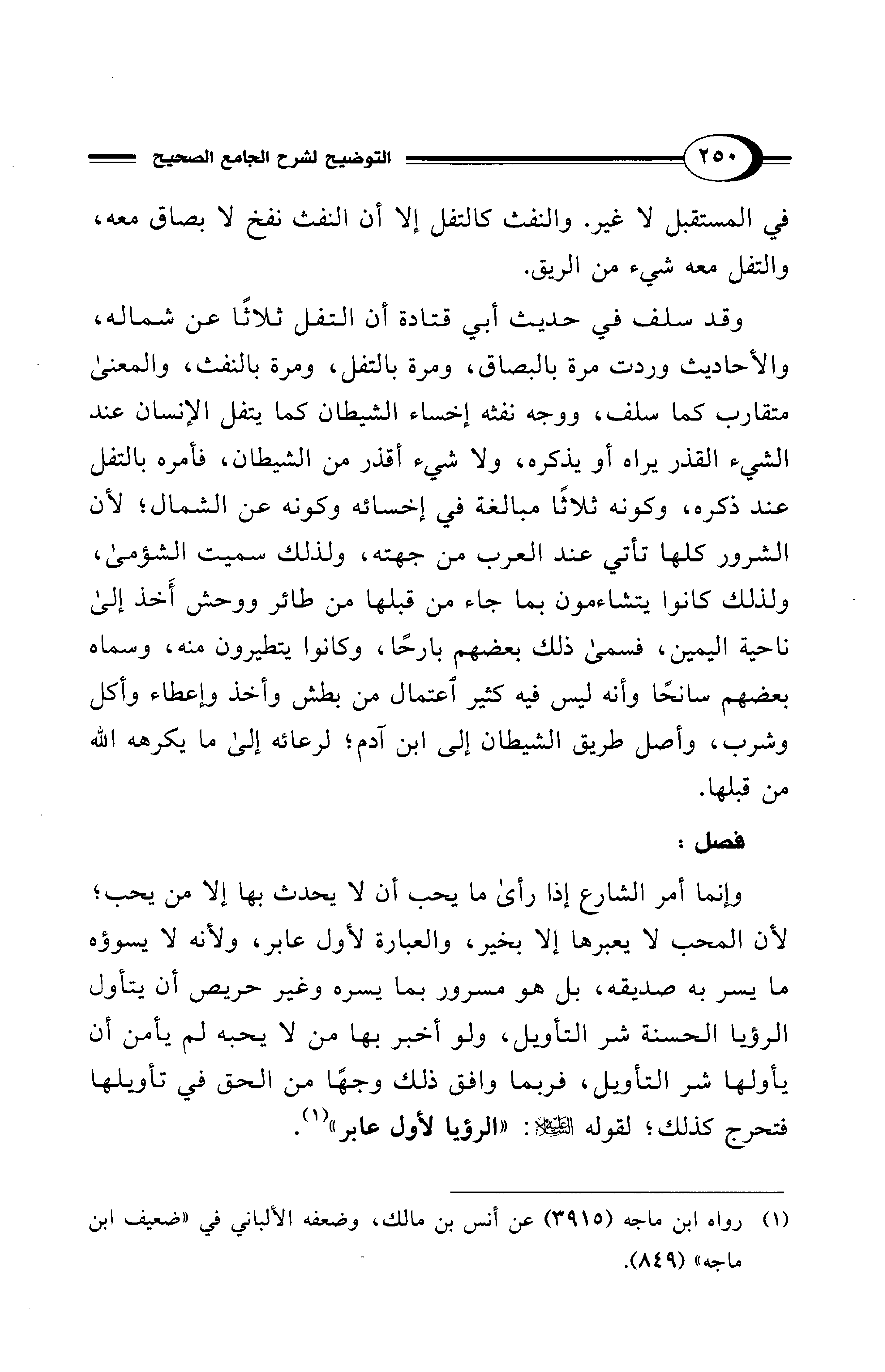 وقد سلف في حديث أبي قتادة أن التفل ثلاثًا عن شماله، والأحاديث وردت مرة بالبصاق، ومرة بالتفل، ومرة بالنفث، والمعنى متقارب كما سلف، ووجه نفثه إخساء الشيطان كما يتفل الإنسان عند الشيء القذر يراه أو يذكره، ولا شيء أقذر من الشيطان، فأمره بالتفل عند ذكره، وكونه ثلاثًا مبالغة في إخسائه وكونه عن الشمال؛ لأن الشرور كلها تأتي عند العرب من جهته، ولذلك سميت الشؤمى، ولذلك كانوا يتشاءمون بما جاء من قبلها من طائر ووحش أَخذ إلى ناحية اليمين، فسمى ذلك بعضهم بارحًا، وكانوا يتطيرون منه، وسماه بعضهم سانحًا وأنه ليس فيه كثير اعتمال من بطش وأخذ وإعطاء وأكل وشرب، وأصل طريق الشيطان إلى ابن آدم؛ لرعائه إلى ما يكرهه الله من قبلها.