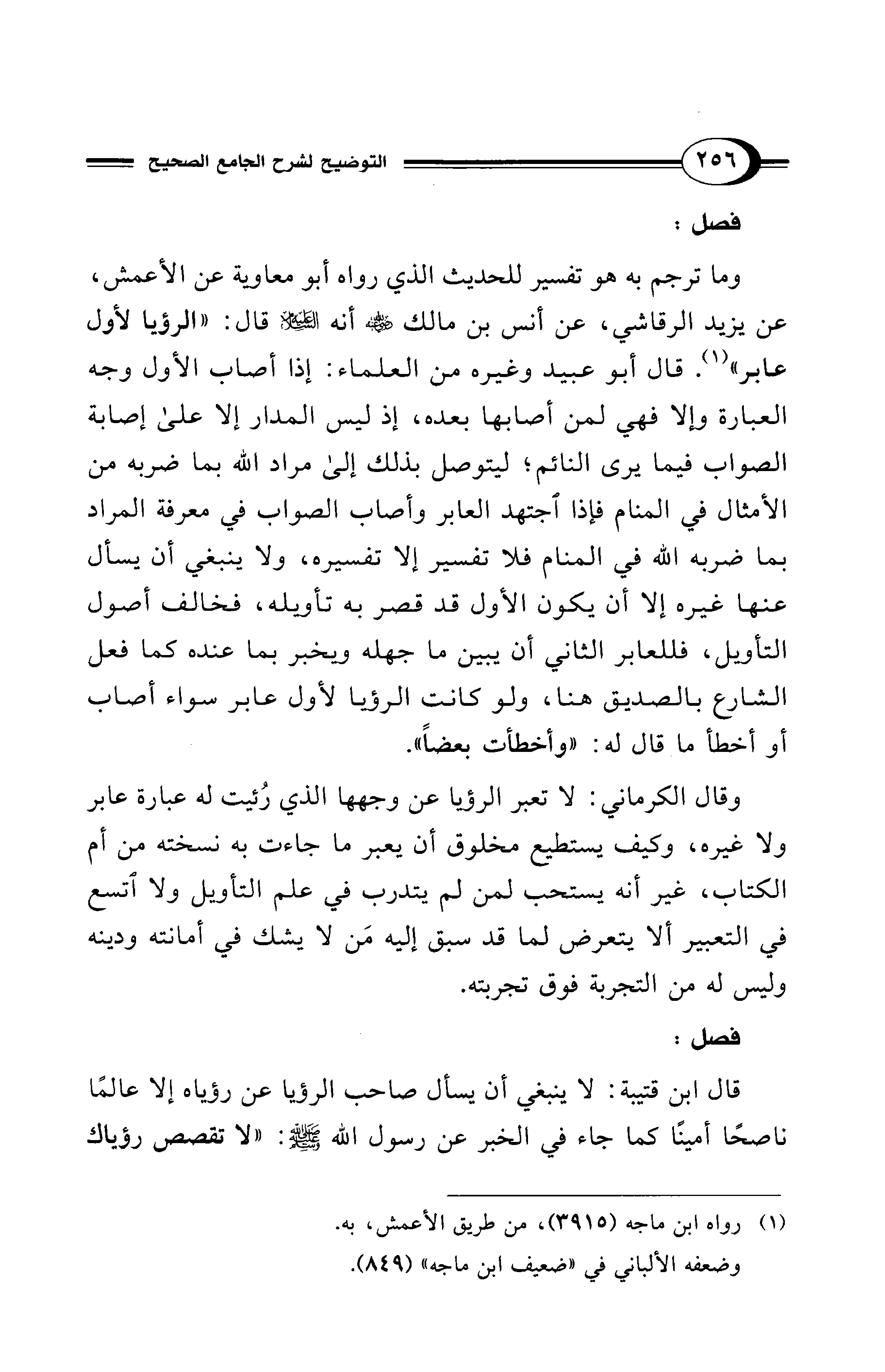 وقال الكرماني: لا تعبر الرؤيا عن وجهها الذي رُئيت له عبارة عابر ولا غيره، وكيف يستطيع مخلوق أن يعبر ما جاءت به نسخته من أم الكتاب، غير أنه يستحب لمن لم يتدرب في علم التأويل ولا اتسع في التعبير ألا يتعرض لما قد سبق إليه مَن لا يشك في أمانته ودينه وليس له من التجربة فوق تجربته.