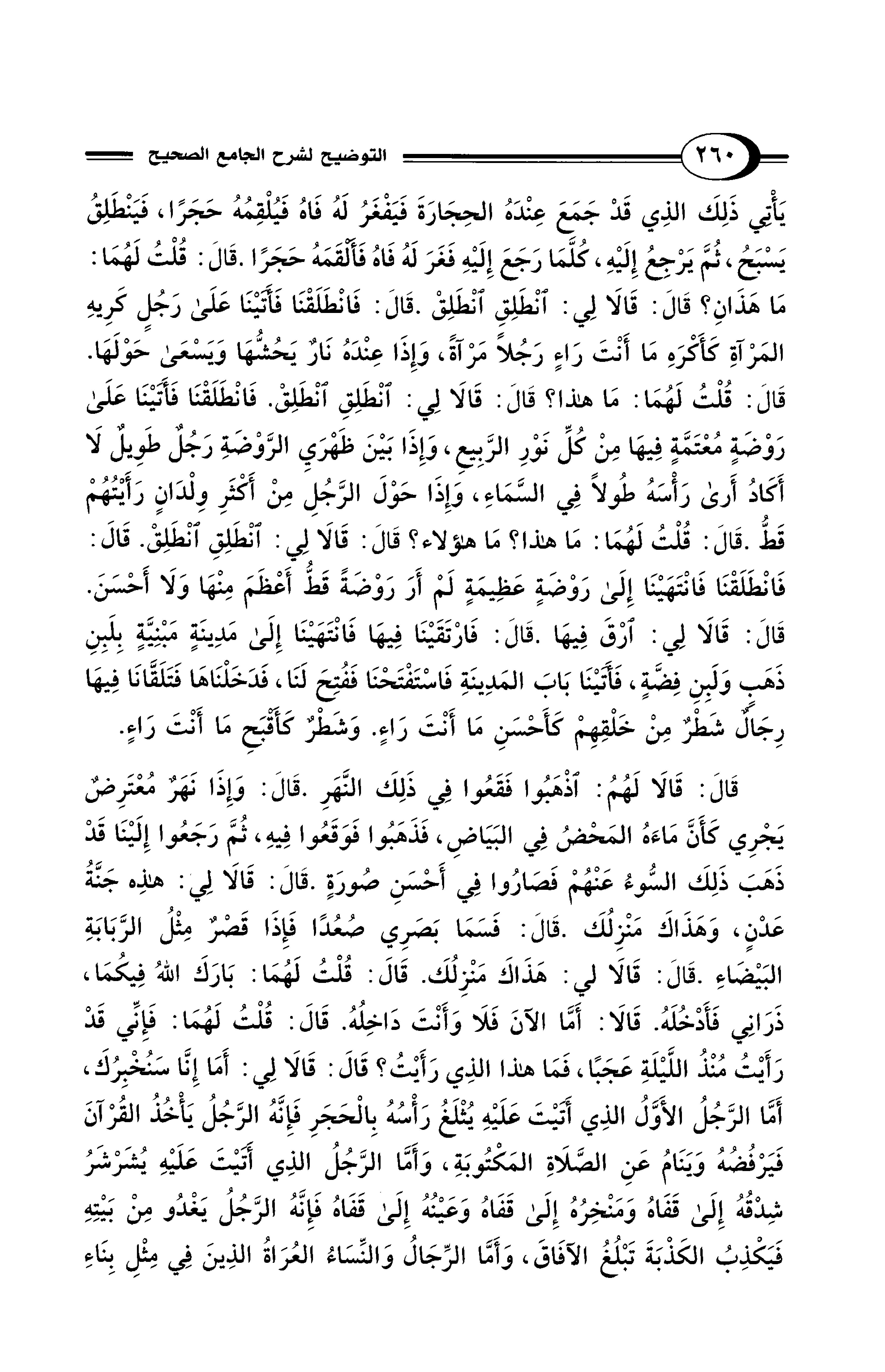قَالَ: قَالاَ لَهُمُ: اذْهَبُوا فَقَعُوا فِي ذَلِكَ النَّهَرِ. قَالَ: وَإِذَا نَهَرٌ مُعْتَرِضٌ يَجْرِى كَأَنَّ مَاءَهُ المَحْضُ فِي البَيَاضِ، فَذَهَبُوا فَوَقَعُوا فِيهِ، ثُمَّ رَجَعُوا إِلَيْنَا قَدْ ذَهَبَ ذَلِكَ السُّوءُ عَنْهُمْ، فَصَارُوا فِي أَحْسَنِ صُورَةٍ. قَالَ: قَالاَ لِي: هَذِهِ جَنَّةُ عَدْنٍ، وَهَذَاكَ مَنْزِلُكَ. قَالَ: فَسَمَا بَصَرِي صُعُدًا، فَإِذَا قَصْرٌ مِثْلُ الرَّبَابَةِ البَيْضَاءِ. قَالَ: قَالا ليَ: هَذَاكَ مَنْزِلُكَ. قَالَ: قُلْتُ لَهُمَا: بَارَكَ اللهُ فِيكُمَا، ذَرَانِي فَأَدْخُلَهُ. قَالاَ: أَمَّا الآنَ فَلاَ وَأَنْتَ دَاخِلُهُ. قَالَ: قُلْتُ لَهُمَا: فَإِنِّي قَدْ رَأَيْتُ مُنْذُ اللَّيْلَةِ عَجَبًا، فَمَا هَذَا الَّذِي رَأَيْتُ؟ قَالَ: قَالاَ لِي: أَمَا إِنَّا سَنُخْبِرُكَ، أَمَّا الرَّجُلُ الأَوَّلُ الَّذِي أَتَيْتَ عَلَيْهِ يُثْلَغُ رَأْسُهُ بِالْحَجَرِ، فَإِنَّهُ الرَّجُلُ يَأْخُذُ الْقُرْآنَ