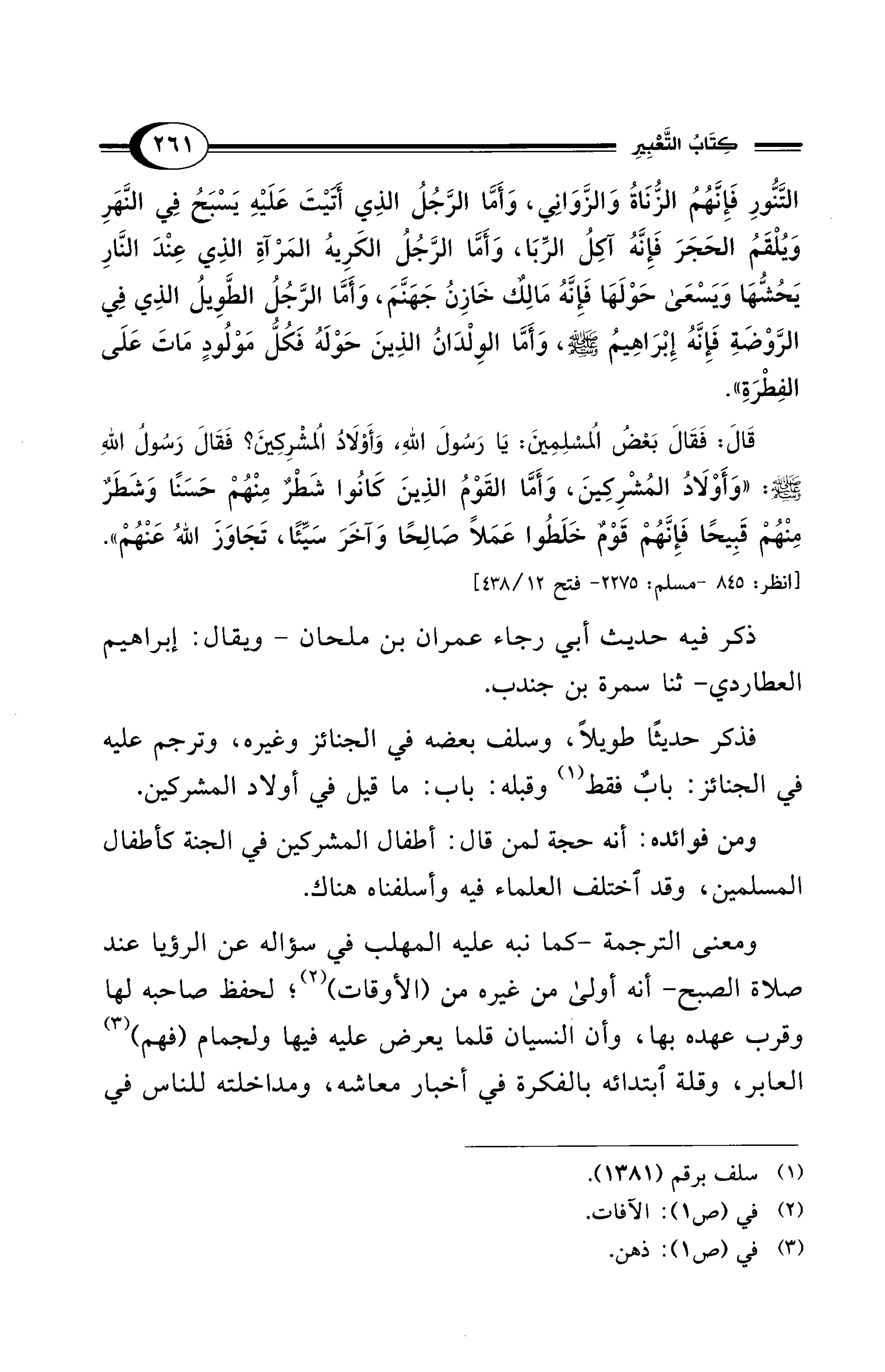 قَالَ: فَقَالَ بَعْضُ الْمُسْلِمِينَ: يَا رَسُولَ اللهِ، وَأَوْلاَدُ المُشْرِكِينَ؟ فَقَالَ رَسُولُ اللهِ - صلى الله عليه وسلم -: «وَأَوْلاَدُ الْمُشْرِكِينَ، وَأَمَّا الْقَوْمُ الَّذِينَ كَانُوا شَطْرٌ مِنْهُمْ حَسَنًا وَشَطَرٌ مِنْهُمْ قَبِيحًا فَإِنَّهُمْ قَوْمٌ خَلَطُوا عَمَلاً صَالِحًا وَآخَرَ سَيِّئًا، تَجَاوَزَ اللهُ عَنْهُمْ" [انظر: 845 - مسلم: 2257 - فتح 12/ 438]