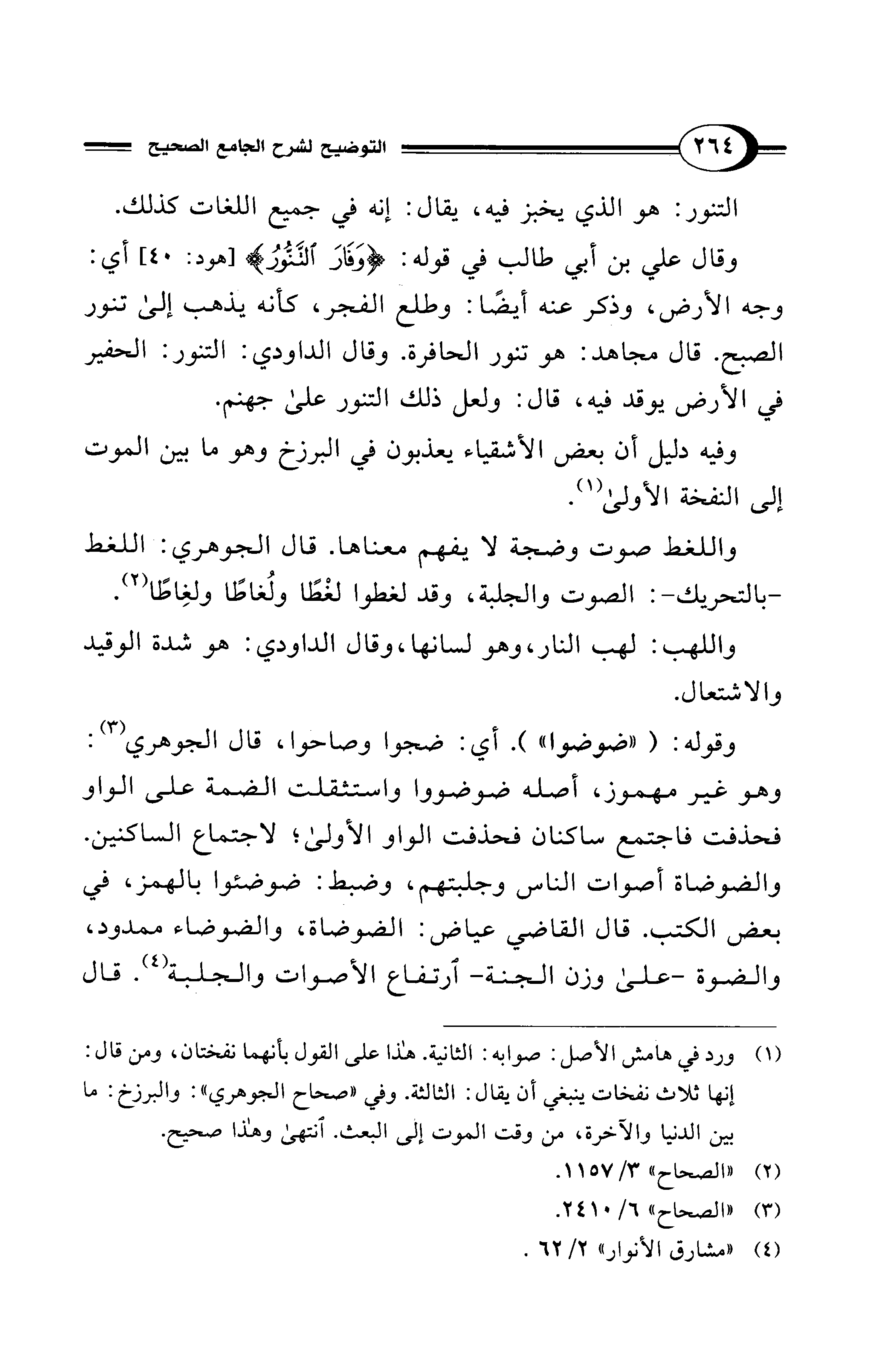 وقال علي بن أبي طالب في قوله: {وَفَارَ التَّنُّورُ} [هود: 40] أي: وجه الأرض، وذكر عنه أيضًا: وطلع الفجر، كأنه يذهب إلى تنور الصبح. قال مجاهد: هو تنور الحافرة. وقال الداودي: التنور: الحفير في الأرض يوقد فيه، قال: ولعل ذلك التنور على جهنم.