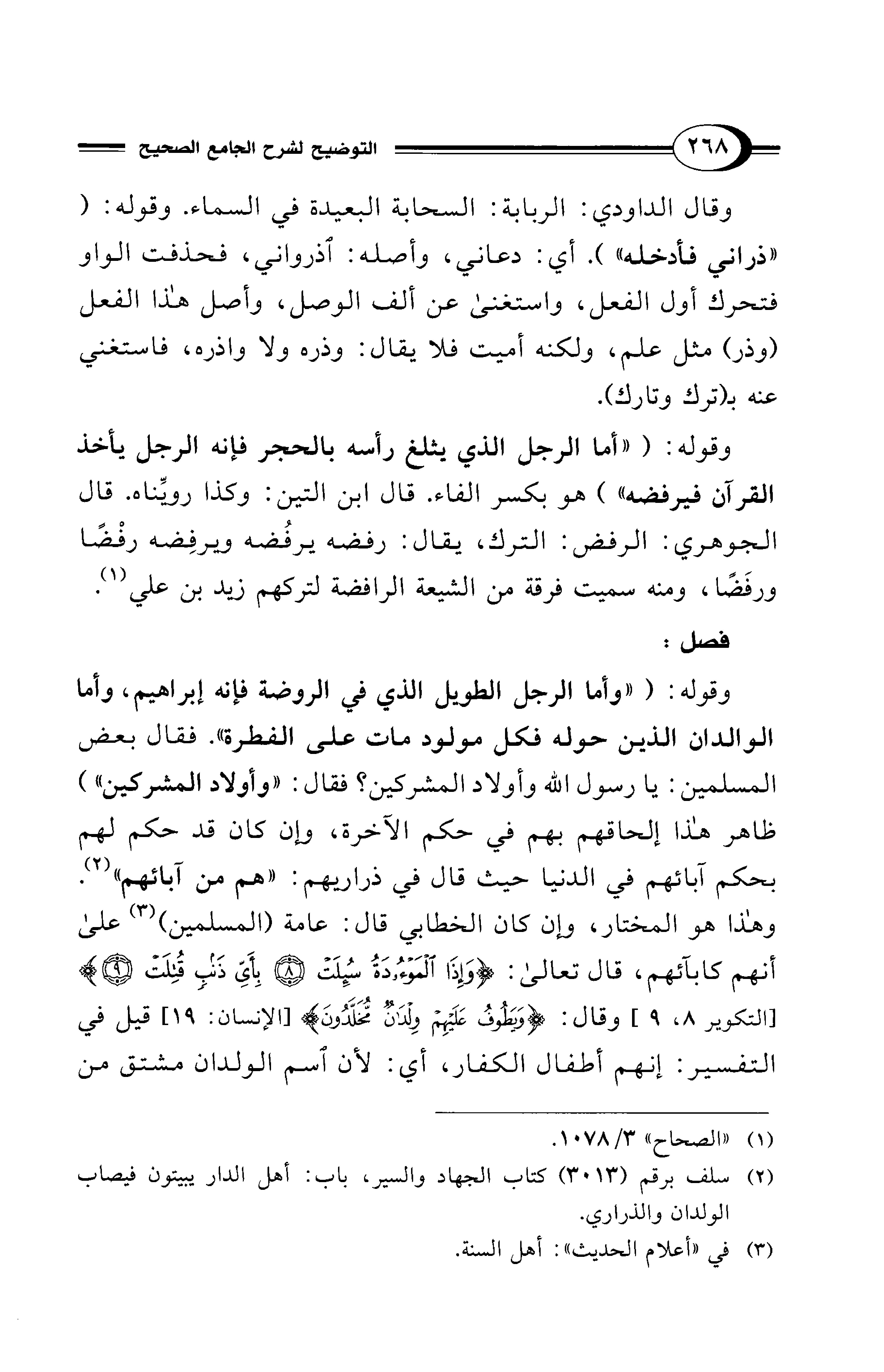 وقوله: ("وأما الرجل الطويل الذي في الروضة فإنه إبراهيم، وأما الوالدان الذين حوله فكل مولود مات على الفطرة". فقال بعض المسلمين: يا رسول الله وأولاد المشركين؟ فقال: "وأولاد المشركين") ظاهر هذا إلحاقهم بهم في حكم الآخرة، وإن كان قد حكم لهم بحكم آبائهم في الدنيا حيث قال في ذراريهم: "هم من آبائهم" (¬2). وهذا هو المختار، وإن كان الخطابي قال: عامة (المسلمين) (¬3) على أنهم كآبائهم، قال تعالى: {وَإِذَا الْمَوْءُودَةُ سُئِلَتْ (8) بِأَيِّ ذَنْبٍ قُتِلَتْ (9)} [التكوير 8، 9] وقال: {وَيَطُوفُ عَلَيْهِمْ وِلْدَانٌ مُخَلَّدُونَ} [الإنسان: 19] قيل في التفسير: إنهم أطفال الكفار، أي: لأن اسم الولدان مشتق من