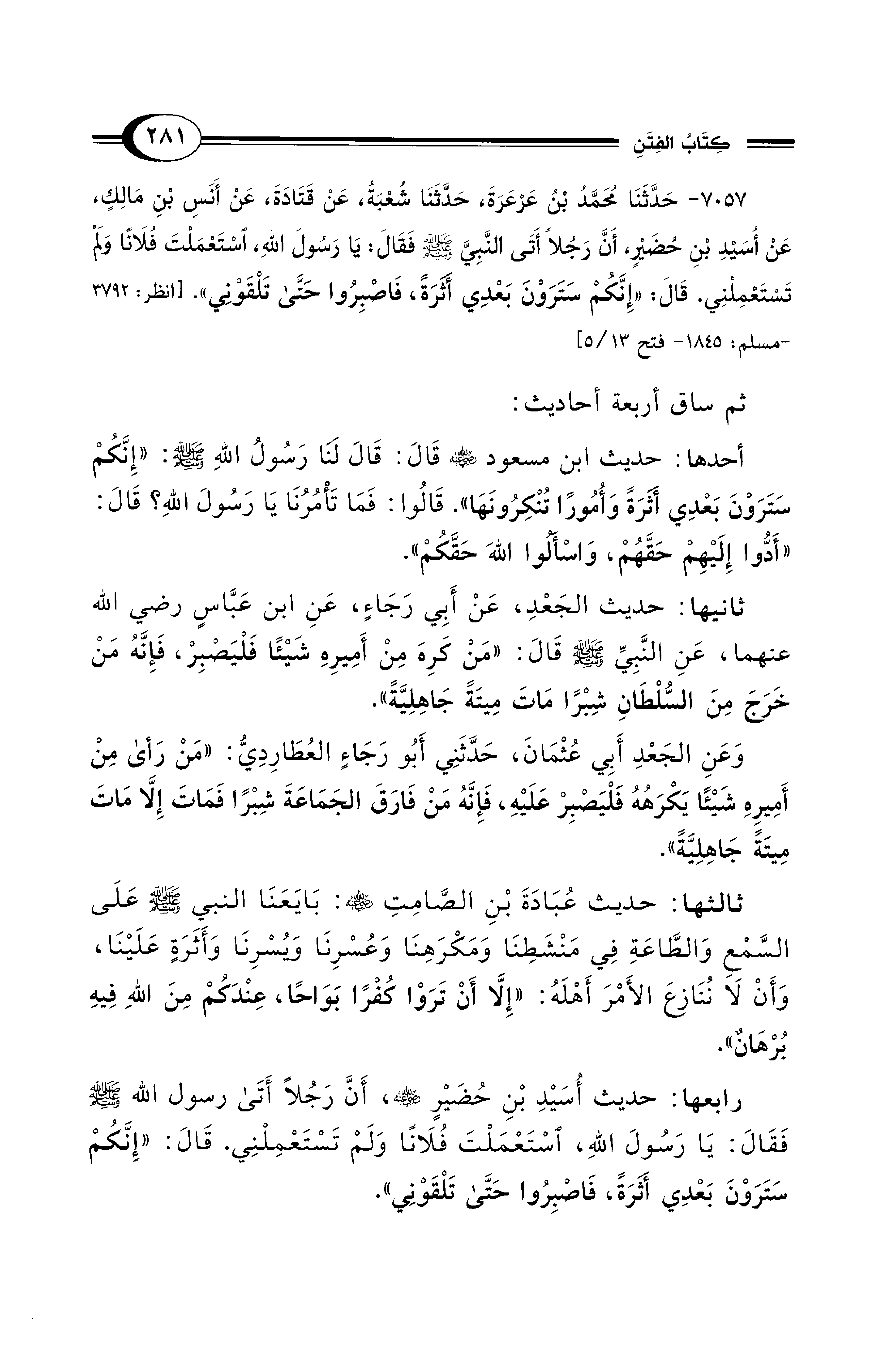 7057 - حَدَّثَنَا مُحَمَّدُ بْنُ عَرْعَرَةَ، حَدَّثَنَا شُعْبَةُ، عَنْ قَتَادَةَ، عَنْ أَنَسِ بْنِ مَالِك، عَنْ أُسَيْدِ بْنِ حُضَيْرٍ، أَنَّ رَجُلاً أَتَى النَّبِيَّ - صلى الله عليه وسلم - فَقَالَ: يَا رَسُولَ اللهِ، اسْتَعْمَلْتَ فُلاَنًا وَلَمْ تَسْتَعْمِلْنِي. قَالَ: «إِنَّكُمْ سَتَرَوْنَ بَعْدِي أَثَرَةً، فَاصْبِرُوا حَتَّى تَلْقَوْنِي». [انظر: 3792 - مسلم: 1845 - فتح 13/ 5]