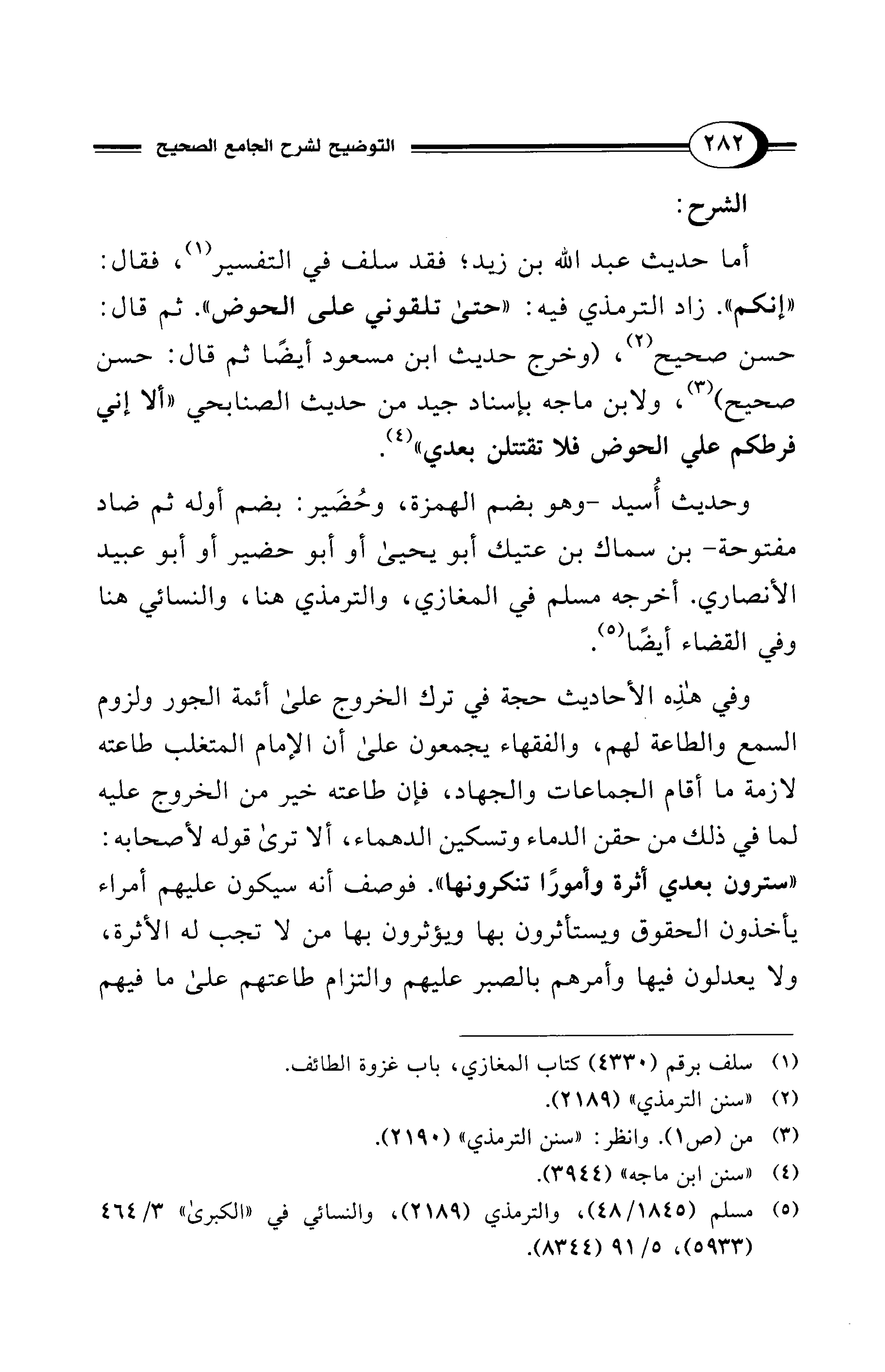 وحديث أُسيد -وهو بضم الهمزة، وحُضير: بضم أوله ثم ضاد مفتوحة- بن سماك بن عتيك أبو يحيى أو أبو حضير أو أبو عبيد الأنصاري. أخرجه مسلم في المغازي، والترمذي هنا، والنسائي هنا وفي القضاء أيضًا (¬5).