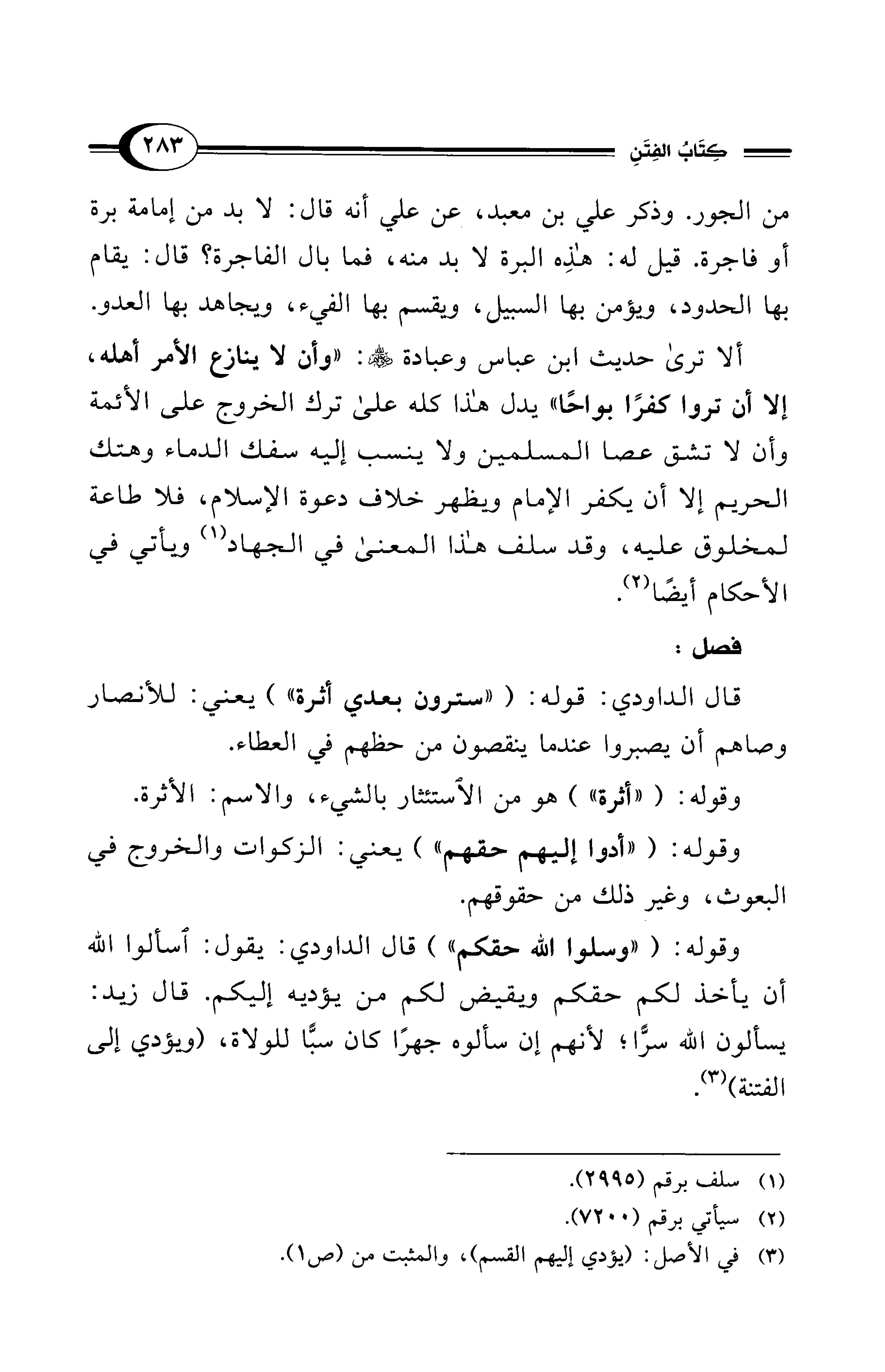 ألا ترى حديث ابن عباس وعبادة - رضي الله عنه -: "وأن لا ينازع الأمر أهله، إلا أن تروا كفرًا بواحًا" يدل هذا كله على ترك الخروج على الأئمة وأن لا تشق عصا المسلمين ولا ينسب إليه سفك الدماء وهتك الحريم إلا أن يكفر الإمام ويظهر خلاف دعوة الإسلام، فلا طاعة لمخلوق عليه، وقد سلف هذا المعنى في الجهاد (¬1) ويأتي في الأحكام أيضًا (¬2).