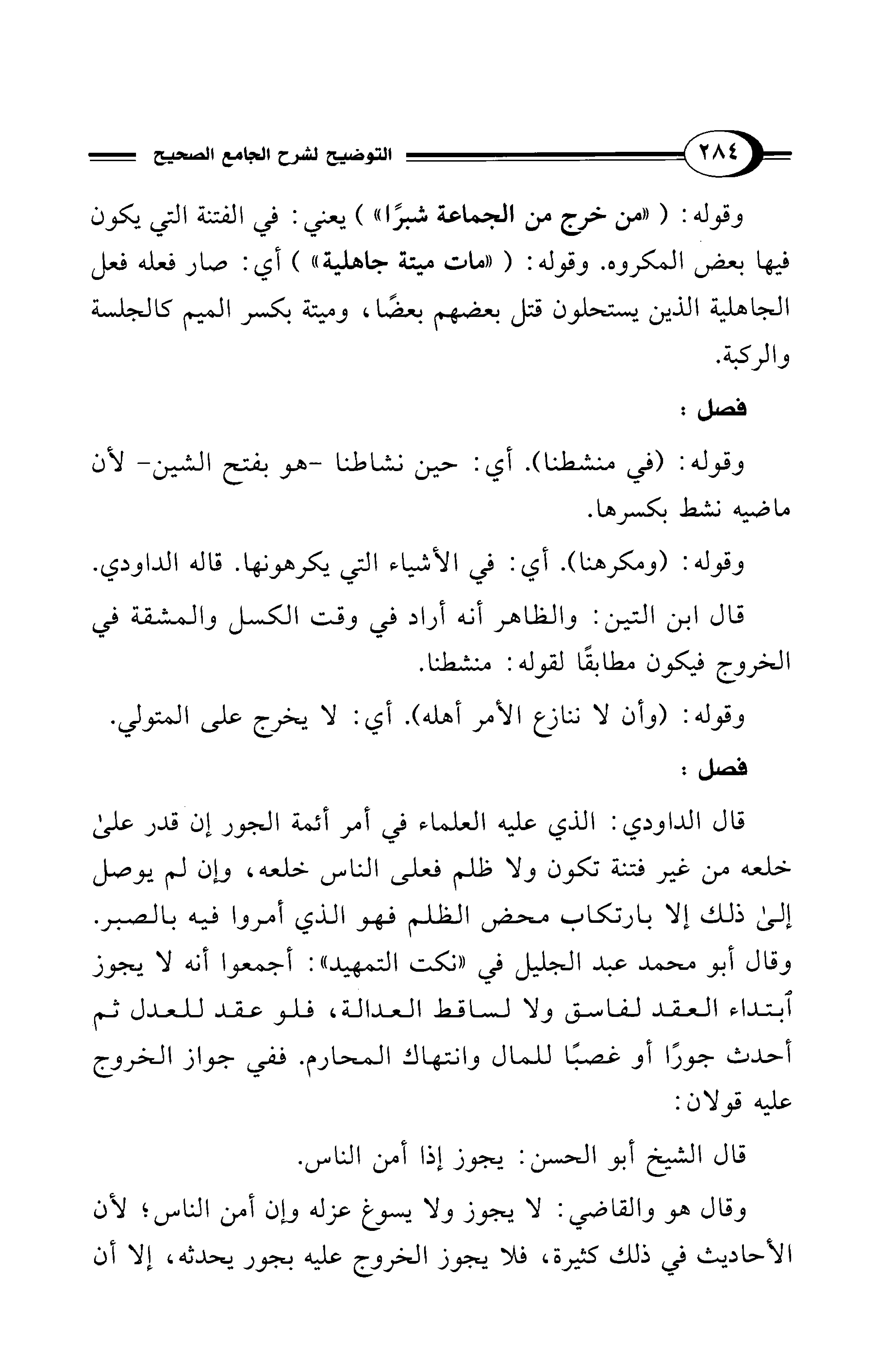 قال الداودي: الذي عليه العلماء في أمر أئمة الجور إن قدر على خلعه من غير فتنة تكون ولا ظلم فعلى الناس خلعه، وإن لم يوصل إلى ذلك إلا بارتكاب محض الظلم فهو الذي أمروا فيه بالصبر. وقال أبو محمد عبد الجليل في "نكت التمهيد": أجمعوا أنه لا يجوز ابتداء العقد لفاسق ولا لساقط العدالة، فلو عقد للعدل ثم أحدث جورًا أو غصبًا للمال وانتهاك المحارم. ففي جواز الخروج عليه قولان:
