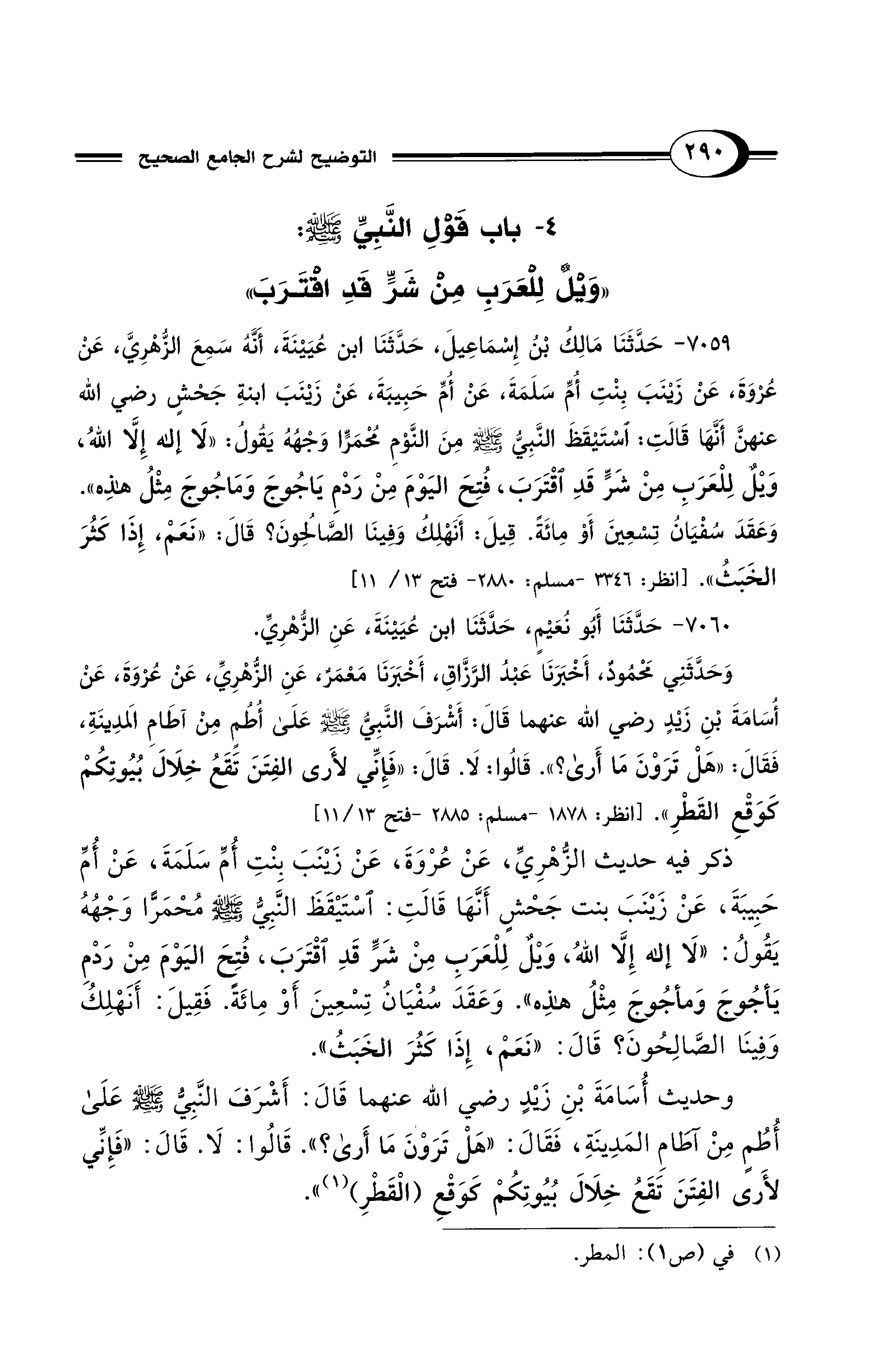 ذكر فيه حديث الزُّهْرِيِّ، عَنْ عُرْوَةَ، عَنْ زينَبَ بِنْتِ أمَ سَلَمَةَ، عَنْ أُمِّ حَبِيبَةَ، عَنْ زينَبَ بنت جَحْشٍ أَنَّهَا قَالَتِ: اسْتَيْقَظَ النَّبِيُّ - صلى الله عليه وسلم - مُحْمَرًّا وَجْهُهُ يَقُولُ: "لَا إله إِلَّا اللهُ، وَيْلٌ لِلْعَرَبِ مِنْ شَرٍّ قَدِ اقْتَرَبَ، فُتِّحَ اليَوْمَ مِنْ رَدْمِ يَأجُوجَ وَمأجُوجَ مِثْلُ هذِه". وَعَقَدَ سُفْيَانُ تِسْعِينَ أَوْ مِائَةً. فَقِيلَ: أَنَهْلِكُ وَفِينَا الصَّالِحُون؟ قَالَ: "نَعَمْ، إِذَا كَثُرَ الخَبَثُ".