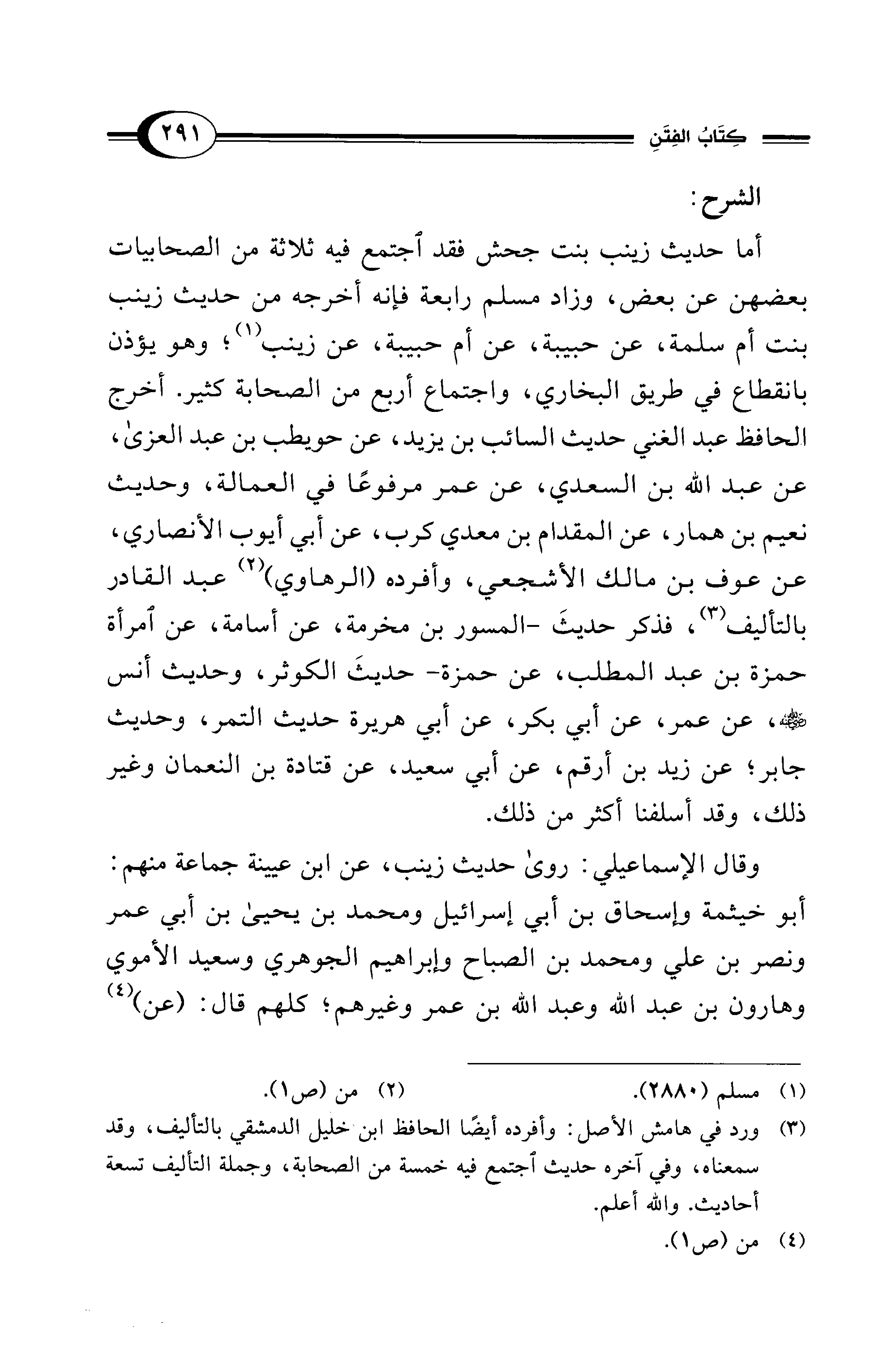 أما حديث زينب بنت جحش فقد اجتمع فيه ثلاثة من الصحابيات بعضهن عن بعض، وزاد مسلم رابعة فإنه أخرجه من حديث زينب بنت أم سلمة، عن حبيبة، عن أم حبيبة، عن زينب (¬1)؛ وهو يؤذن بانقطاع في طريق البخاري، واجتماع أربع من الصحابة كثير. أخرج الحافظ عبد الغني حديث السائب بن يزيد، عن حويطب بن عبد العزى، عن عبد الله بن السعدي، عن عمر مرفوعًا في العمالة، وحديث نعيم بن همار، عن المقدام بن معدي كرب، عن أبي أيوب الأنصاري، عن عوف بن مالك الأشجعي، وأفرده (الرهاوي) (¬2) عبد القادر بالتأليف (¬3)، فذكر حديثَ -المسور بن مخرمة، عن أسامة، عن امرأة حمزة بن عبد المطلب، عن حمزة- حديثَ الكوثر، وحديث أنس - رضي الله عنه -، عن عمر، عن أبي بكر، عن أبي هريرة حديث التمر، وحديث جابر؛ عن زيد بن أرقم، عن أبي سعيد، عن قتادة بن النعمان وغير ذلك، وقد أسلفنا أكثر من ذلك.