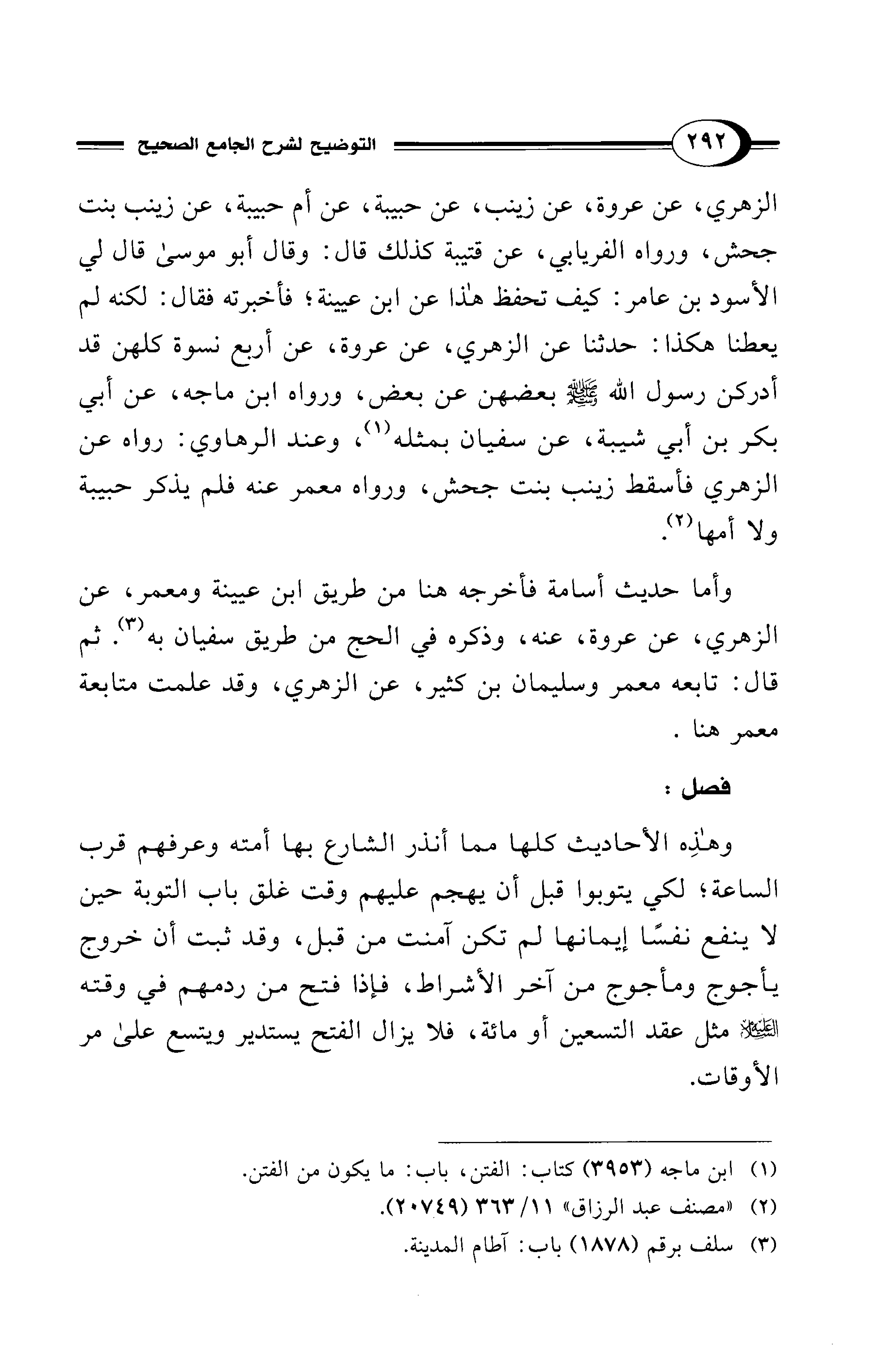 الزهري، عن عروة، عن زينب، عن حبيبة، عن أم حبيبة، عن زينب بنت جحش، ورواه الفريابي، عن قتيبة كذلك قال: وقال أبو موسى قال لي الأسود بن عامر: كيف تحفظ هذا عن ابن عيينة؛ فأخبرته فقال: لكنه لم يعطنا هكذا: حدثنا عن الزهري، عن عروة، عن أربع نسوة كلهن قد أدركن رسول الله - صلى الله عليه وسلم - بعضهن عن بعض، ورواه ابن ماجه، عن أبي بكر بن أبي شيبة، عن سفيان بمثله (¬1)، وعند الرهاوي: رواه عن الزهري فأسقط زينب بنت جحش، ورواه معمر عنه فلم يذكر حبيبة ولا أمها (¬2).