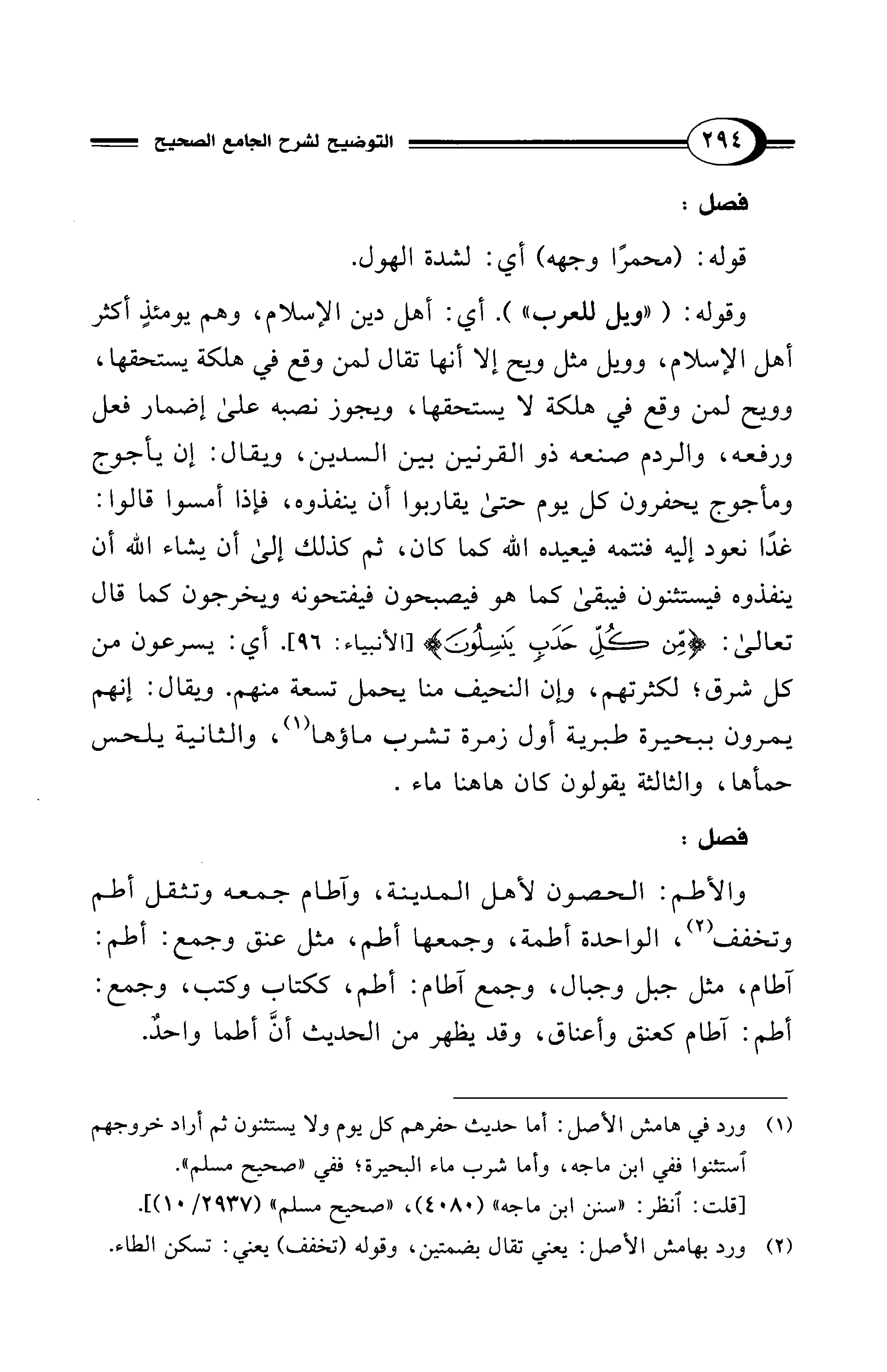 وقوله: ("ويل للعرب"). أي: أهل دين الإسلام، وهم يومئذٍ أكثر أهل الإسلام، وويل مثل ويح إلا أنها تقال لمن وقع في هلكة يستحقها، وويح لمن وقع في هلكة لا يستحقها، ويجوز نصبه على إضمار فعل ورفعه، والردم صنعه ذو القرنين بين السدين، ويقال: إن يأجوج ومأجوج يحفرون كل يوم حتى يقاربوا أن ينفذوه، فإذا أمسوا قالوا: غدًا نعود إليه فنتمه فيعيده الله كما كان، ثم كذلك إلى أن يشاء الله أن ينفذوه فيستثنون فيبقى كما هو فيصبحون فيفتحونه ويخرجون كما قال تعالى: {مِنْ كُلِّ حَدَبٍ يَنْسِلُونَ} [الأنبياء: 96]. أي: يسرعون من كل شرق؛ لكثرتهم، وإن النحيف منا يحمل تسعة منهم. ويقال: إنهم يمرون ببحيرة طبرية أول زمرة تشرب ماؤها (¬1)، والثانية يلحس حمأها، والثالثة يقولون كان هاهنا ماء.