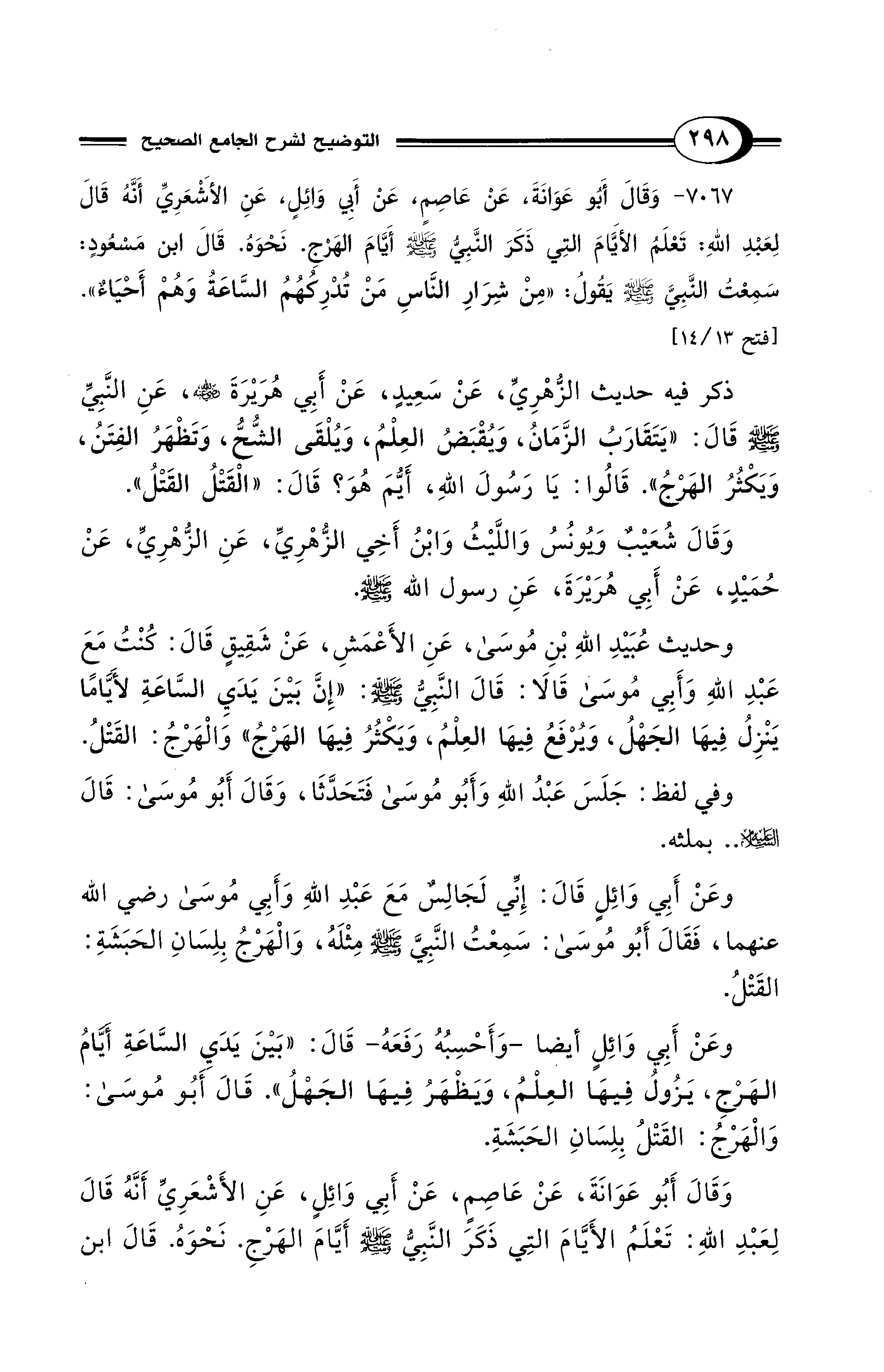 7067 - وَقَالَ أَبُو عَوَانَة، عَنْ عَاصِمٍ، عَنْ أَبِي وَائِلٍ، عَنِ الأَشْعَرِيِّ أَنَّهُ قَالَ لِعَبْدِ اللهِ: تَعْلَمُ الأَيَّامَ الَّتِي ذَكَرَ النَّبِيُّ - صلى الله عليه وسلم - أَيَّامَ الْهَرْجِ. نَحْوَهُ. قَالَ ابْنُ مَسْعُودٍ: سَمِعْتُ النَّبِيَّ - صلى الله عليه وسلم - يَقُولُ: «مِنْ شِرَارِ النَّاسِ مَنْ تُدْرِكُهُمُ السَّاعَةُ وَهُمْ أَحْيَاءٌ». [فتح 13/ 14]