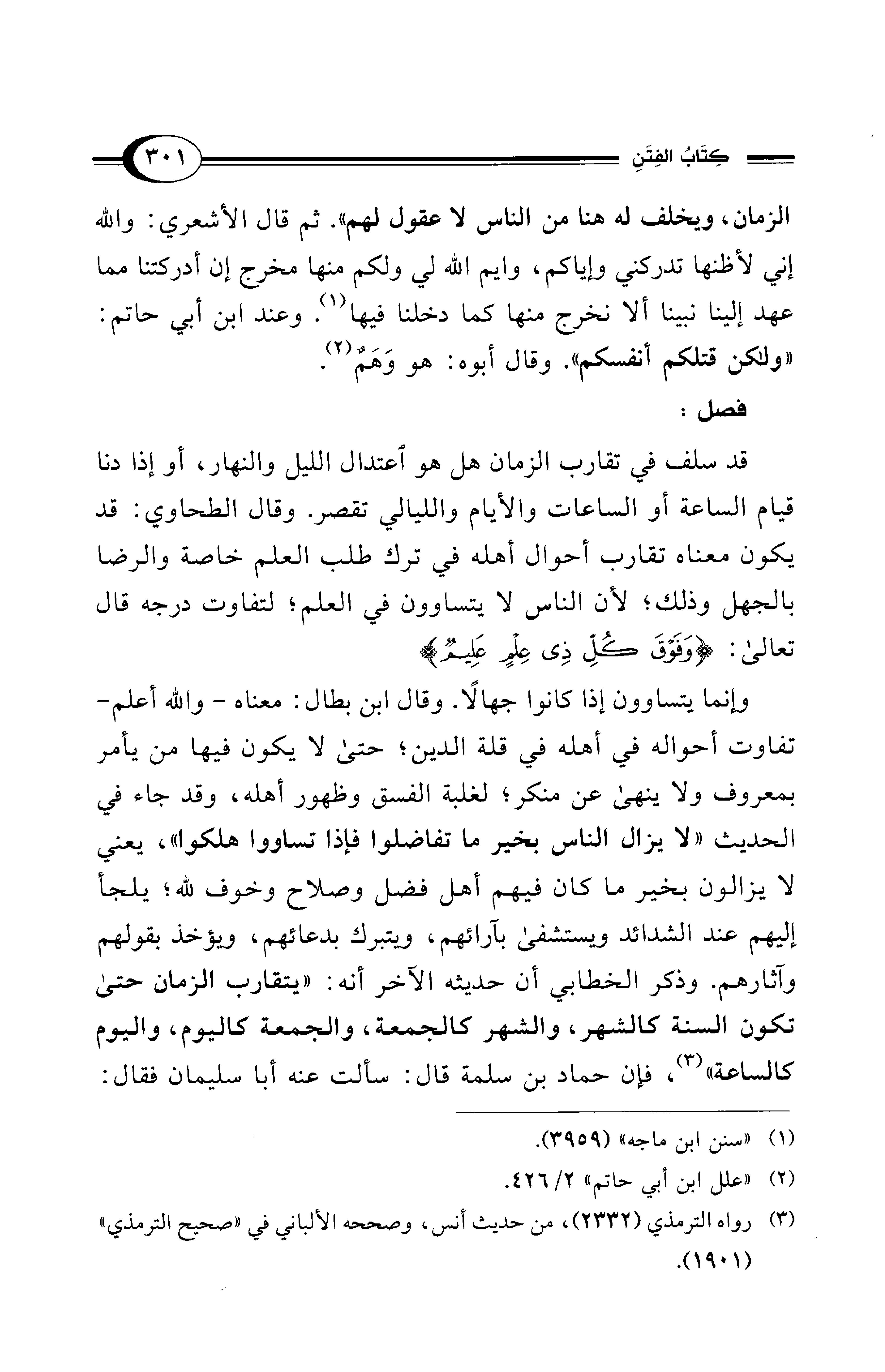 وإنما يتساوون إذا كانوا جهالًا. وقال ابن بطال: معناه -والله أعلم- تفاوت أحواله في أهله في قلة الدين؛ حتى لا يكون فيها من يأمر بمعروف ولا ينهى عن منكر؛ لغلبة الفسق وظهور أهله، وقد جاء في الحديث" لا يزال الناس بخير ما تفاضلوا فإذا تساووا هلكوا"، يعني لا يزالون بخير ما كان فيهم أهل فضل وصلاح وخوف لله؛ يلجأ إليهم عند الشدائد ويستشفى بآرائهم، ويتبرك بدعائهم، ويؤخذ بقولهم وآثارهم. وذكر الخطابي أن حديثه الآخر أنه: "يتقارب الزمان حتى تكون السنة كالشهر، والشهر كالجمعة، والجمعة كاليوم، واليوم كالساعة" (¬3)، فان حماد بن سلمة قال: سألت عنه أبا سليمان فقال: