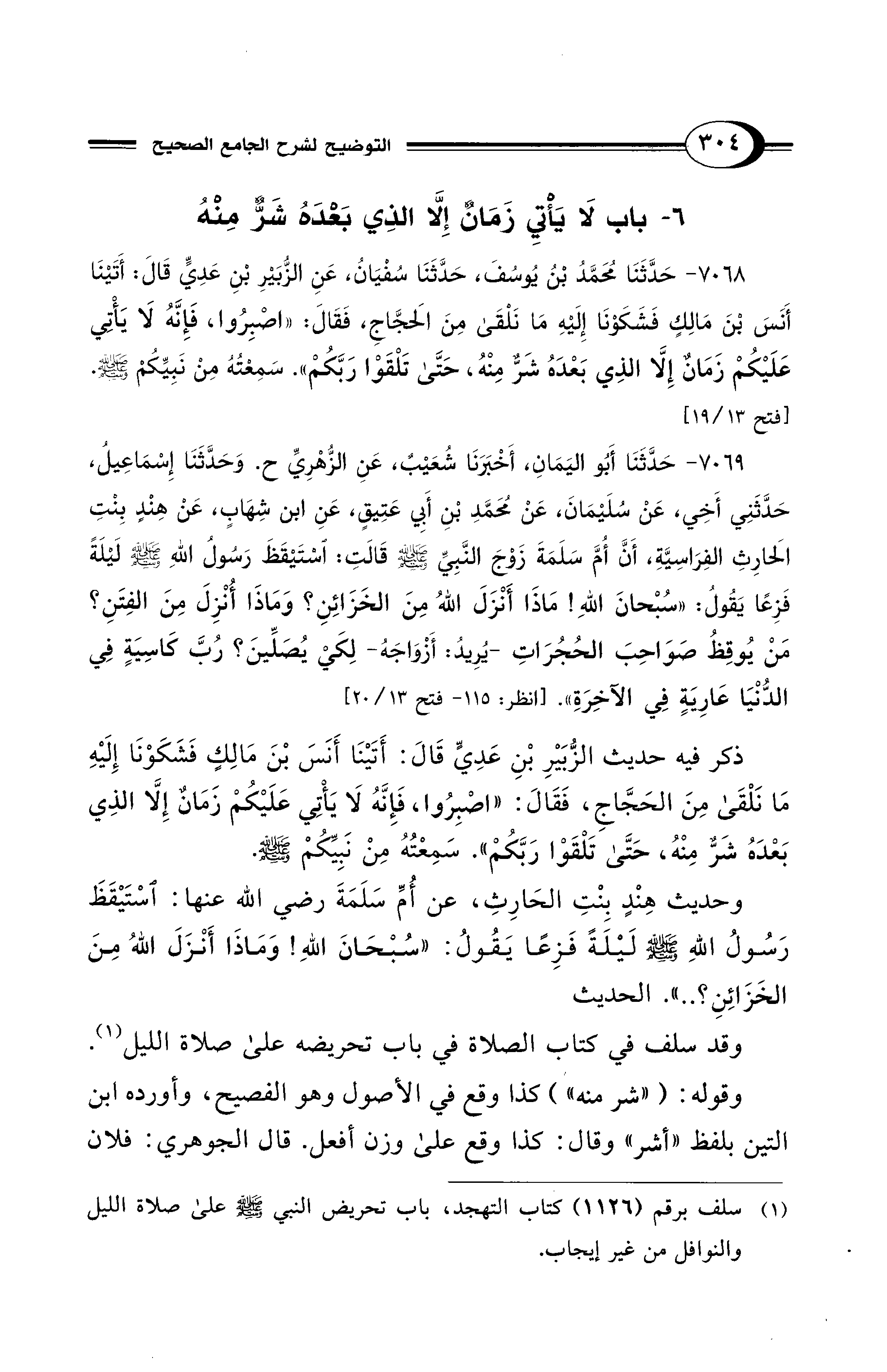 7069 - حَدَّثَنَا أَبُو اليَمَانِ، أَخْبَرَنَا شُعَيْبٌ، عَنِ الزُّهْرِيِّ ح. وَحَدَّثَنَا إِسْمَاعِيلُ، حَدَّثَنِي أَخِي، عَنْ سُلَيْمَانَ، عَنْ مُحَمَّدِ بْنِ أَبِي عَتِيقٍ، عَنِ ابْنِ شِهَابٍ، عَنْ هِنْدٍ بِنْتِ الحَارِثِ الفِرَاسِيَّةِ، أَنَّ أُمَّ سَلَمَةَ زَوْجَ النَّبِيِّ - صلى الله عليه وسلم - قَالَتِ: اسْتَيْقَظَ رَسُولُ اللهِ - صلى الله عليه وسلم - لَيْلَةً فَزِعًا يَقُولُ: «سُبْحَانَ اللهِ! مَاذَا أَنْزَلَ اللهُ مِنَ الخَزَائِنِ؟ وَمَاذَا أُنْزِلَ مِنَ الفِتَنِ؟ مَنْ يُوقِظُ صَوَاحِبَ الْحُجُرَاتِ -يُرِيدُ: أَزْوَاجَهُ- لِكَىْ يُصَلِّينَ؟ رُبَّ كَاسِيَةٍ فِي الدُّنْيَا عَارِيَةٍ فِي الآخِرَةِ». [انظر: 115 - فتح 13/ 20]
