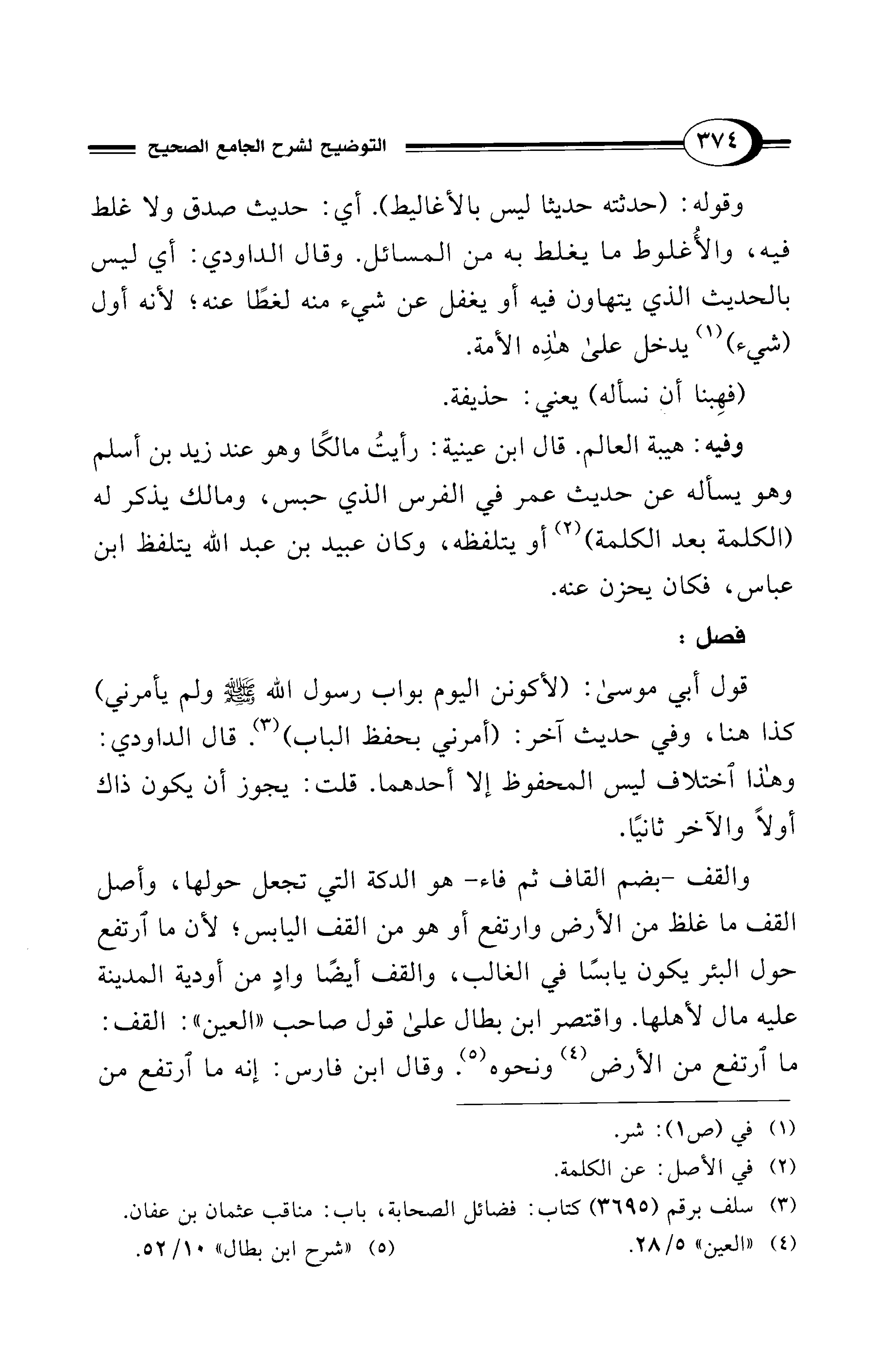 والقف -بضم القاف ثم فاء- هو الدكة التي تجعل حولها، وأصل القف ما غلظ من الأرض وارتفع أو هو من القف اليابس؛ لأن ما ارتفع حول البئر يكون يابسًا في الغالب، والقف أيضًا وادٍ من أودية المدينة عليه مال لأهلها. واقتصر ابن بطال على قول صاحب "العين": القف: ما ارتفع من الأرض (¬4) ونحوه (¬5). وقال ابن فارس: إنه ما ارتفع من