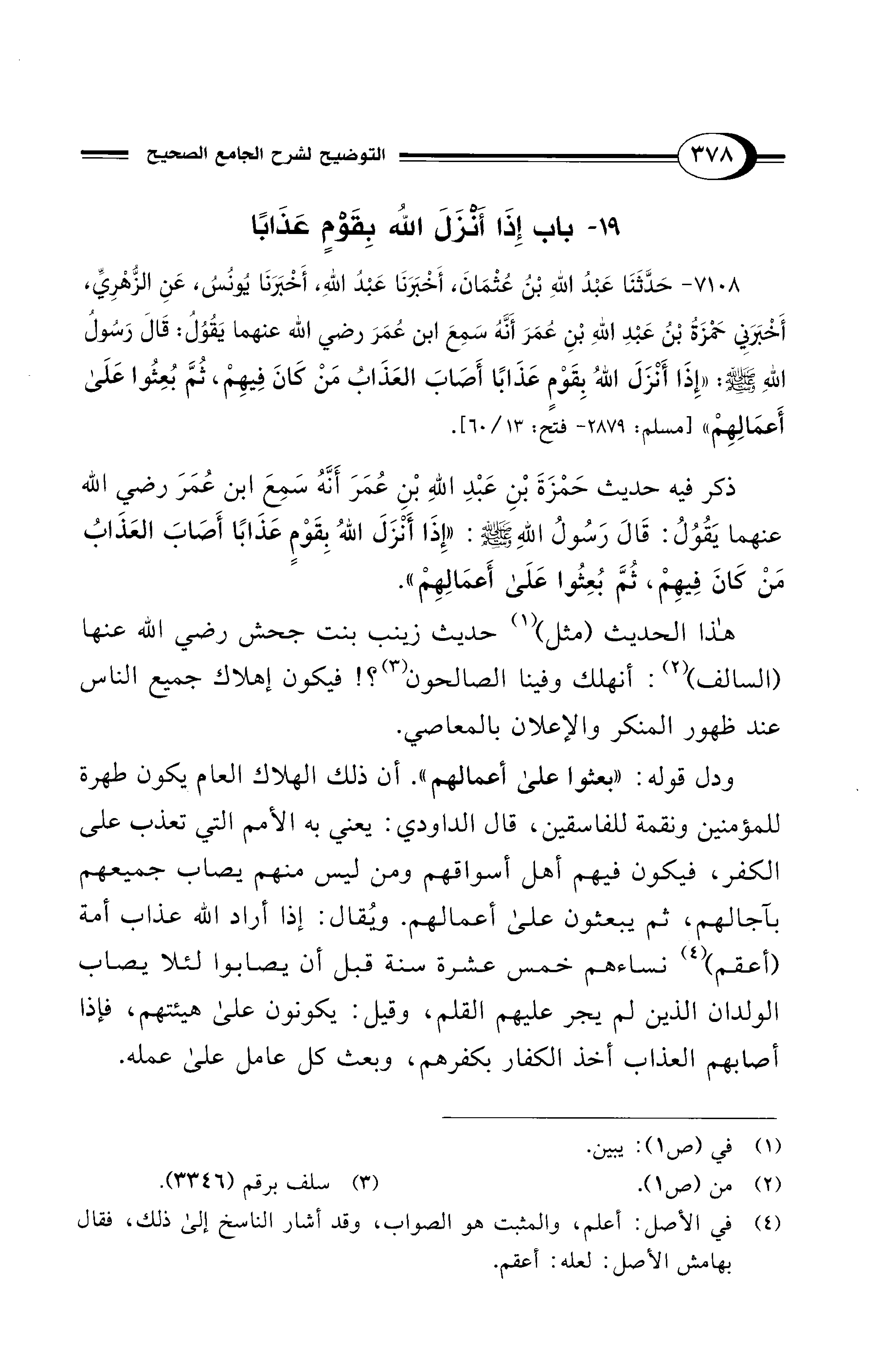 7108 - حَدَّثَنَا عَبْدُ اللهِ بْنُ عُثْمَانَ، أَخْبَرَنَا عَبْدُ اللهِ، أَخْبَرَنَا يُونُسُ، عَنِ الزُّهْرِيِّ، أَخْبَرَنِي حَمْزَةُ بْنُ عَبْدِ اللهِ بْنِ عُمَرَ أَنَّهُ سَمِعَ ابْنَ عُمَرَ - رضي الله عنهما - يَقُولُ: قَالَ رَسُولُ اللهِ - صلى الله عليه وسلم -: «إِذَا أَنْزَلَ اللهُ بِقَوْمٍ عَذَابًا أَصَابَ الْعَذَابُ مَنْ كَانَ فِيهِمْ، ثُمَّ بُعِثُوا عَلَى أَعْمَالِهِمْ». [مسلم: 2879 - فتح: 13/ 60].