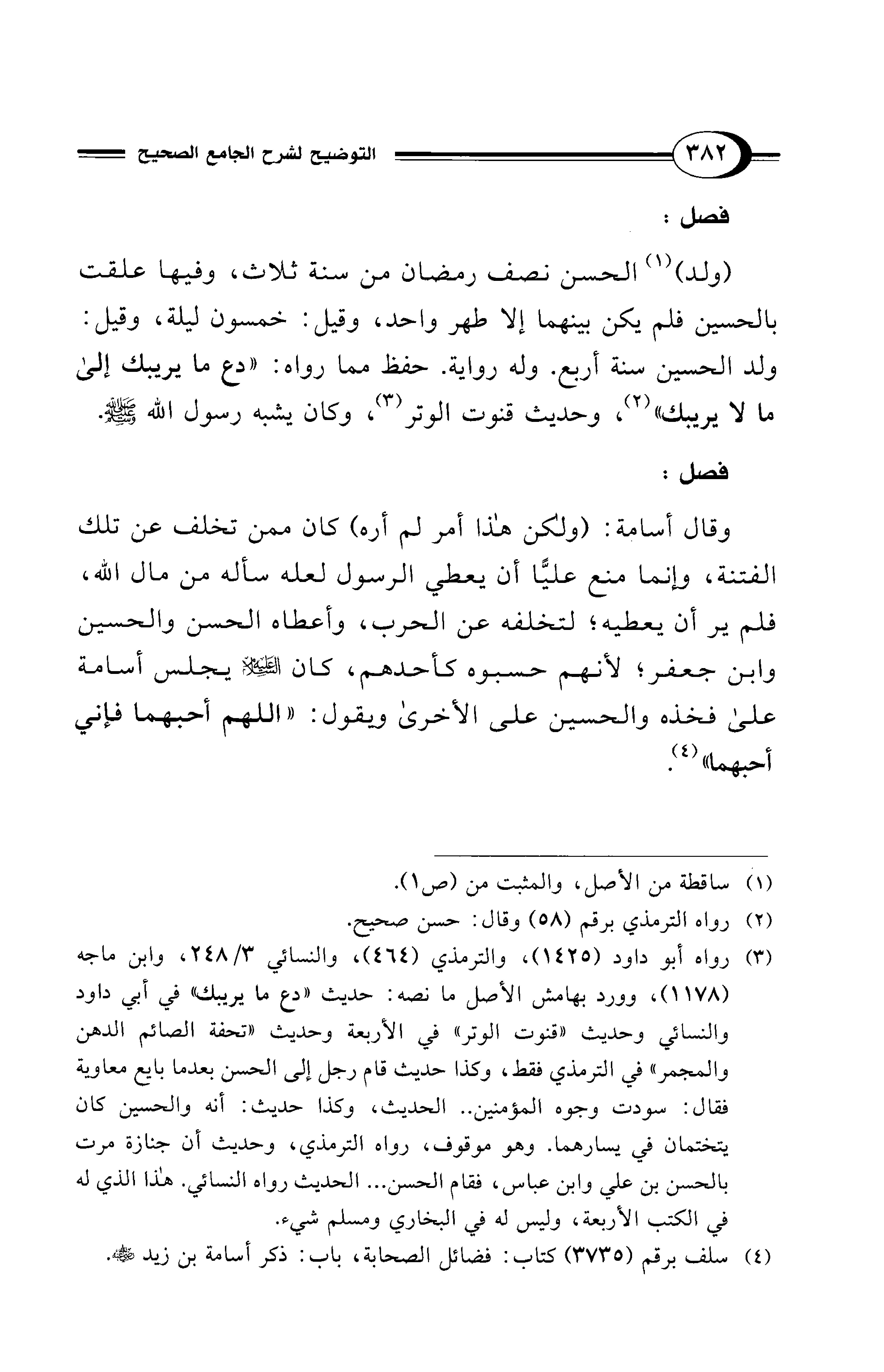 (¬3) رواه أبو داود (1425)، والترمذي (464)، والنسائي 3/ 248، وابن ماجه (1178)، وورد بهامش الأصل ما نصه: حديث "دع ما يريبك" في أبي داود والنسائي وحديث "قنوت الوتر" في الأربعة وحديث "تحفة الصائم الدهن والمجمر" في الترمذي فقط، وكذا حديث قام رجل إلى الحسن بعد ما بايع معاوية فقال: سودت وجوه المؤمنين .. الحديث، وكذا حديث: أنه والحسين كان يتختمان في يسارهما. وهو موقوف، رواه الترمذي، وحديث أن جنازة مرت بالحسن بن علي وابن عباس، فقام الحسن ... الحديث رواه النسائي. هذا الذي له في الكتب الأربعة، وليس له في البخاري ومسلم شيء.