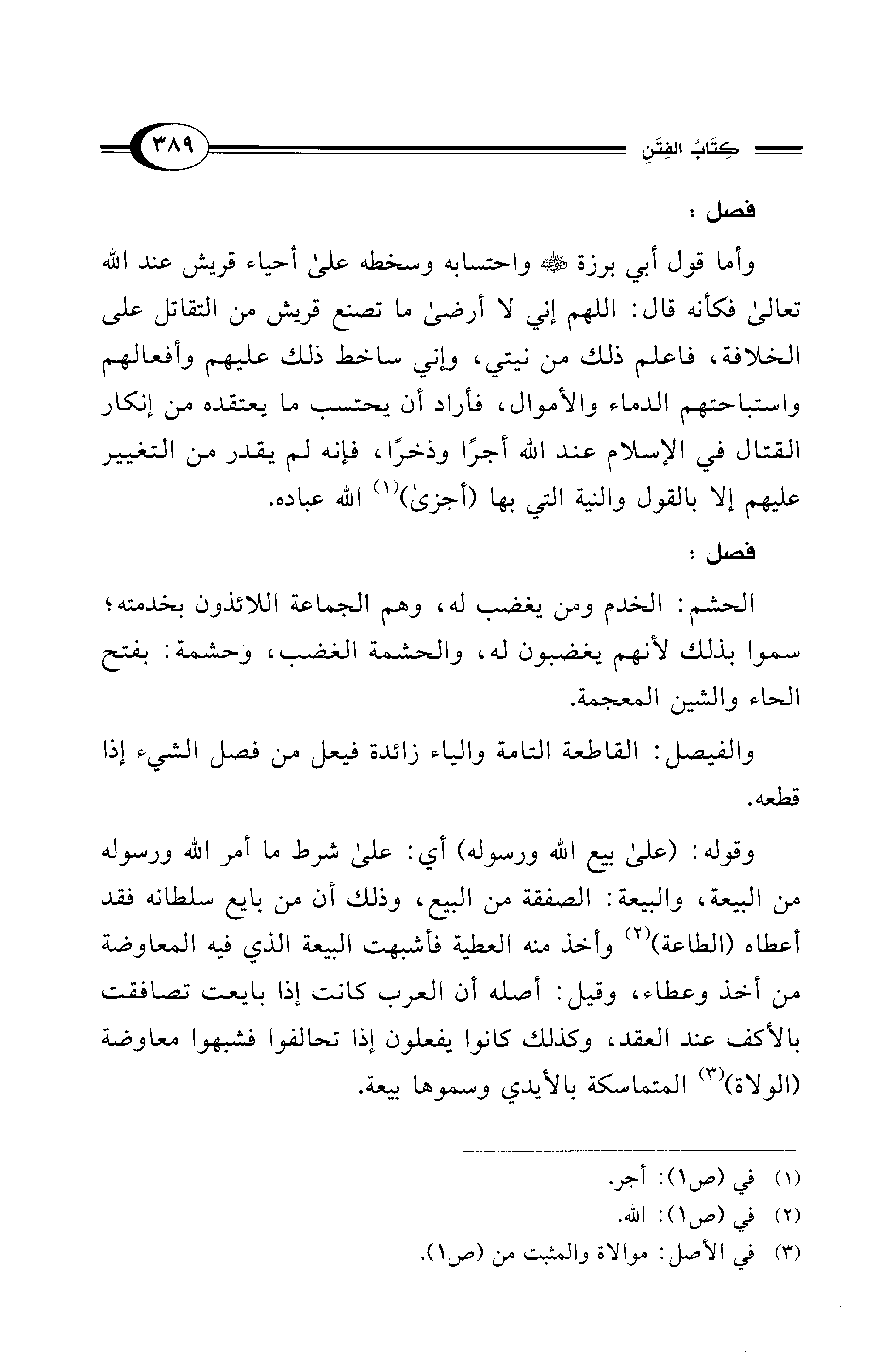 وأما قول أبي برزة - رضي الله عنه - واحتسابه وسخطه على أحياء قريش عند الله تعالى فكأنه قال: اللهم إني لا أرضى ما تصنع قريش من التقاتل على الخلافة، فاعلم ذلك من نيتي، وإني ساخط ذلك عليهم وأفعالهم واستباحتهم الدماء والأموال، فأراد أن يحتسب ما يعتقده من إنكار القتال في الإسلام عند الله أجرًا وذخرًا، فإنه لم يقدر من التغيير عليهم إلا بالقول والنية التي بها (أجزى) (¬1) الله عباده.