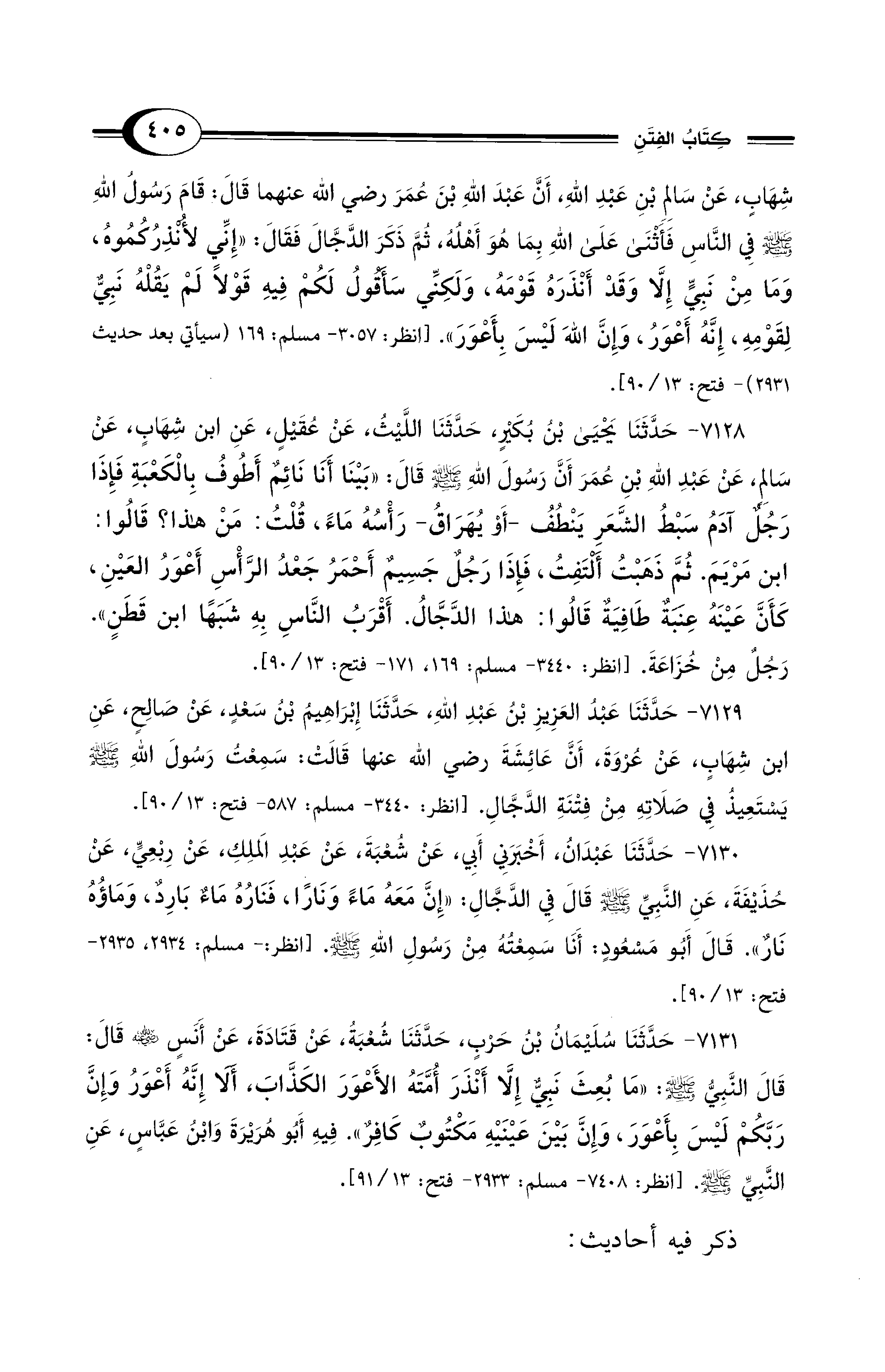 شِهَابٍ، عَنْ سَالِمِ بْنِ عَبْدِ اللهِ، أَنَّ عَبْدَ اللهِ بْنَ عُمَرَ - رضي الله عنهما - قَالَ: قَامَ رَسُولُ اللهِ - صلى الله عليه وسلم - فِي النَّاسِ فَأَثْنَى عَلَى اللهِ بِمَا هُوَ أَهْلُهُ، ثُمَّ ذَكَرَ الدَّجَّالَ فَقَالَ: «إِنِّي لأُنْذِرُكُمُوهُ، وَمَا مِنْ نَبِيٍّ إِلاَّ وَقَدْ أَنْذَرَهُ قَوْمَهُ، وَلَكِنِّي سَأَقُولُ لَكُمْ فِيهِ قَوْلاً لَمْ يَقُلْهُ نَبِيٌّ لِقَوْمِهِ، إِنَّهُ أَعْوَرُ، وَإِنَّ اللهَ لَيْسَ بِأَعْوَرَ». [انظر: 3057 - مسلم: 169 (سيأتي بعد حديث 2931) - فتح: 13/ 90].