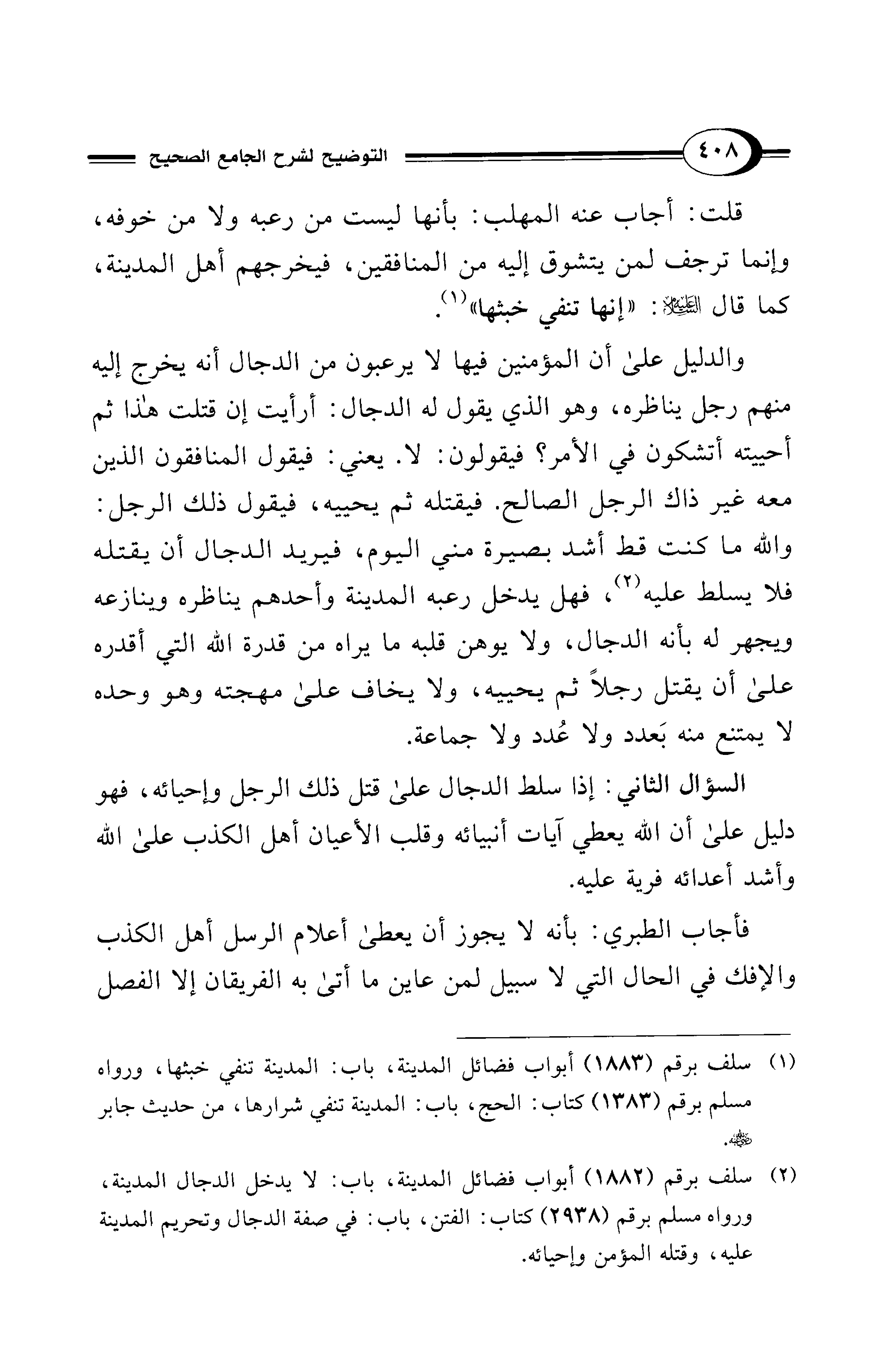 والدليل على أن المؤمنين فيها لا يرعبون من الدجال أنه يخرج إليه منهم رجل يناظره، وهو الذي يقول له الدجال: أرأيت إن قتلت هذا ثم أحييته أتشكون في الأمر؟ فيقولون: لا. يعني: فيقول المنافقون الذين معه غير ذاك الرجل الصالح. فيقتله ثم يحييه، فيقول ذلك الرجل: والله ما كنت قط أشد بصيرة مني اليوم، فيريد الدجال أن يقتله فلا يسلط عليه (¬2)، فهل يدخل رعبه المدينة وأحدهم يناظره وينازعه ويجهر له بأنه الدجال، ولا يوهن قلبه ما يراه من قدرة الله التي أقدره على أن يقتل رجلاً ثم يحييه، ولا يخاف على مهجته وهو وحده لا يمتنع منه بَعدد ولا عُدد ولا جماعة.