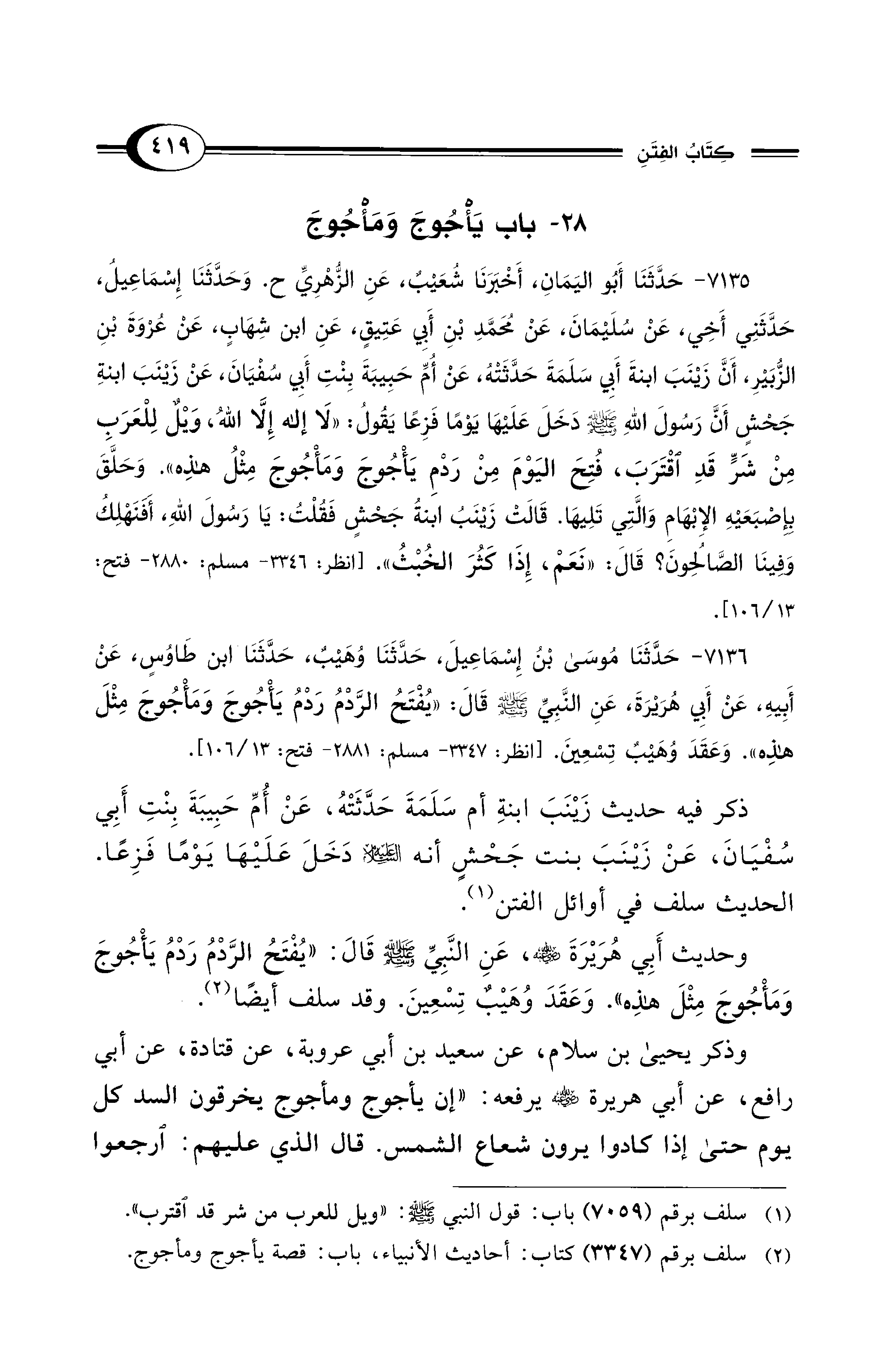 7135 - حَدَّثَنَا أَبُو الْيَمَانِ، أَخْبَرَنَا شُعَيْبٌ، عَنِ الزُّهْرِيِّ ح. وَحَدَّثَنَا إِسْمَاعِيلُ، حَدَّثَنِي أَخِي، عَنْ سُلَيْمَانَ، عَنْ مُحَمَّدِ بْنِ أَبِي عَتِيقٍ، عَنِ ابْنِ شِهَابٍ، عَنْ عُرْوَةَ بْنِ الزُّبَيْرِ، أَنَّ زَيْنَبَ ابْنَةَ أَبِي سَلَمَةَ حَدَّثَتْهُ، عَنْ أُمِّ حَبِيبَةَ بِنْتِ أَبِي سُفْيَانَ، عَنْ زَيْنَبَ ابْنَةِ جَحْشٍ أَنَّ رَسُولَ اللهِ - صلى الله عليه وسلم - دَخَلَ عَلَيْهَا يَوْمًا فَزِعًا يَقُولُ: «لاَ إِلَهَ إِلاَّ اللهُ، وَيْلٌ لِلْعَرَبِ مِنْ شَرٍّ قَدِ اقْتَرَبَ، فُتِحَ الْيَوْمَ مِنْ رَدْمِ يَأْجُوجَ وَمَأْجُوجَ مِثْلُ هَذِهِ». وَحَلَّقَ بِإِصْبَعَيْهِ الإِبْهَامِ وَالَّتِى تَلِيهَا. قَالَتْ زَيْنَبُ ابْنَةُ جَحْشٍ فَقُلْتُ: يَا رَسُولَ اللهِ، أَفَنَهْلِكُ وَفِينَا الصَّالِحُونَ؟ قَالَ: «نَعَمْ إِذَا كَثُرَ الْخُبْثُ». [انظر: 3346 - مسلم: 2880 - فتح: 13/ 106].